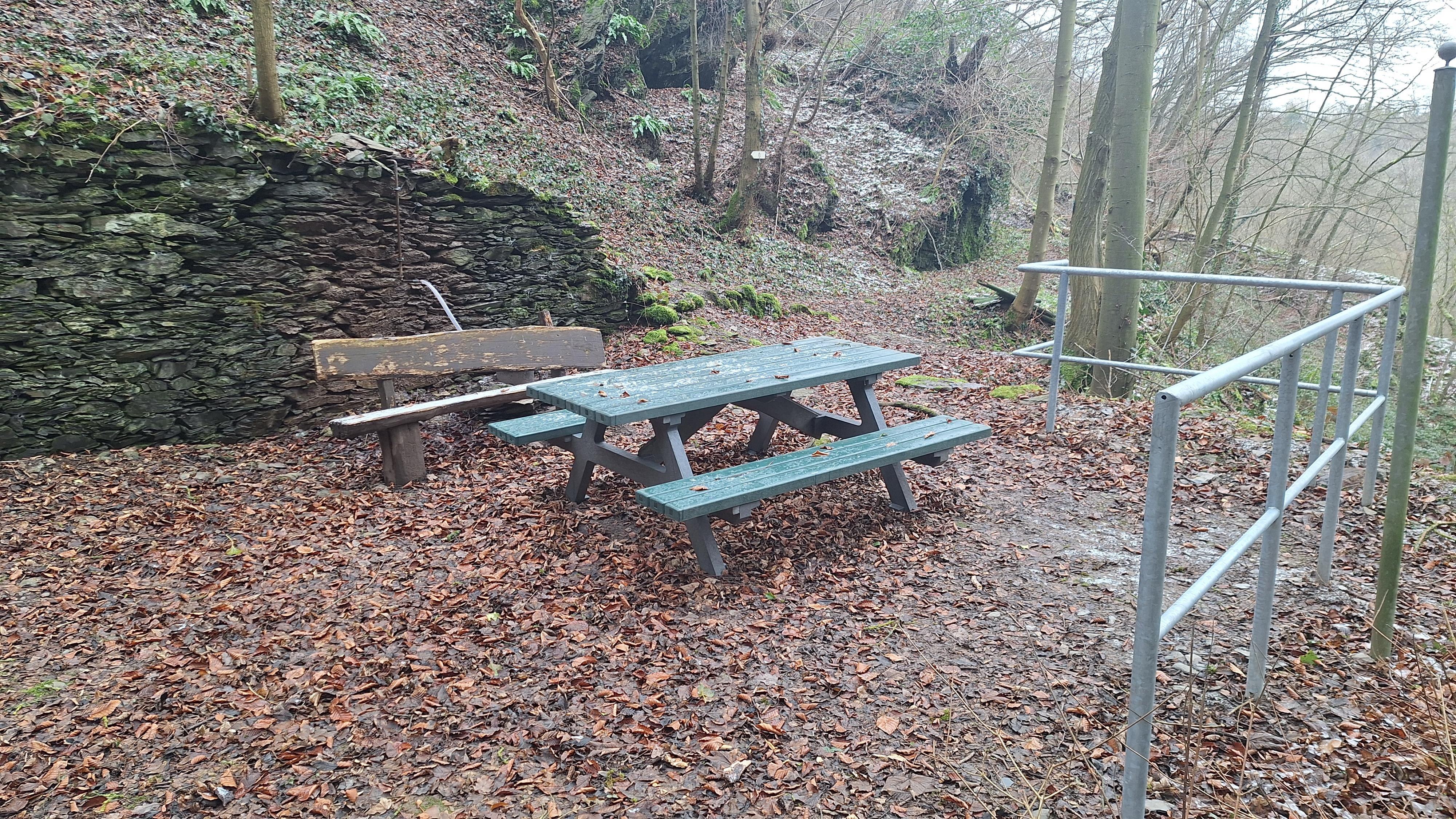 Alte Mühlenruine am Wanderweg Traumschleifchen "Werlauer-Pilz" im Heimbachtal mit Picknickbank.