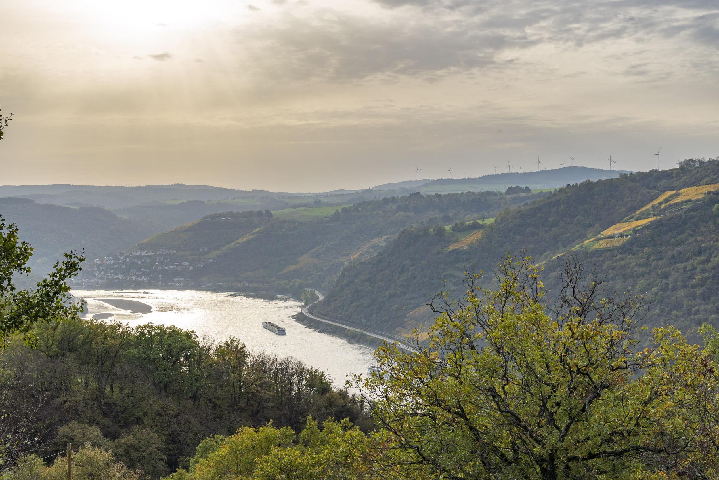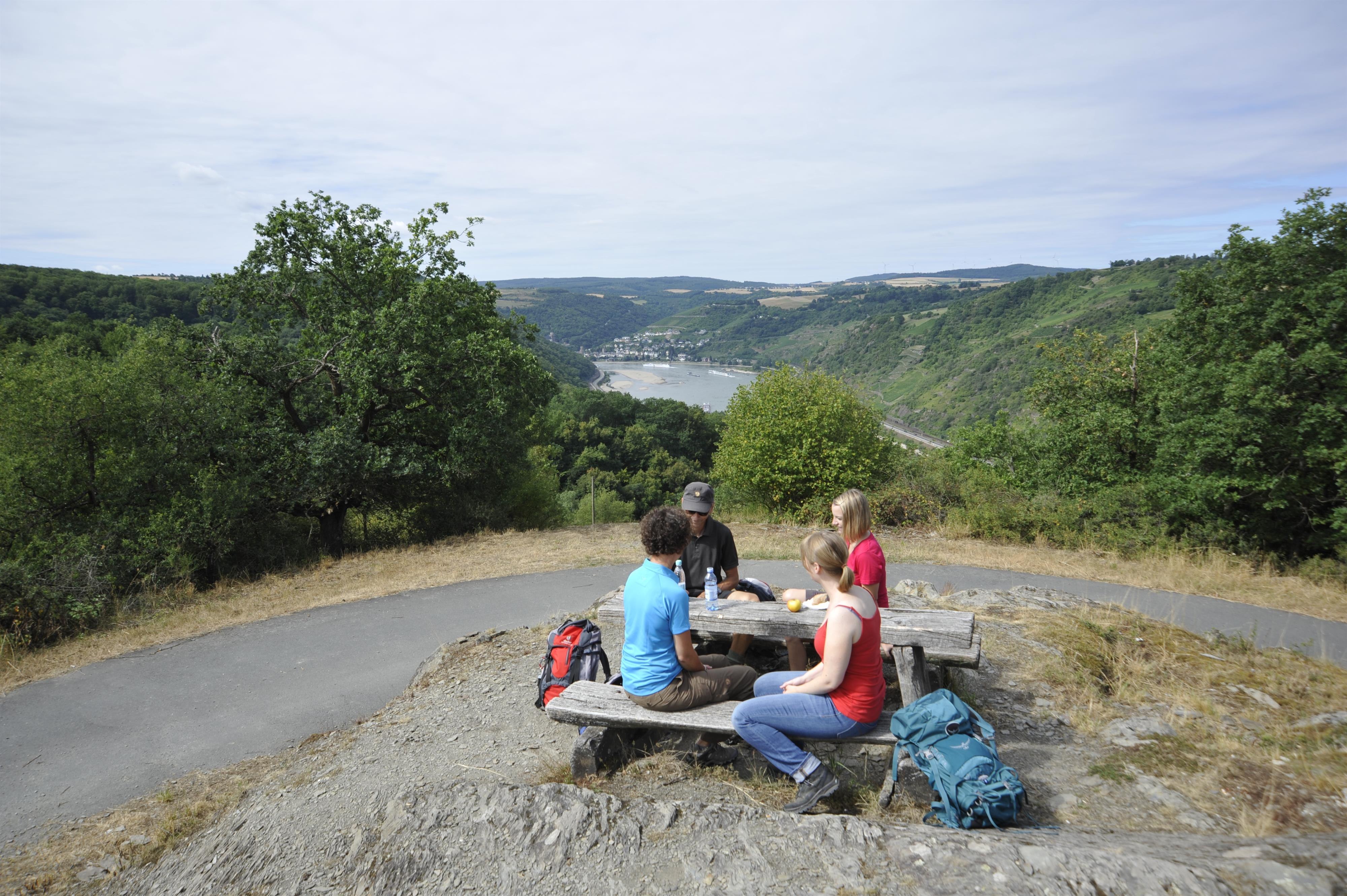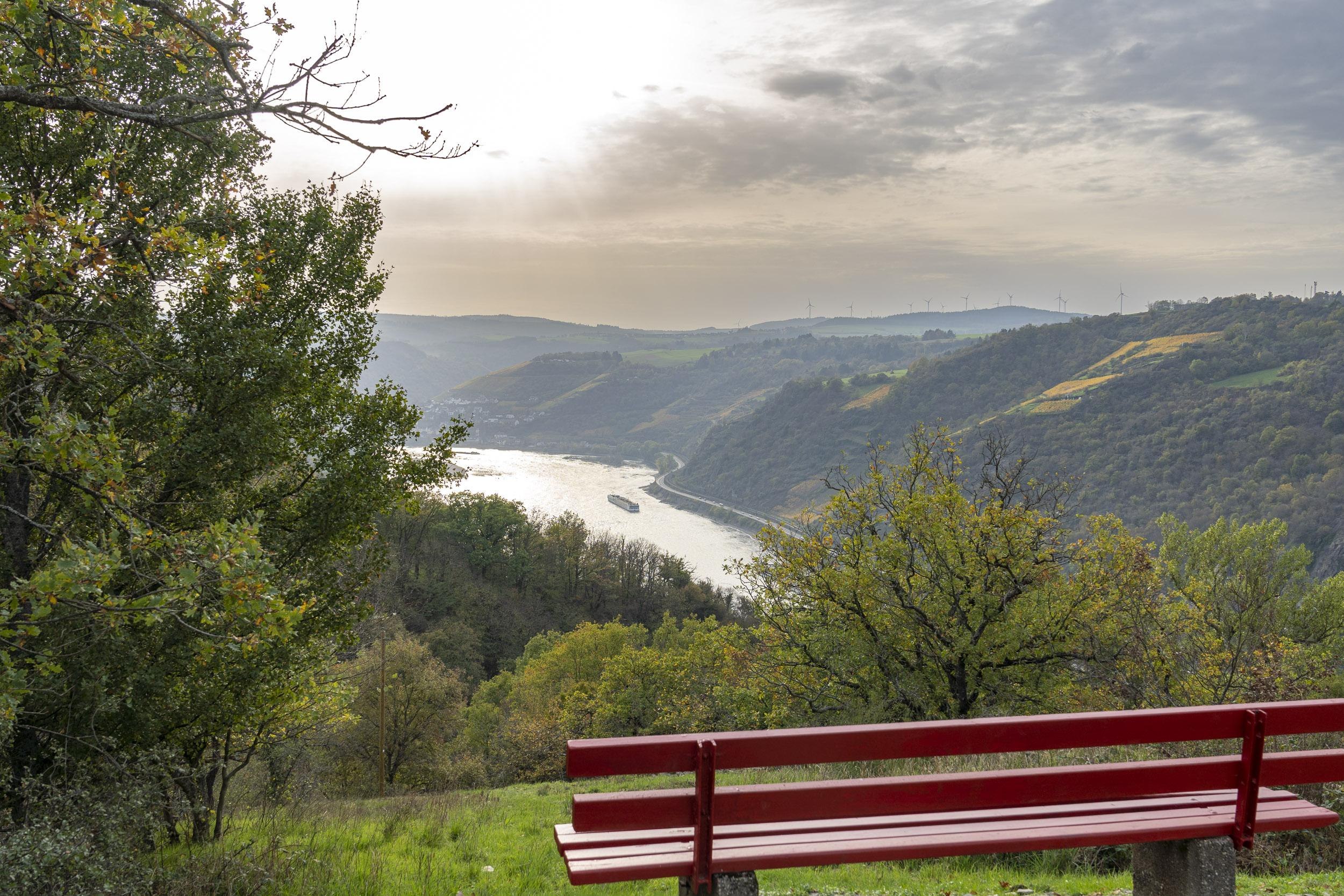 An der Stelle, wo die Asphaltstraße einen Richtungswechsel vollzieht, liegt der Aussichtspunkt Rheintal. Hier bietet sich ein tolle Blick über das weite Tal des Rheins. Direkt an der Hangkante oberhalb des Rheinflusses steht eine einladende Bank.