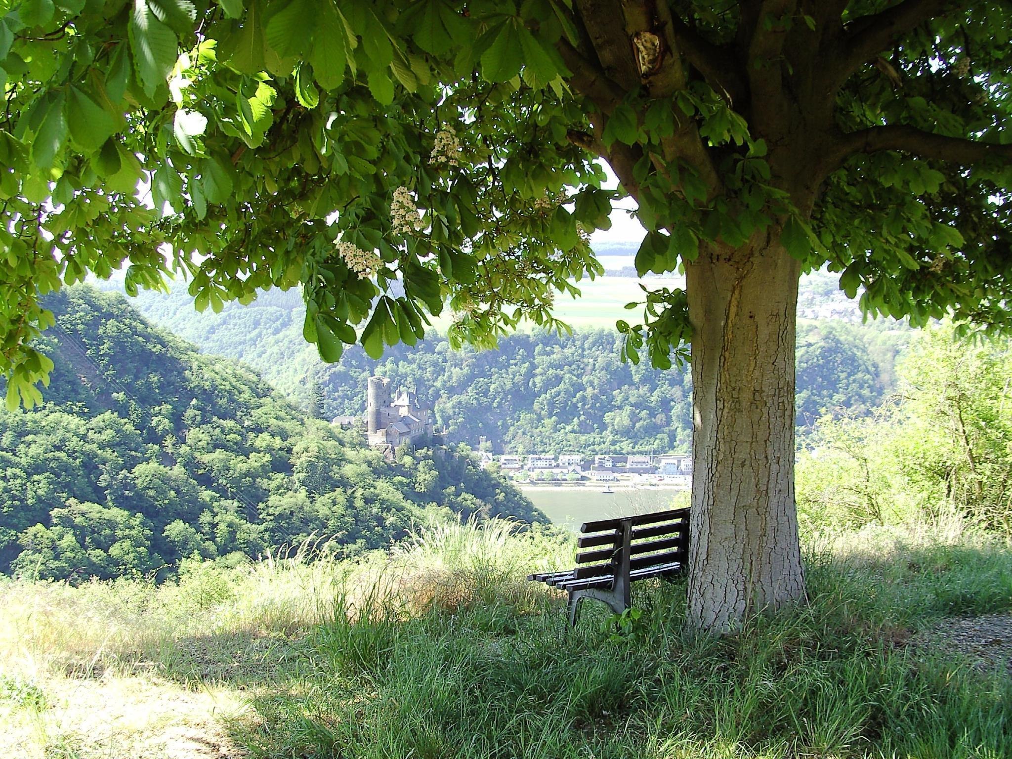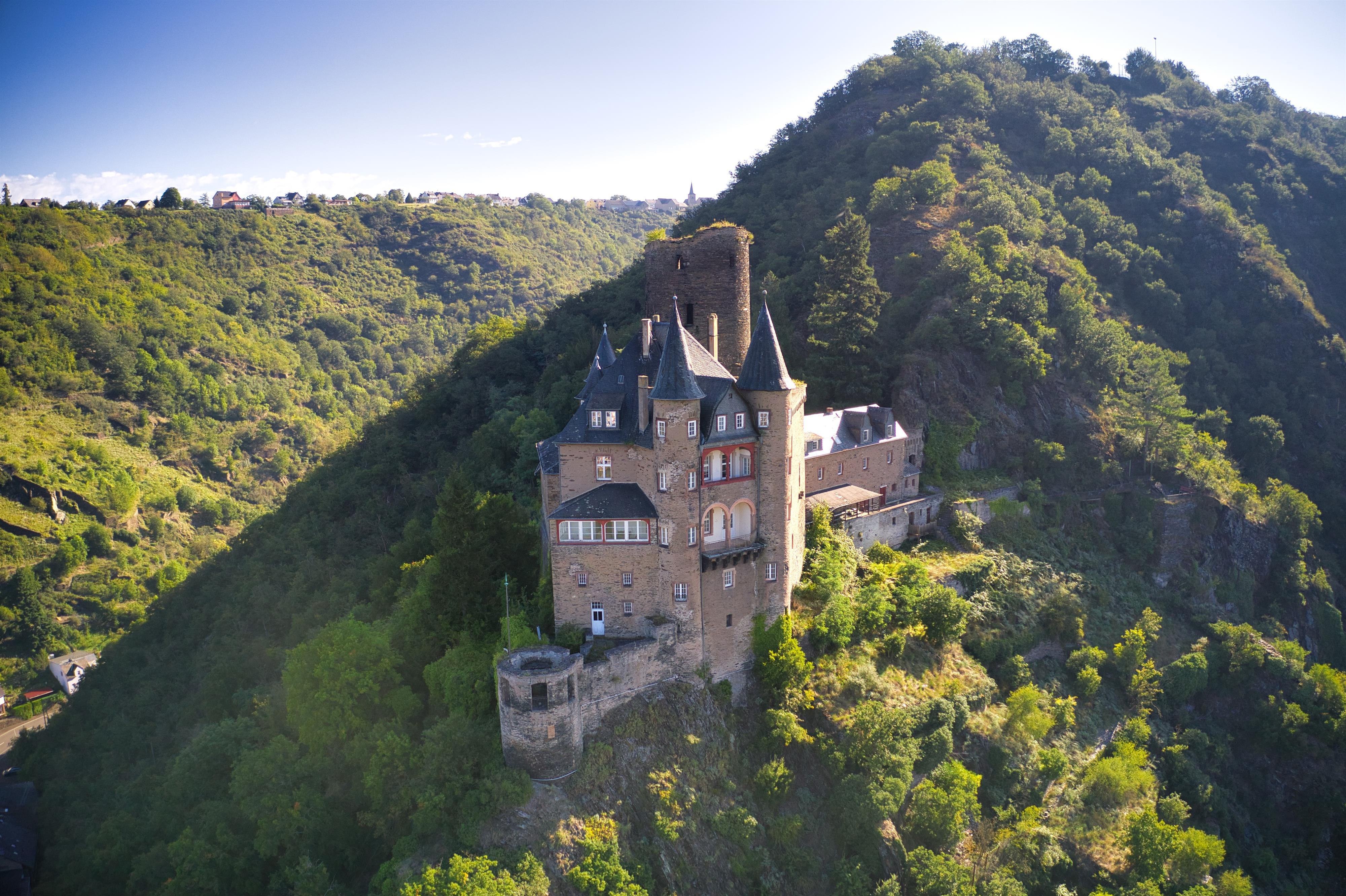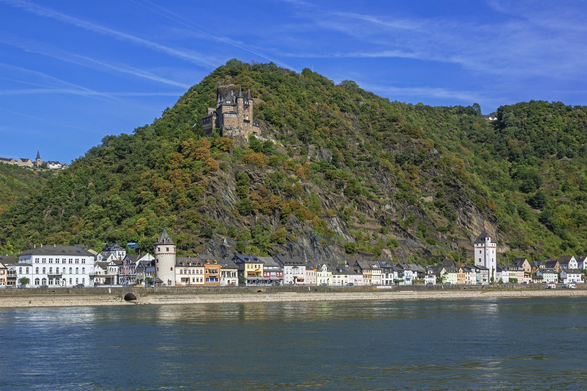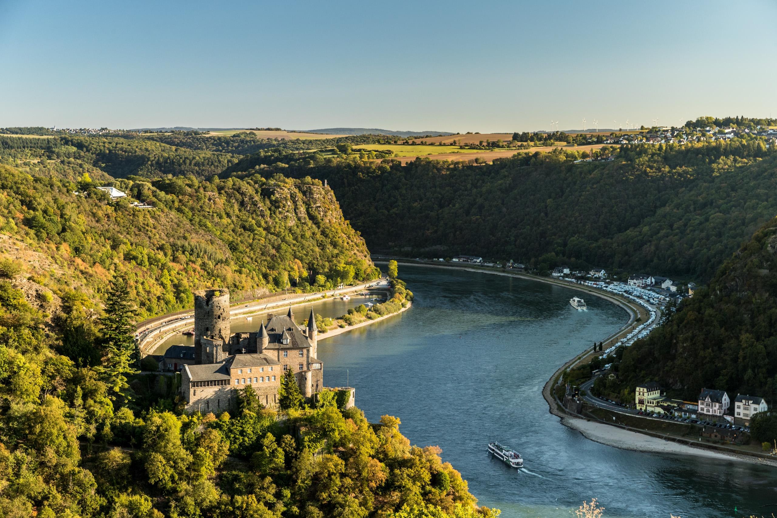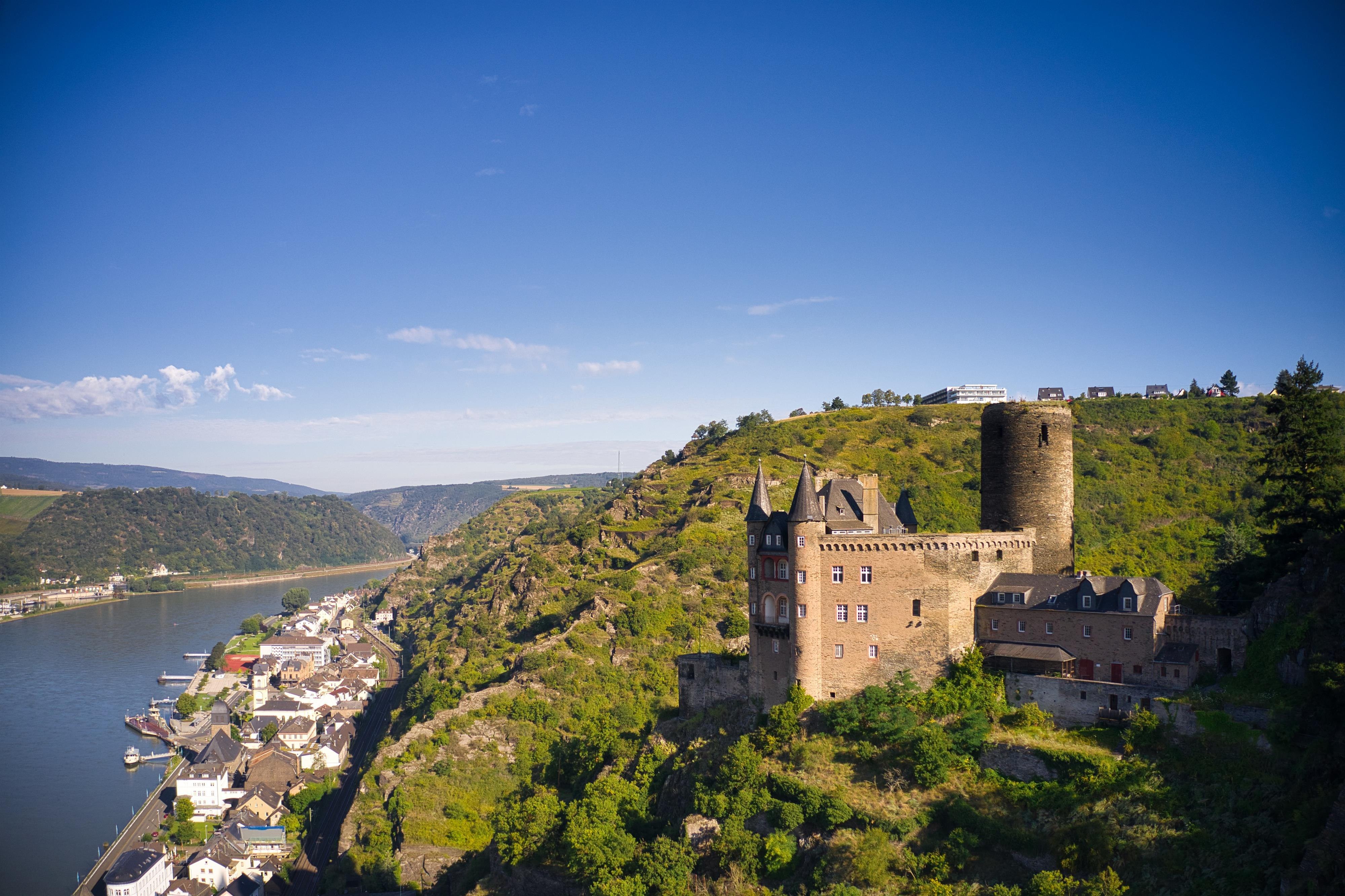 Die Bezeichnung „Katz“ hat der Burg in St. Goarshausen der Volksmund eingetragen, die 1371 eigentlich als Burg Neu-Katzenelnbogen entstanden war. Mit ihr wollten die Grafen von Katzenelnbogen ihre Besitzungen am Rhein und insbesondere die Zollstelle im gegenüberliegenden St. Goar schützen - sowie gleichermaßen bewusst ein Gegengewicht zur kurtrierer Burg „Maus“ setzen, welche ihre Zollabfertigung bedrohte. Wie viele Rheinburgen vermag sie den französischen Truppen schlussendlich nicht zu wiederstehen, die Burg wird 1806 zerstört. Es dauert fast ein Jahrhundert, ehe ein historisierender Wiederaufbau 1898 bis 1899 die Ruine zum prächtigen Wohnsitz werden lässt.