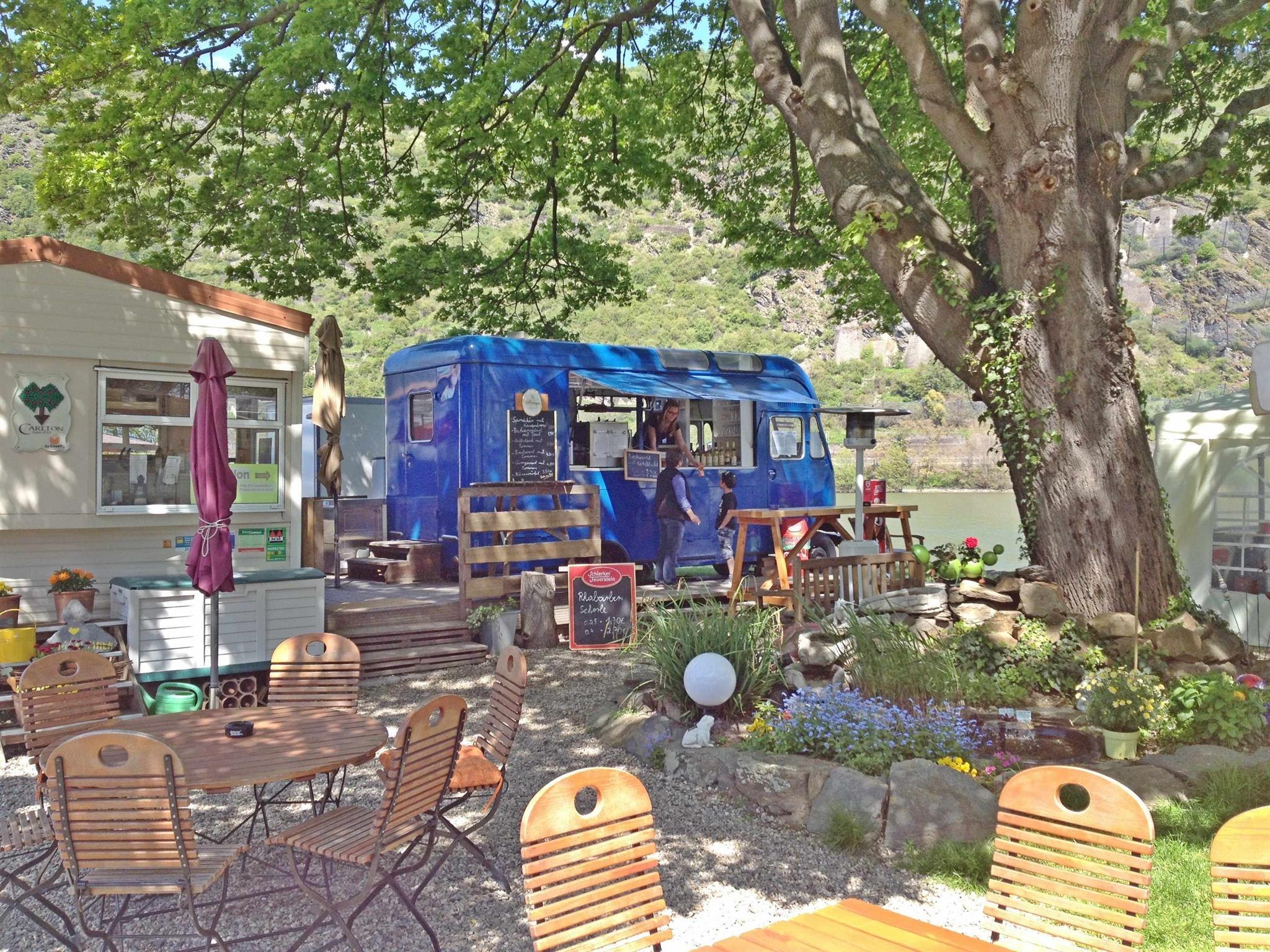 Gemütlicher Biergarten mit Imbiss direkt am Rheinufer, geöffnet von Ostern bis Anfang Oktober.