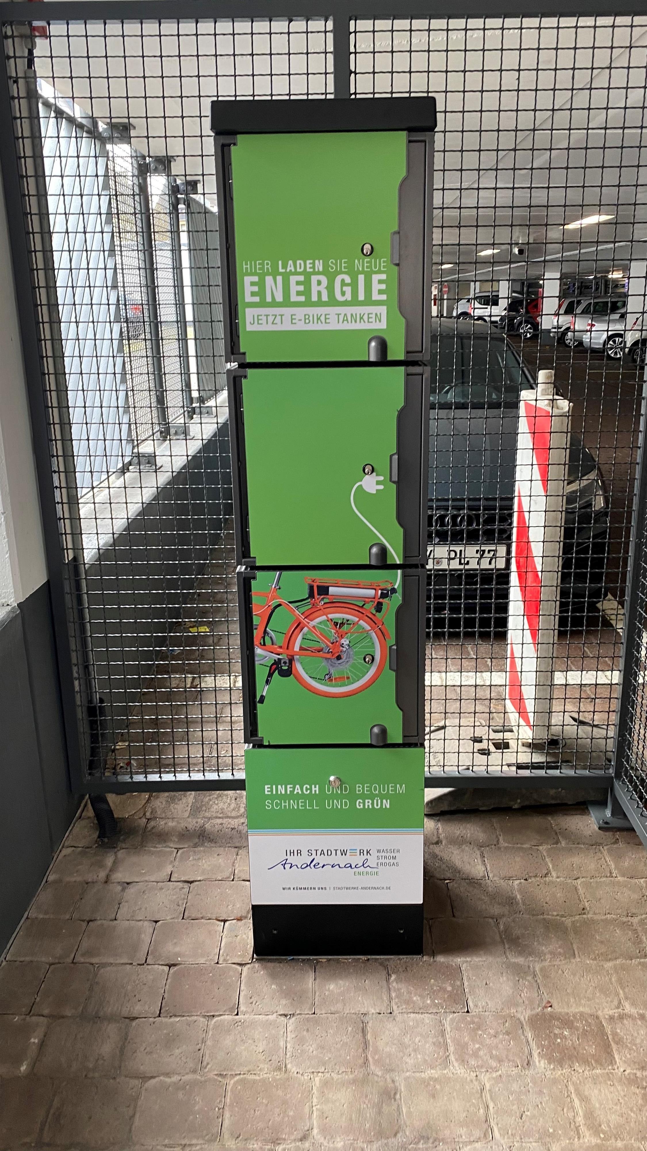 Brandaktuell wurde gerade diese neue E- Bike- Station eingerichtet. Neben einer Abstellmöglichkeit für E-Bikes und Roller werden abschließbare Lademöglichkeiten für unterschiedliche Akkus angeboten.