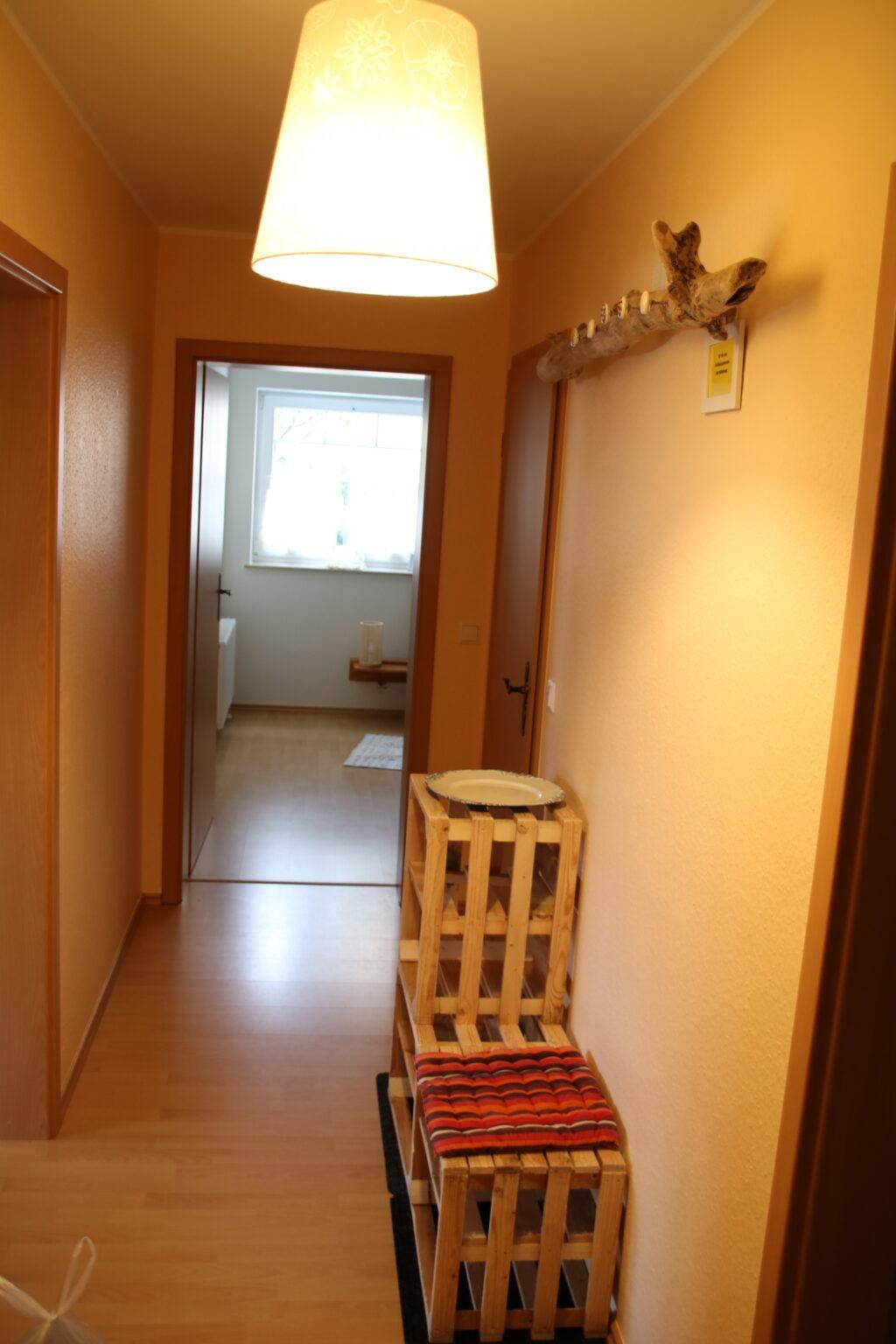 Der Flur ist mit einer Garderobe aus Treibholz vom Rhein ausgestattet, die dem Flur einen besonderen Charm verleiht. Ein praktisches Wanderschuhregal bietet ausreichen Platz für Ihre Schuhe nach einem erlebnisreichen Tag in der Natur.
