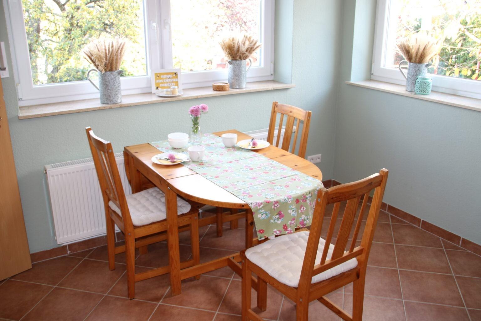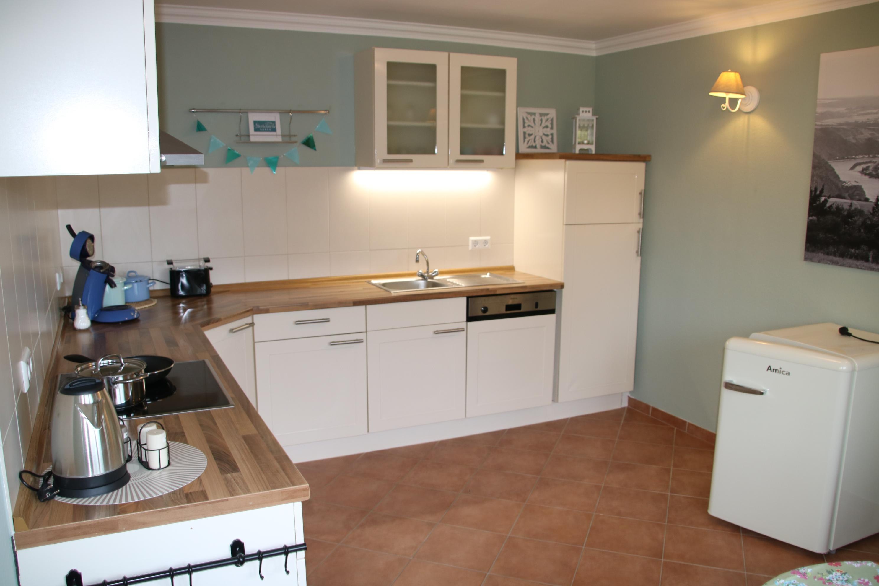 Unsere gut ausgestattete Küche bietet alles, was Sie für einen angenehmen Aufenthalt benötigen. Sie finden hier einen Kühlschrank, eine Spülmaschine, sowie einen Backofen. Für Ihre morgendliche Routine, stehen Ihnen ein Wasserkocher, eine Kaffeemaschine (Pulver oder Pads) und ein Toaster zur Verfügung. Die Küche ist Ideal für Selbstversorger und lädt zum Kochen und Genießen ein.