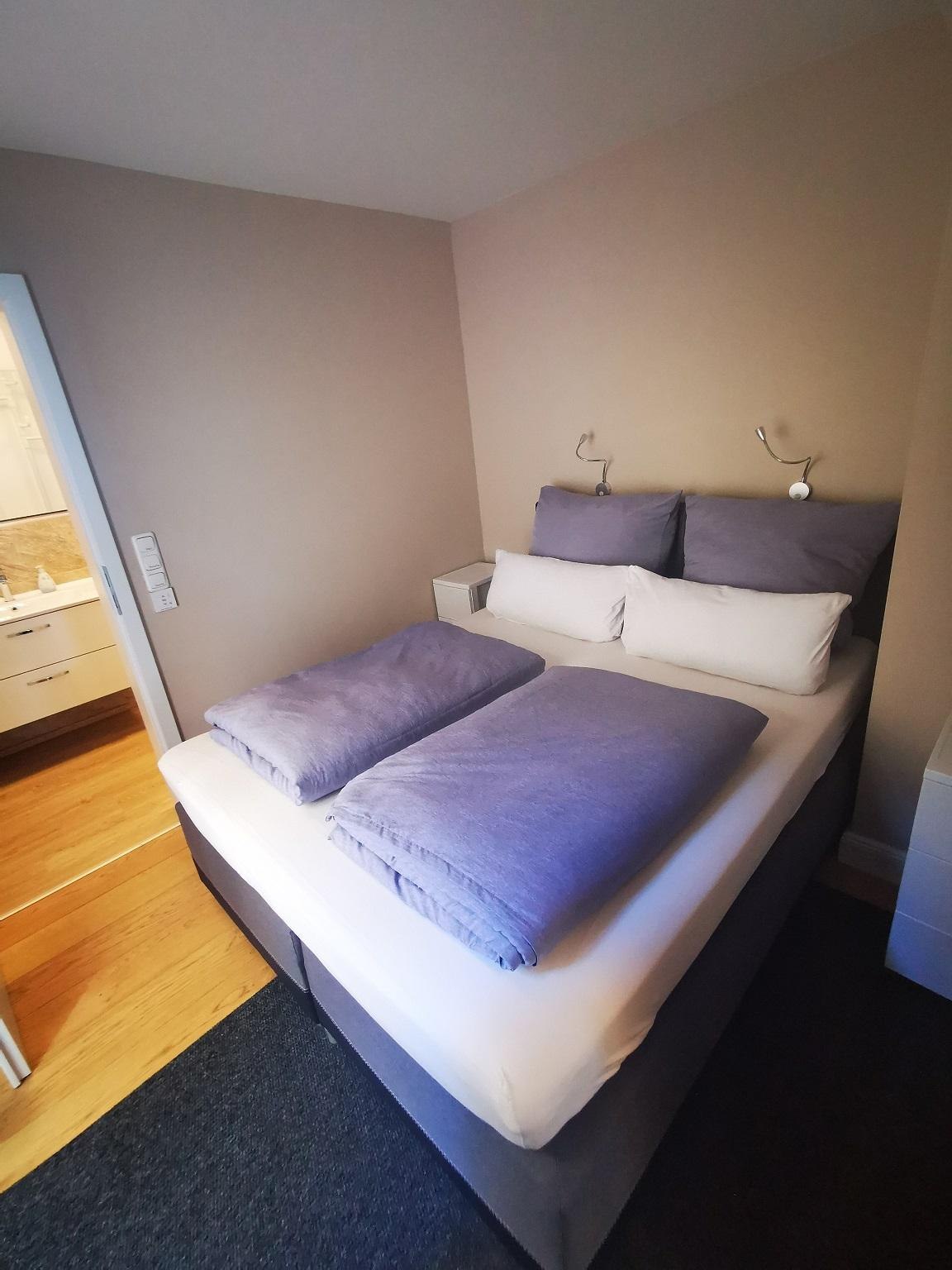 Betten: Die Doppel-Boxspringbetten im 2.OG und 3.OG sind jeweils 180 cm breit, im EG 160 cm. Bei den Schlafsofas jeweils mit Federkernmatratzen.