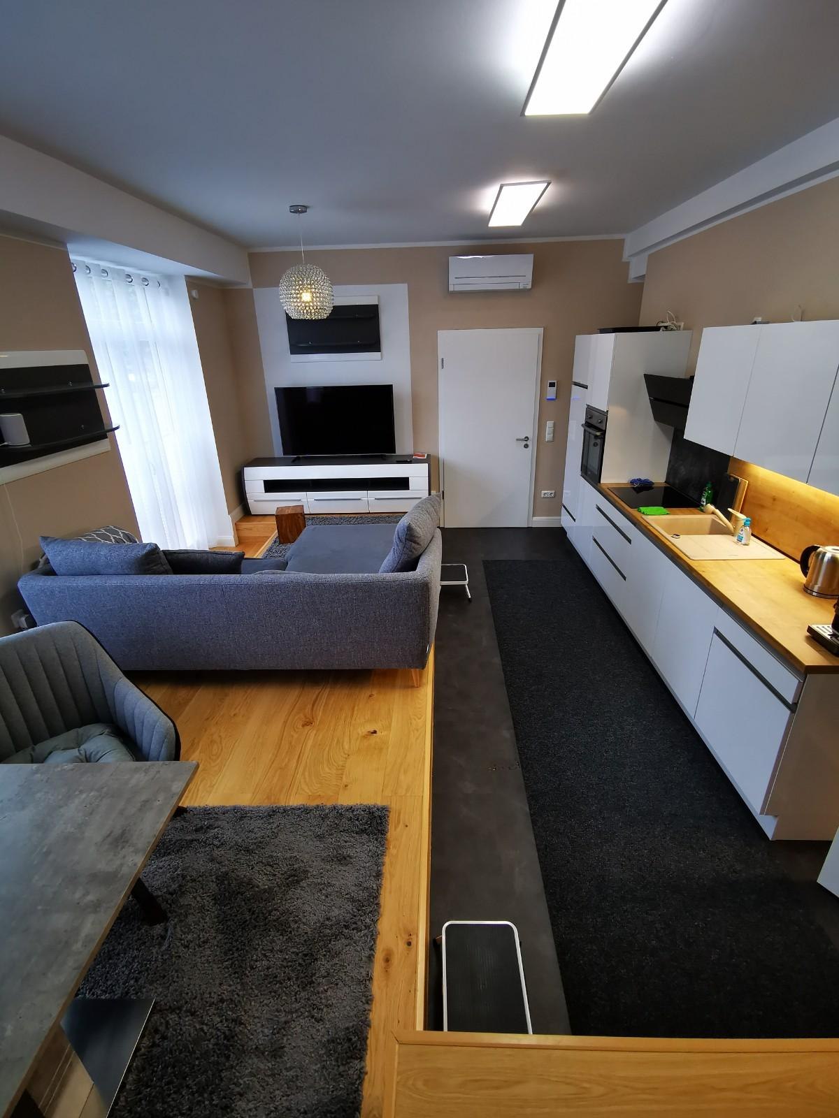 - Wohnraum mit Einbauküche, Essplatzbereich, Wohnbereich,