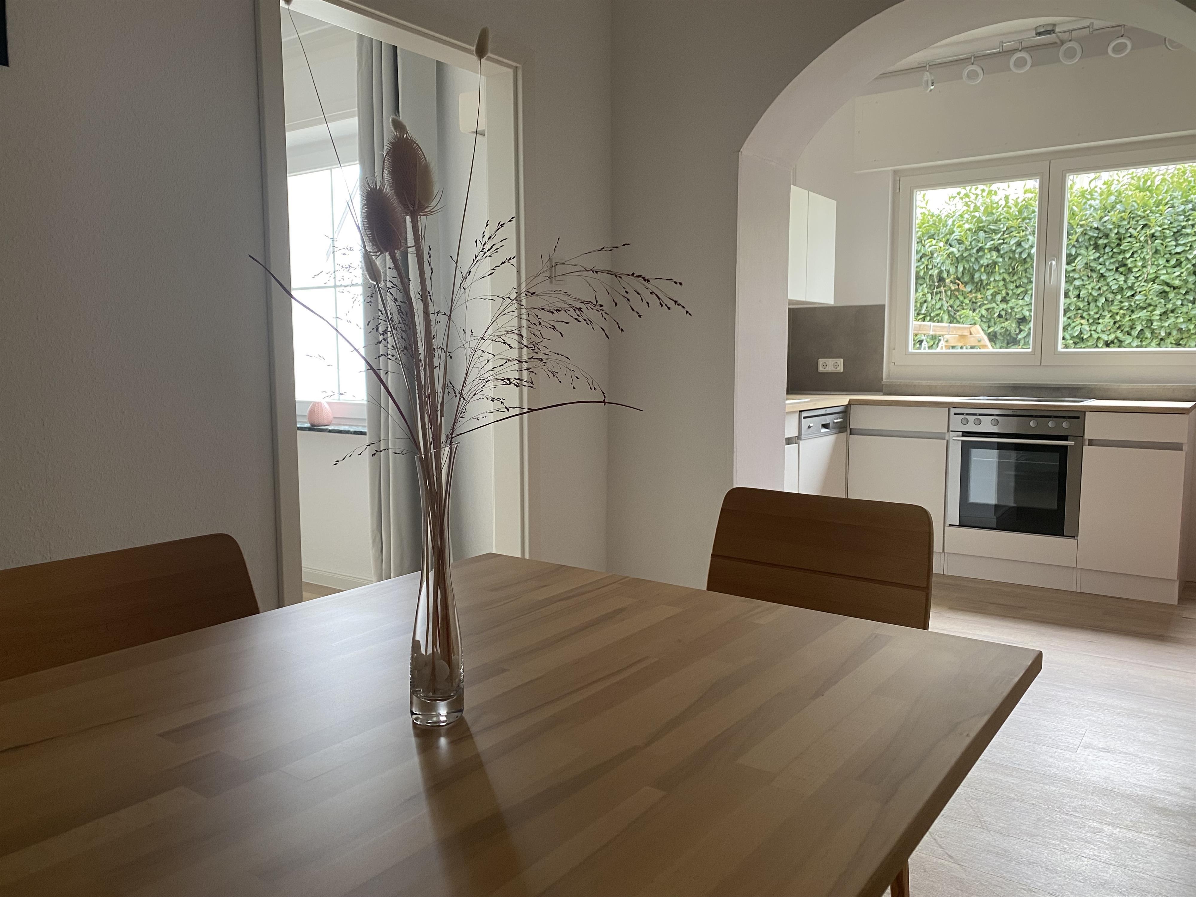 Rechts vom Wohnbereich gelegen, kommt man in die geräumige Küche und den Essbereich, der mit einer gemütlichen Eckbank zum Verweilen einlädt. Die Küche verfügt über eine Nespresso-Kapselmaschine und eine traditionelle Filter-Kaffeemaschine.