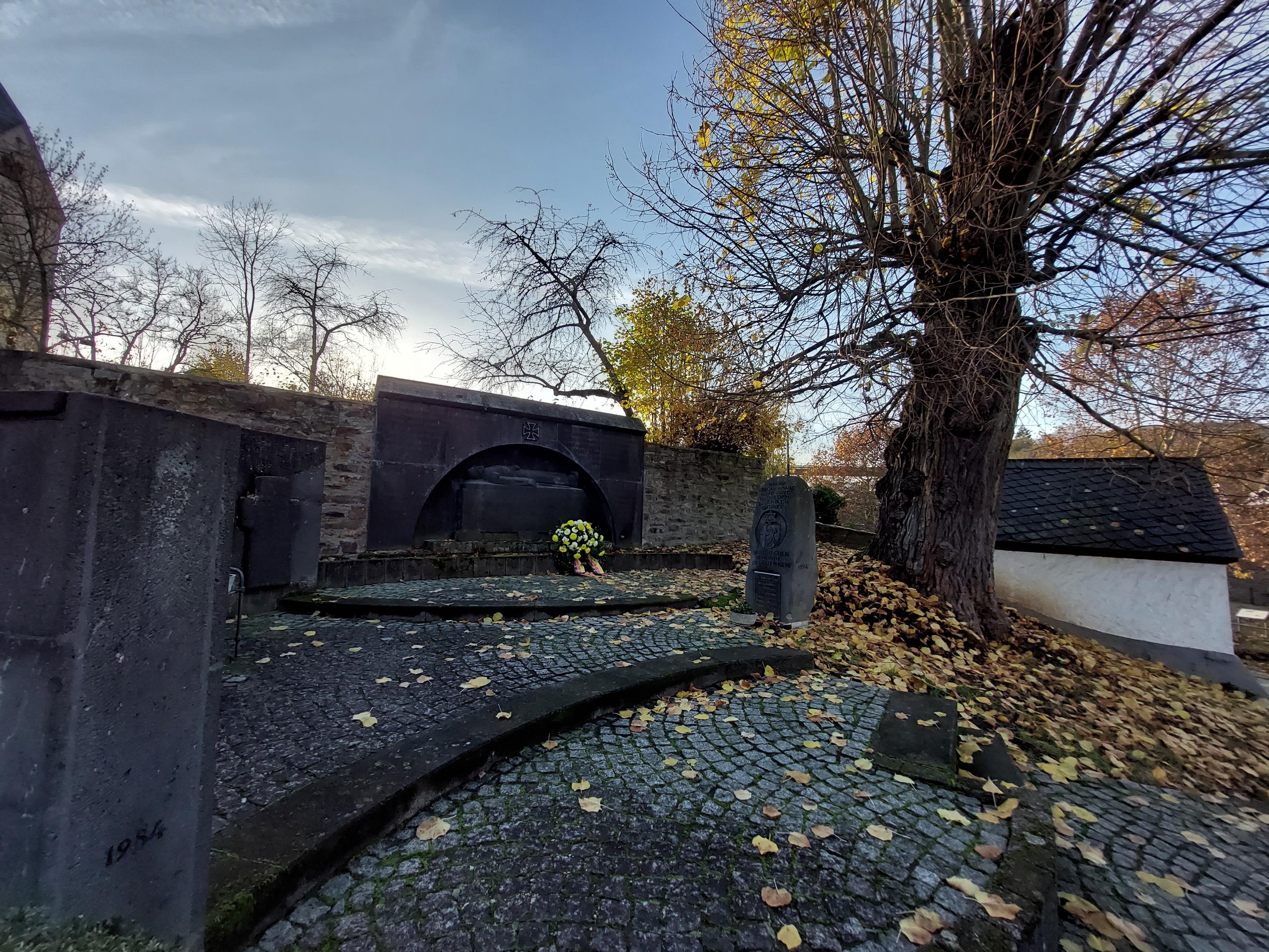 Auf der Freifläche gegenüber der St. Theresiakirche an der Mainzerstraße stehen das Kriegerdenkmal sowie ein Gedenkstein zur Erinnerung an die frühere jüdische Gemeinde. Auf dem Gedenkstein sind die Namen der jüdischen Familien verzeichnet, die 1933 in Rhens gewohnt haben. Es waren rund 40 Personen.