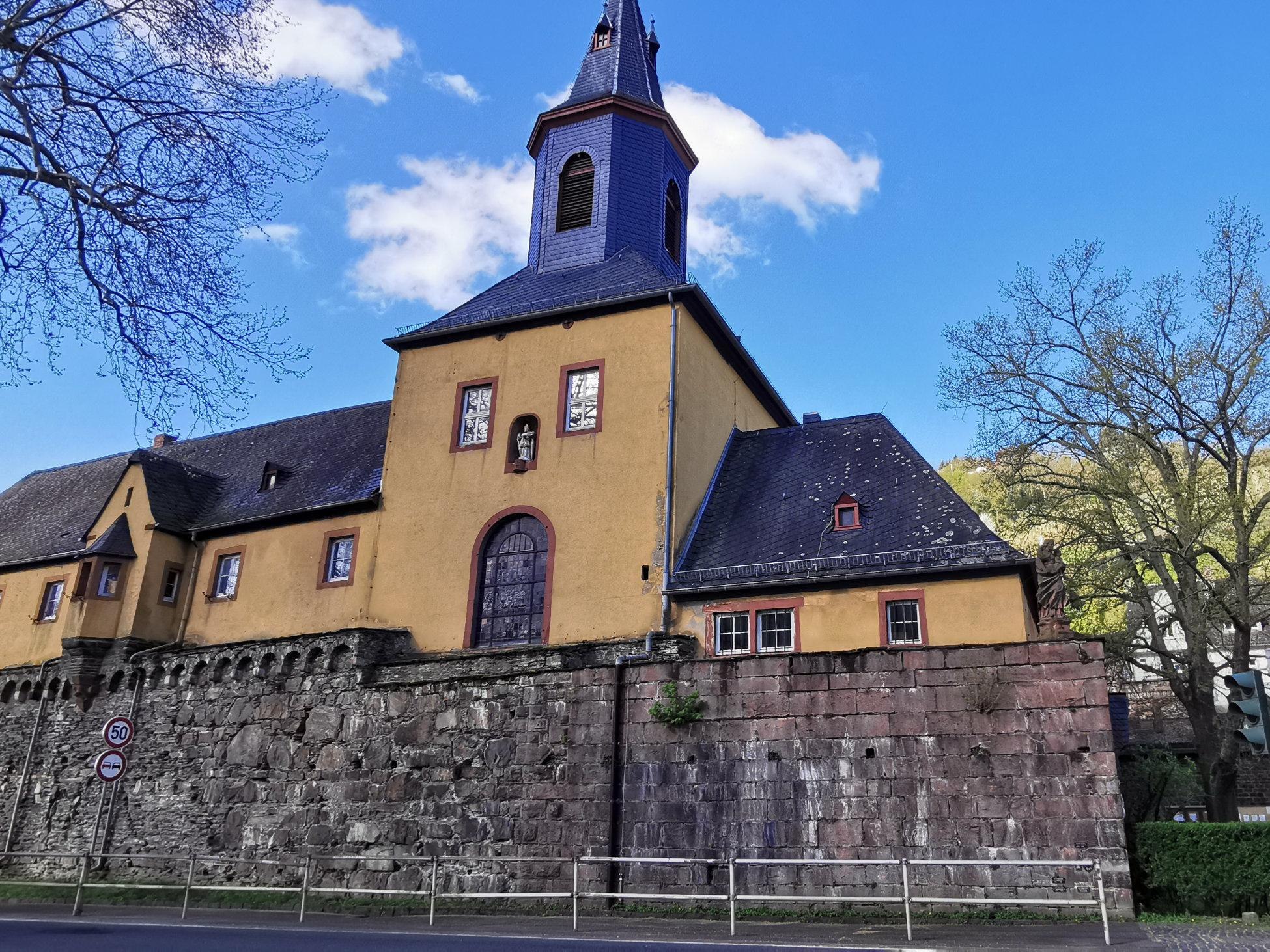 Die ehemalige Klosterkirche befindet sich in der Langstraße 2 und wurde Ende des 17. Jahrhunderts außerhalb der Stadtmauer auf der Fläche des ehemaligen Zollhofes von Kapuzinermönchen errichtet. Dies geschah, nachdem die Katholiken in Bacharach am Rhein 1685 Religionsfreiheit erhalten hatten. Im Mittelalter war der Standort des Zollhafens als Bastion ausgebaut. Die Schiffe fuhren bis zum Zollplatz heran, um ihren Rheinzoll zu bezahlen. Zwischen 1689 und 1705 wurde das Klostergebäude gebaut. Die dazugehörige Kirche St. Nikolaus besteht aus einem schlichten Saalbau. Der ehemalige Mönchschor im Osten wird durch einen verschieferten Dachreiter betont. Wie viele der Klosterkirchen des franziskanischen Ordens der Kapuziner hat die Kirche keinen repräsentativen Kirchturm. In einer Nische der östlichen Außenwand der heutigen Pfarrkirche steht als Schmuck eine Statue des Kirchenpatrons sowie Schutzpatrons der Schiffsleute St. Nikolaus. Im Zuge der Säkularisation wurde das Kloster aufgehoben. Das Gotteshaus übte ab 1802 nur noch die Funktion einer Pfarrkirche aus. Die ehemaligen Klostergebäude wurden 1977 durchgreifend renoviert und in mehreren Bauabschnitten zu einer Pfarrwohnung und einem Pfarrheim für die katholische Kirchengemeinde St. Nikolaus umgebaut.