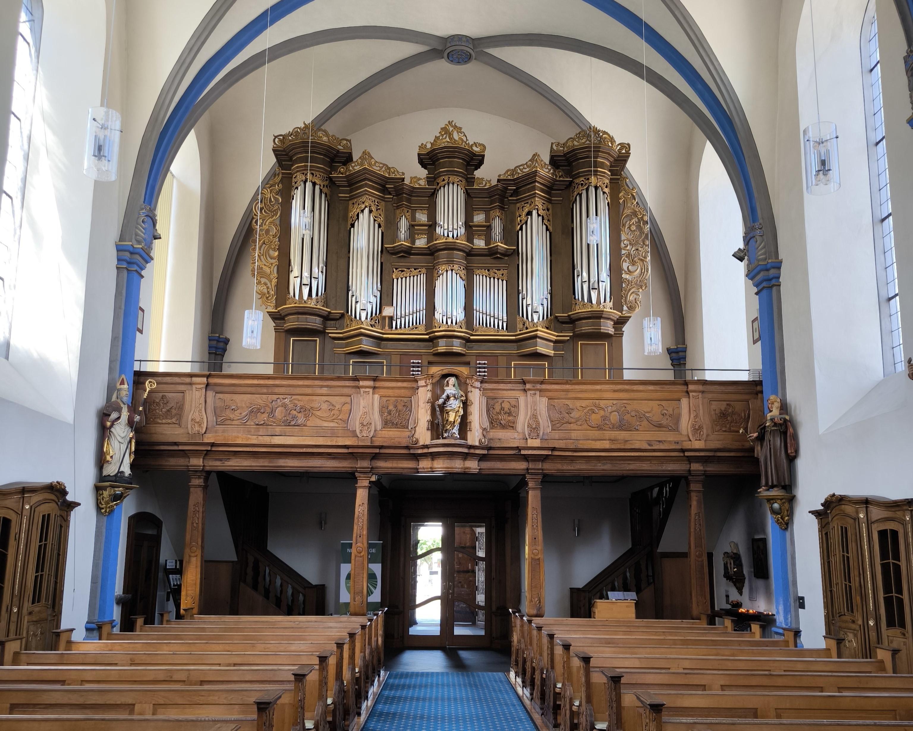 1755 - 1759 von dem Bildkünstler Benjamin Opitz aus Groden entworfen zierte dieser Orgelprospekt 200 Jahre lang die Orgel der Ev. Luth. Lamberti-Kirche im ostfriesischen Aurich. 1959 hat die Pfarrgemeinde St. Marien ihn von dort übernommen. Gleichzeitig wurde das alte Orgelwerk durch ein neues ersetzt. Der Orgelbauer Rowan West, Altenahr, schuf ein Instrument nach norddeutsch-barocker Bauart und stellte so eine stilistische und klangliche Harmonie des Orgelwerks mit dem barocken Stil des Orgelgehäuses und der übrigen Ausstattung des Gotteshauses her.
