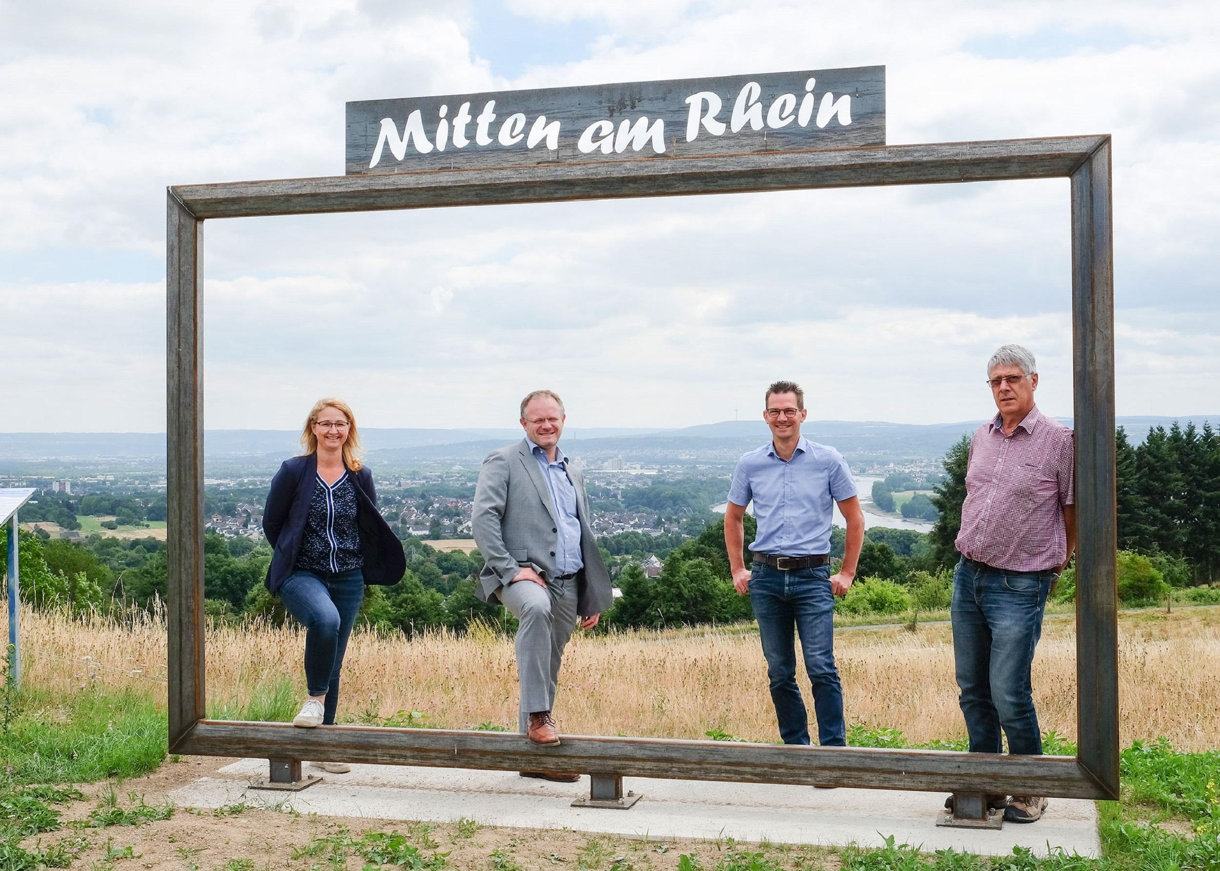 Oberhalb von Feldkirchen finden Sie diesen großen Rahmen "Mitten am Rhein", der Ihnen einen wunderschönen Blick auf das Neuwieder Becken zeigt.