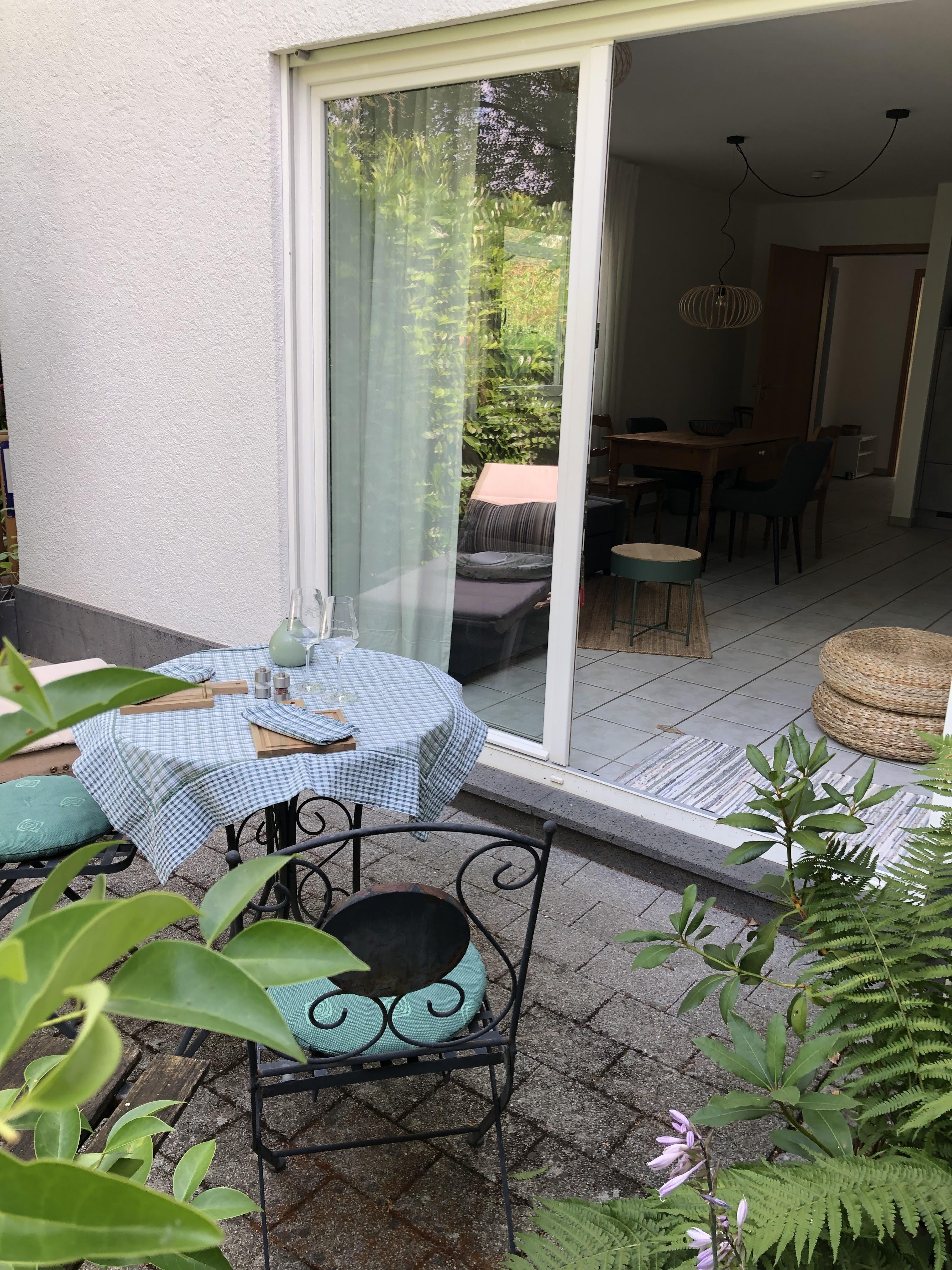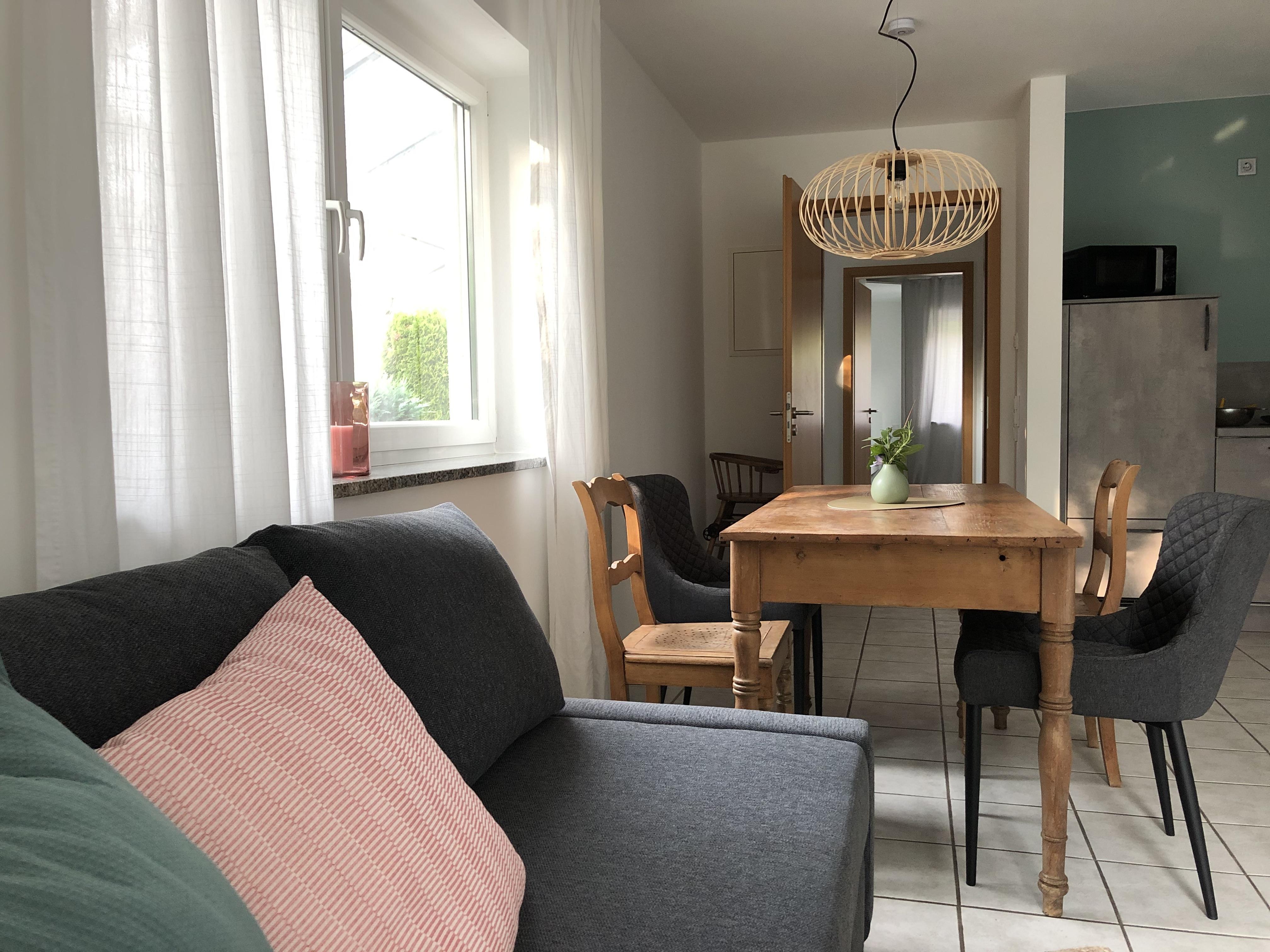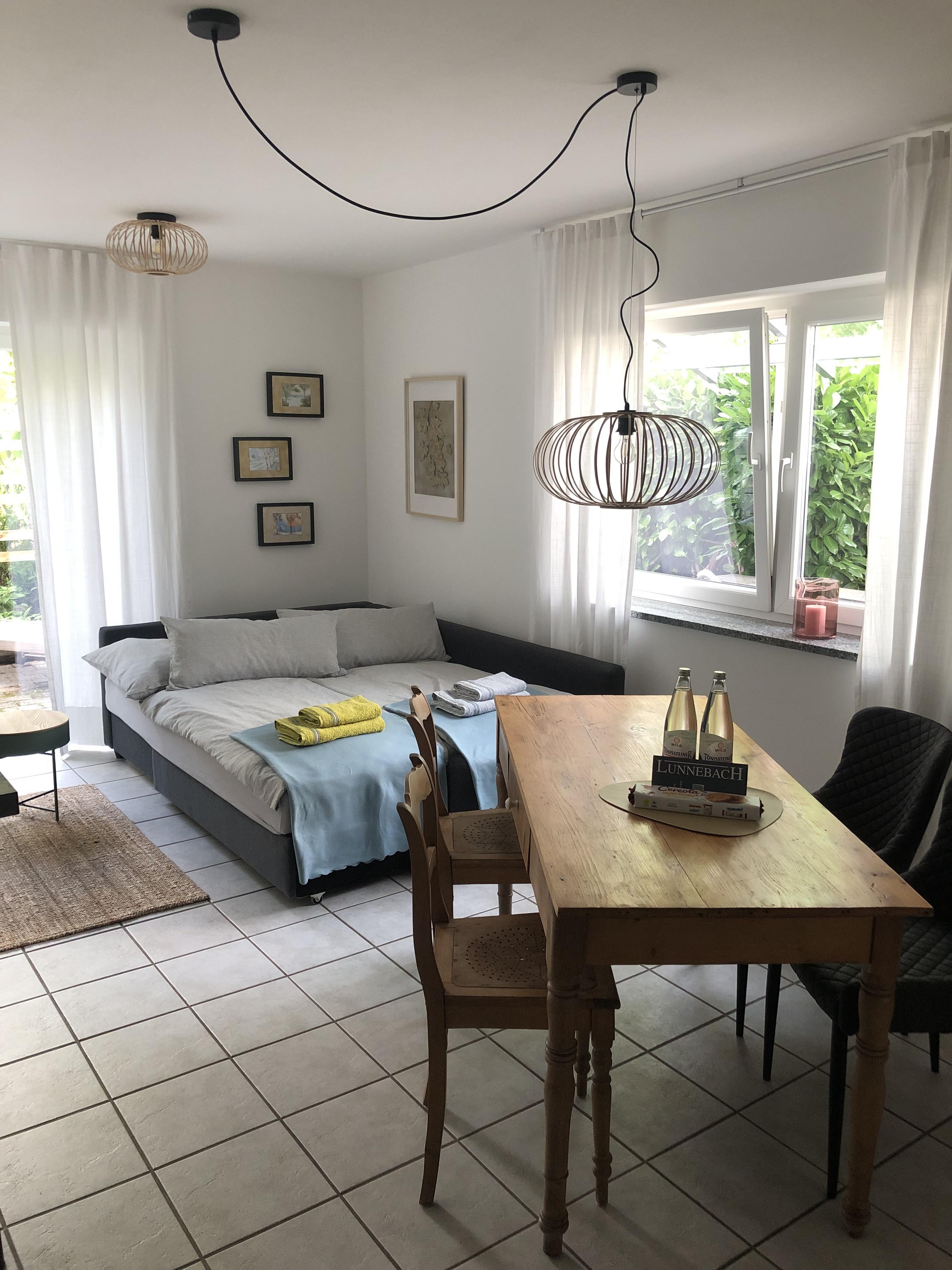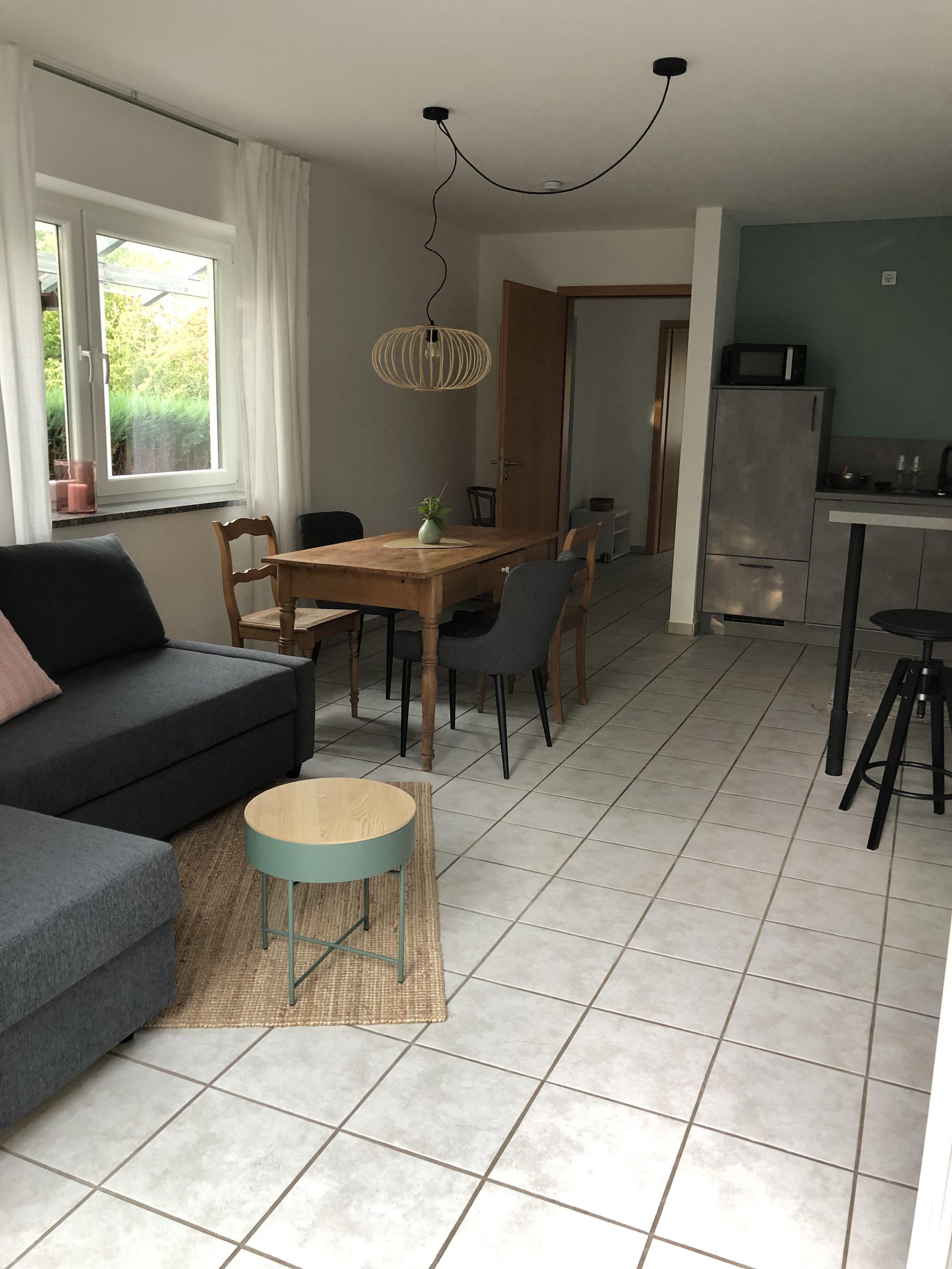 Ein Schlafzimmer mit Doppelbett, ein Bad mit Dusche und Badewanne, ein großes Wohnzimmer mit Schlafcouch und eine vollständig eingerichtete Küche, sowie eine Terrasse zum Garten und eine Terrasse vor der Eingangstür laden zum Entspannen und Wohlfühlen ein. Öffentliche, kostenfreie Parkplätze gibt es in unmittelbarer Nähe (15 m), auf Anfrage reservieren wir Ihnen einen Stellplatz am Haus.