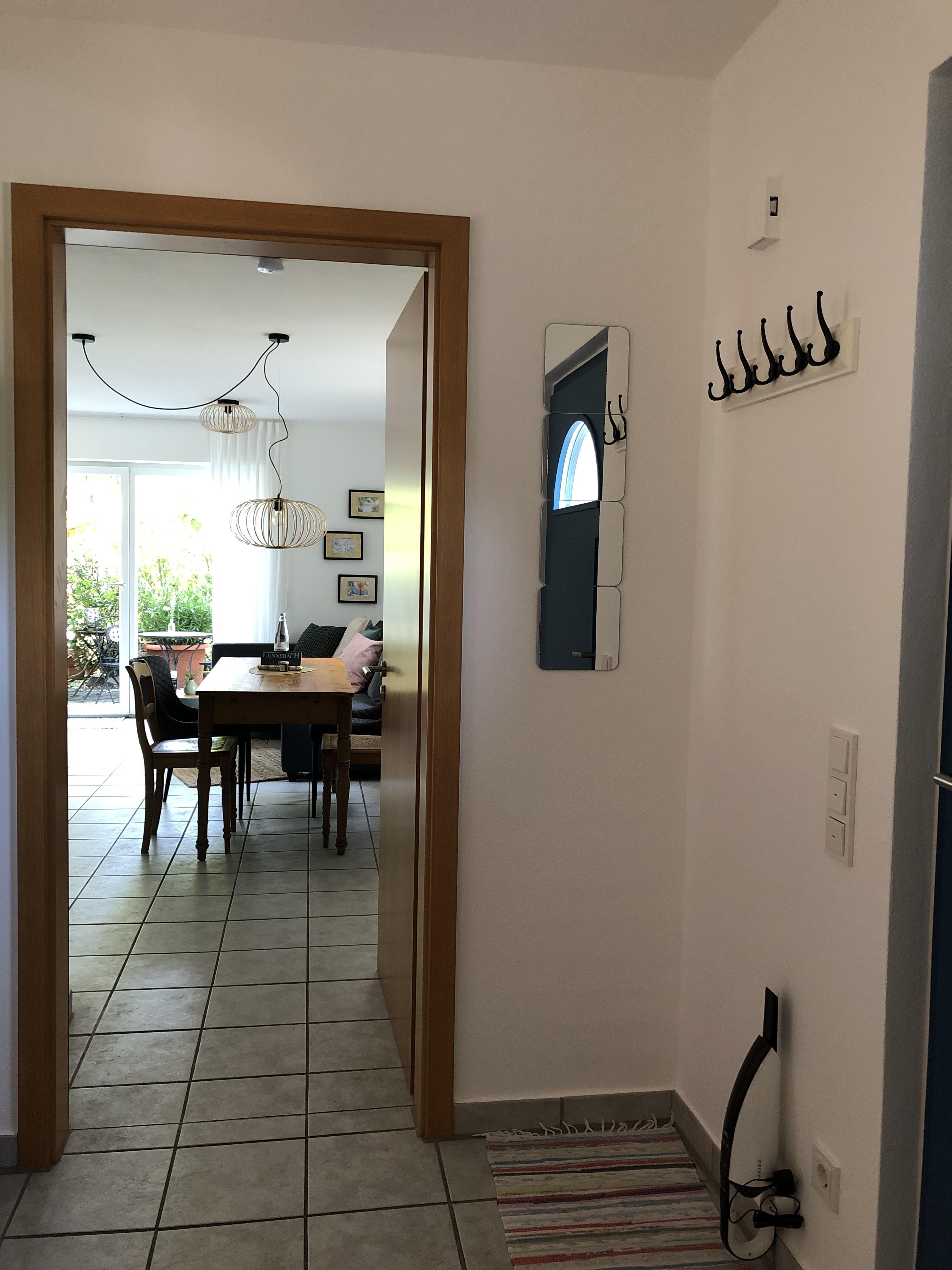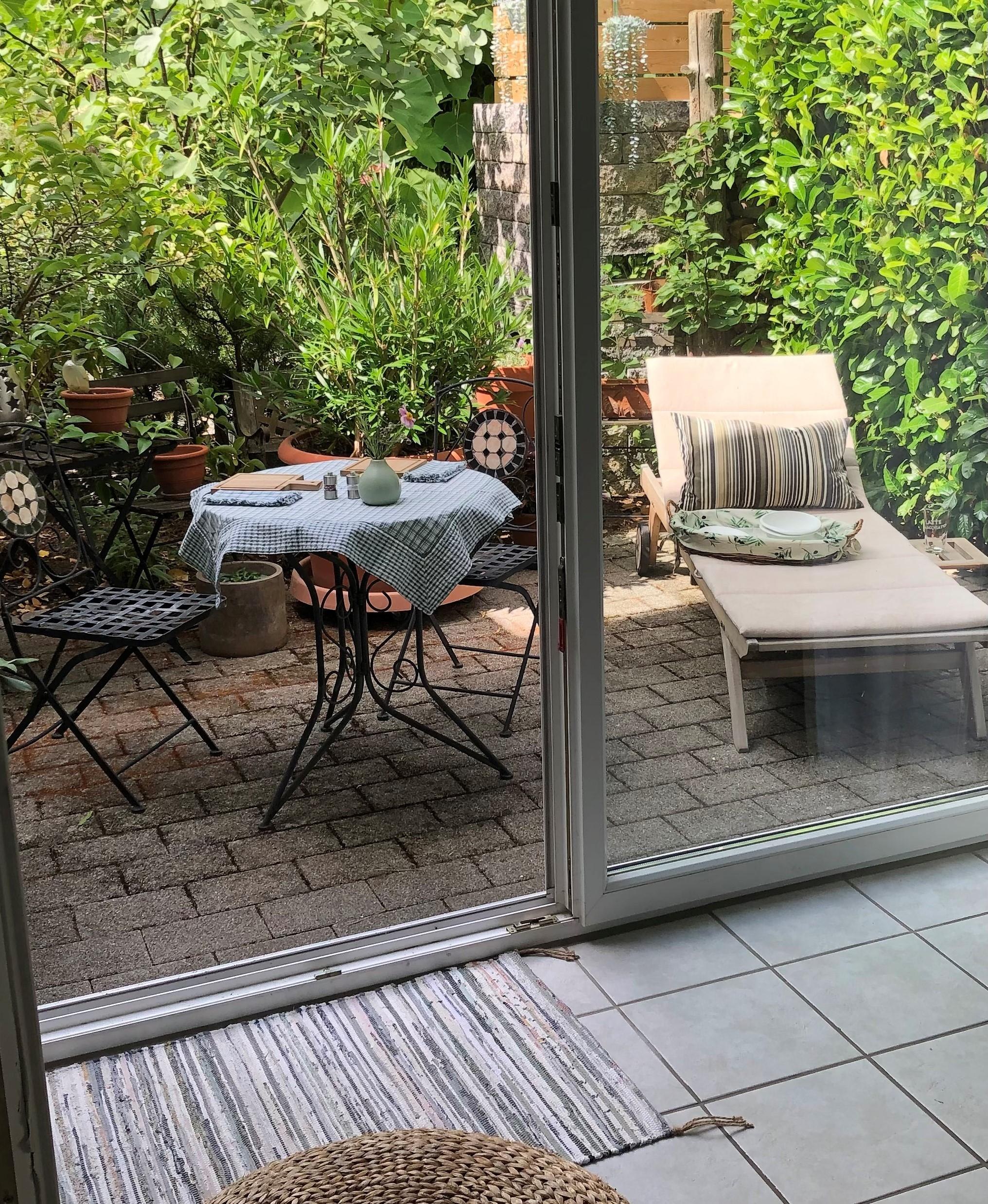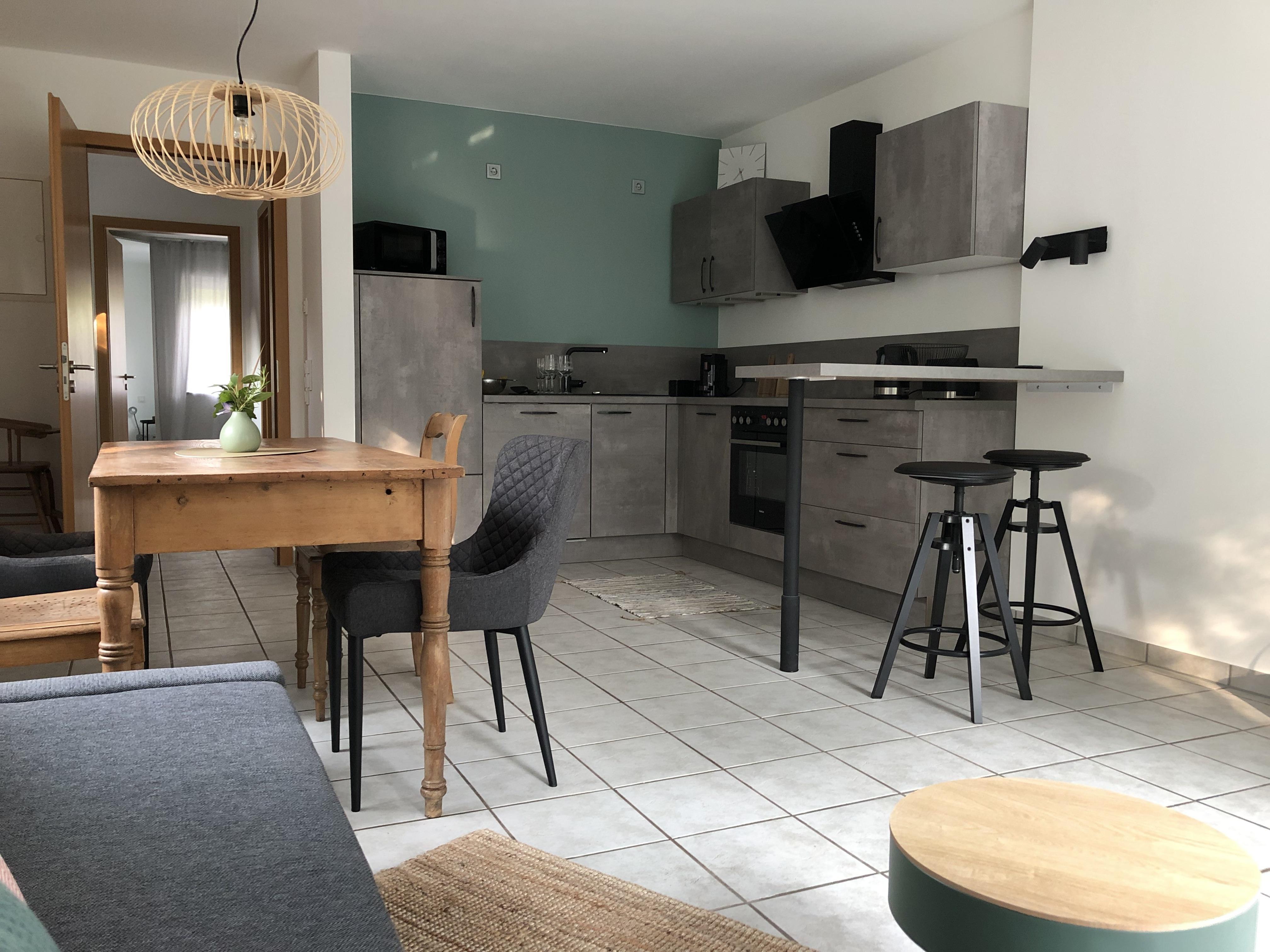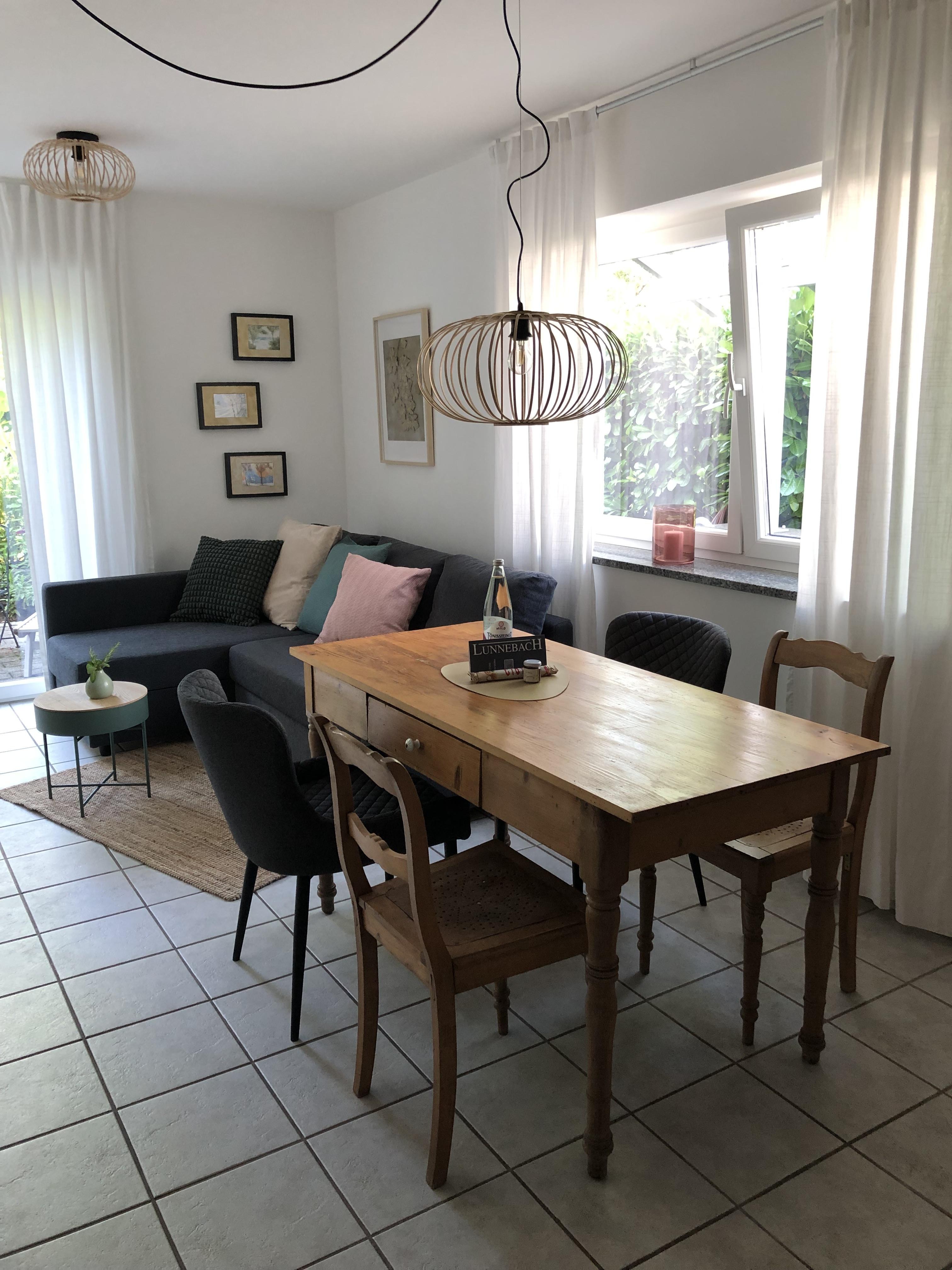 Ein Schlafzimmer mit Doppelbett, ein Bad mit Dusche und Badewanne, ein großes Wohnzimmer mit Schlafcouch und eine vollständig eingerichtete Küche, sowie eine Terrasse zum Garten und eine Terrasse vor der Eingangstür laden zum Entspannen und Wohlfühlen ein. Öffentliche, kostenfreie Parkplätze gibt es in unmittelbarer Nähe (15 m), auf Anfrage reservieren wir Ihnen einen Stellplatz am Haus.