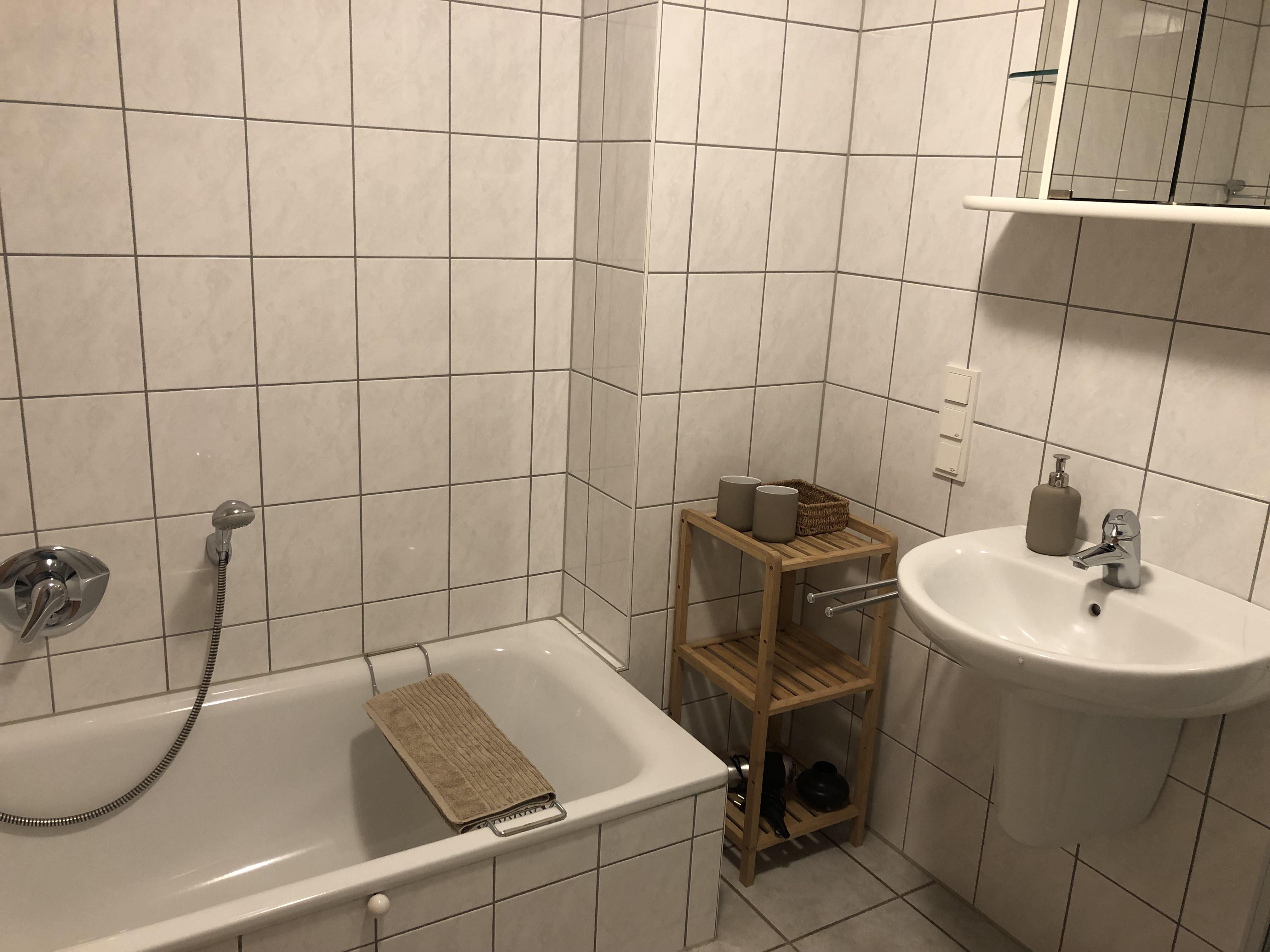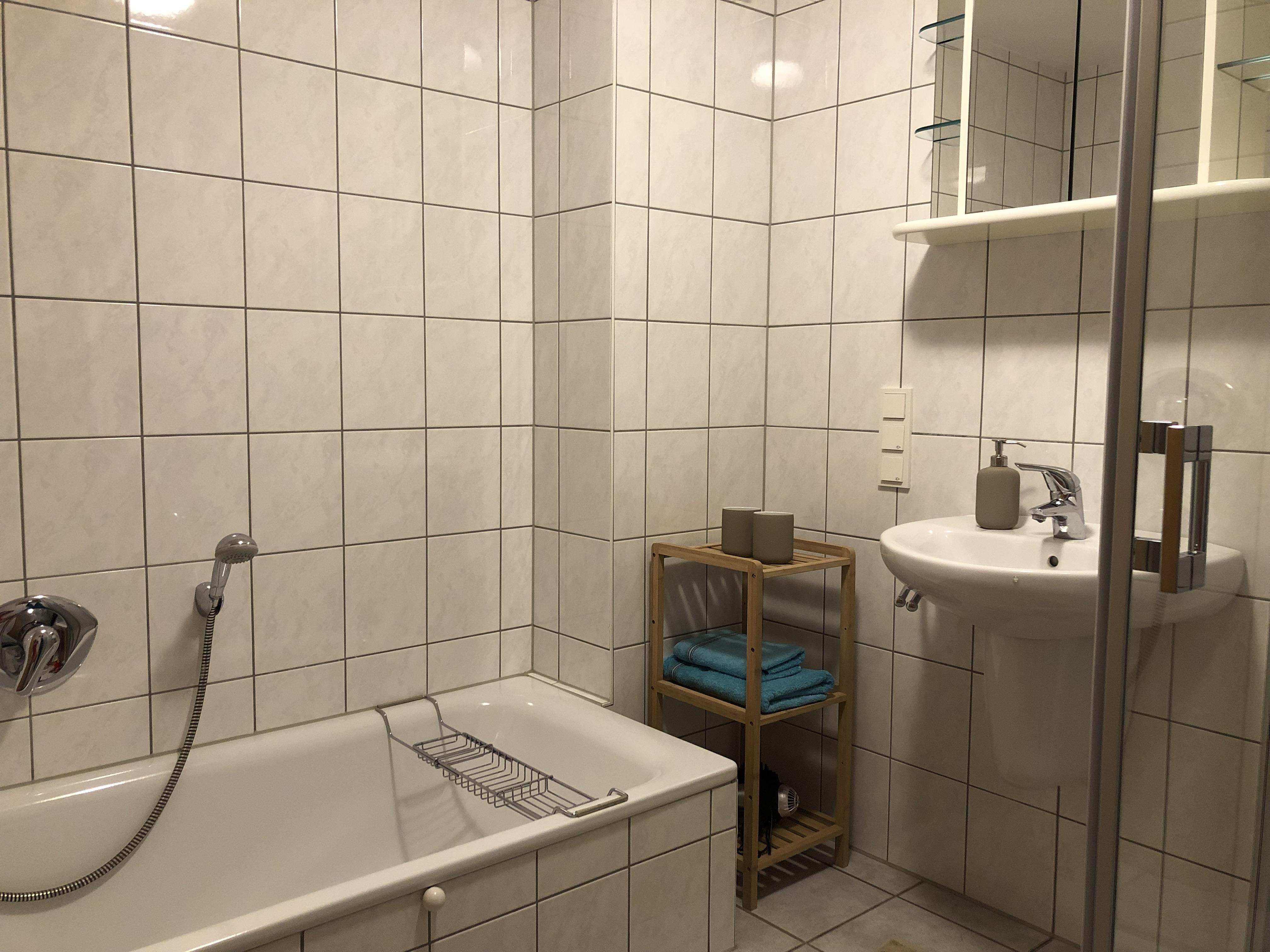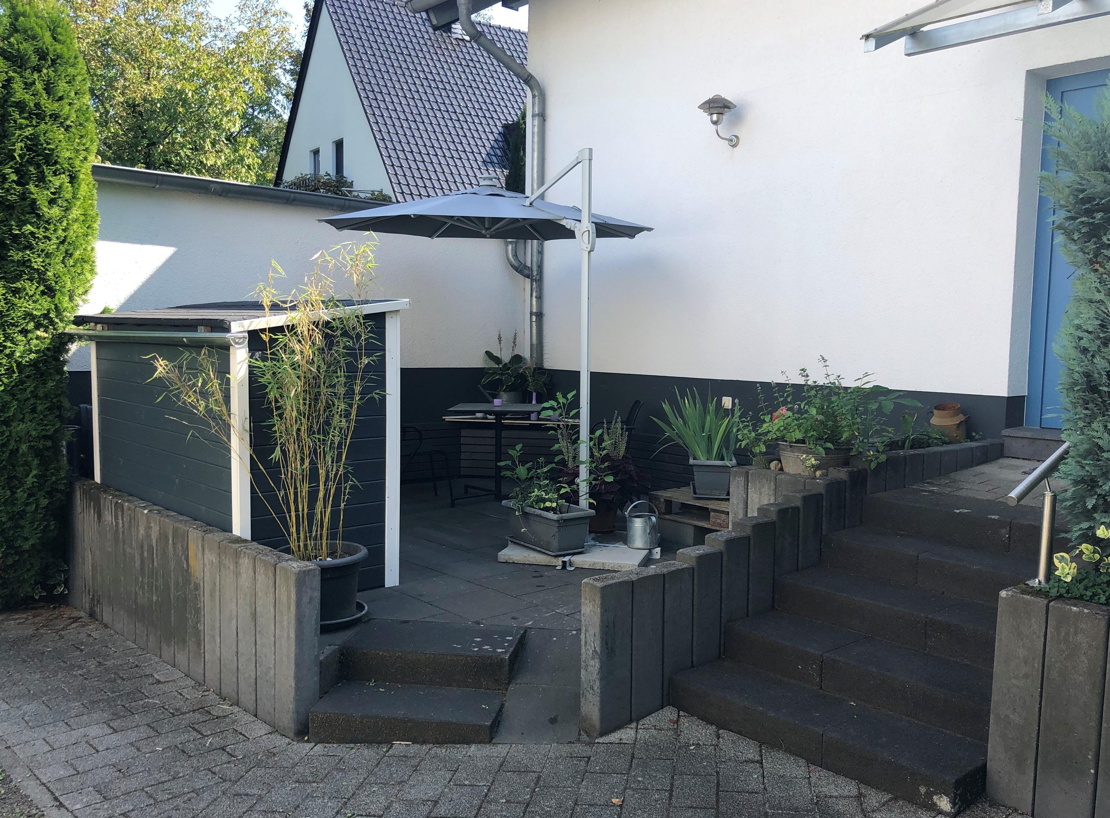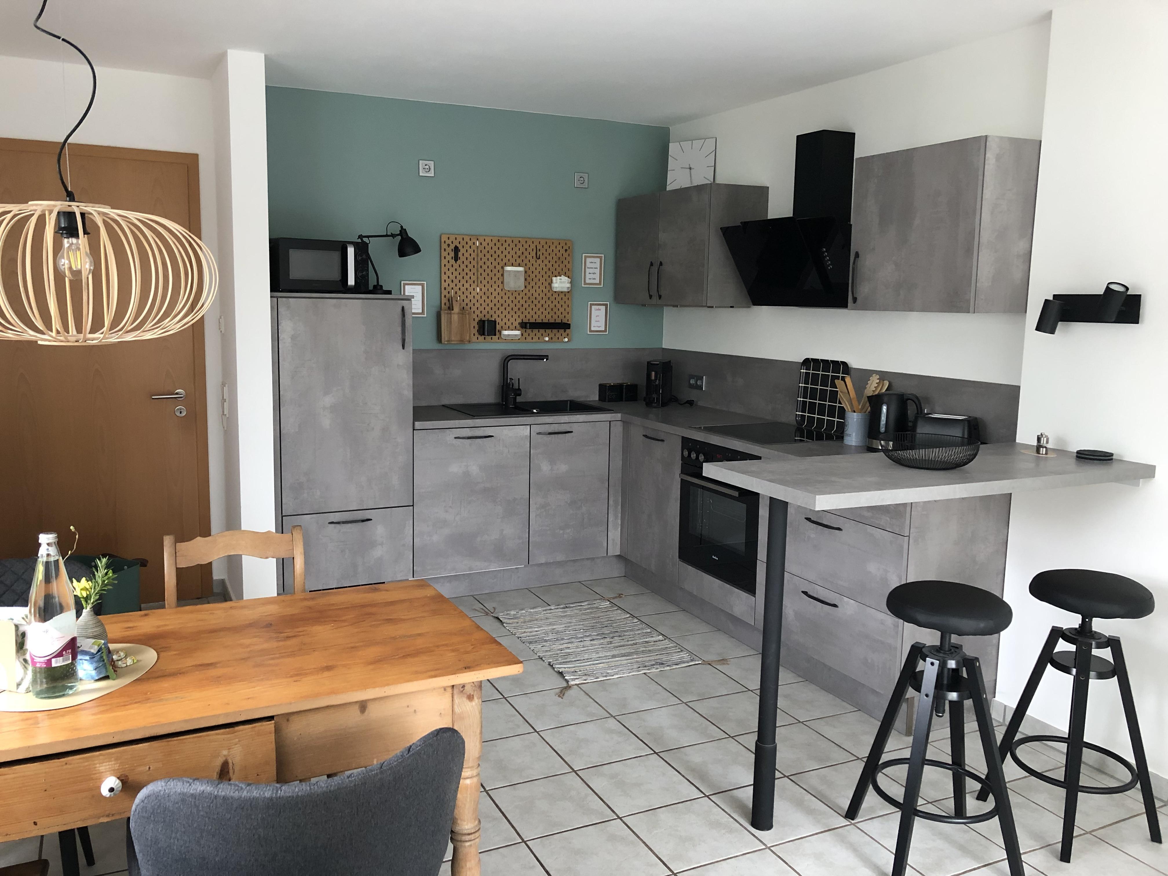 Ein Schlafzimmer mit Doppelbett, ein Bad mit Dusche und Badewanne, ein großes Wohnzimmer mit Schlafcouch und eine vollständig eingerichtete Küche, sowie eine Terrasse zum Garten und eine Terrasse vor der Eingangstür laden zum Entspannen und Wohlfühlen ein. Öffentliche, kostenfreie Parkplätze gibt es in unmittelbarer Nähe (15 m), auf Anfrage reservieren wir Ihnen einen Stellplatz am Haus.