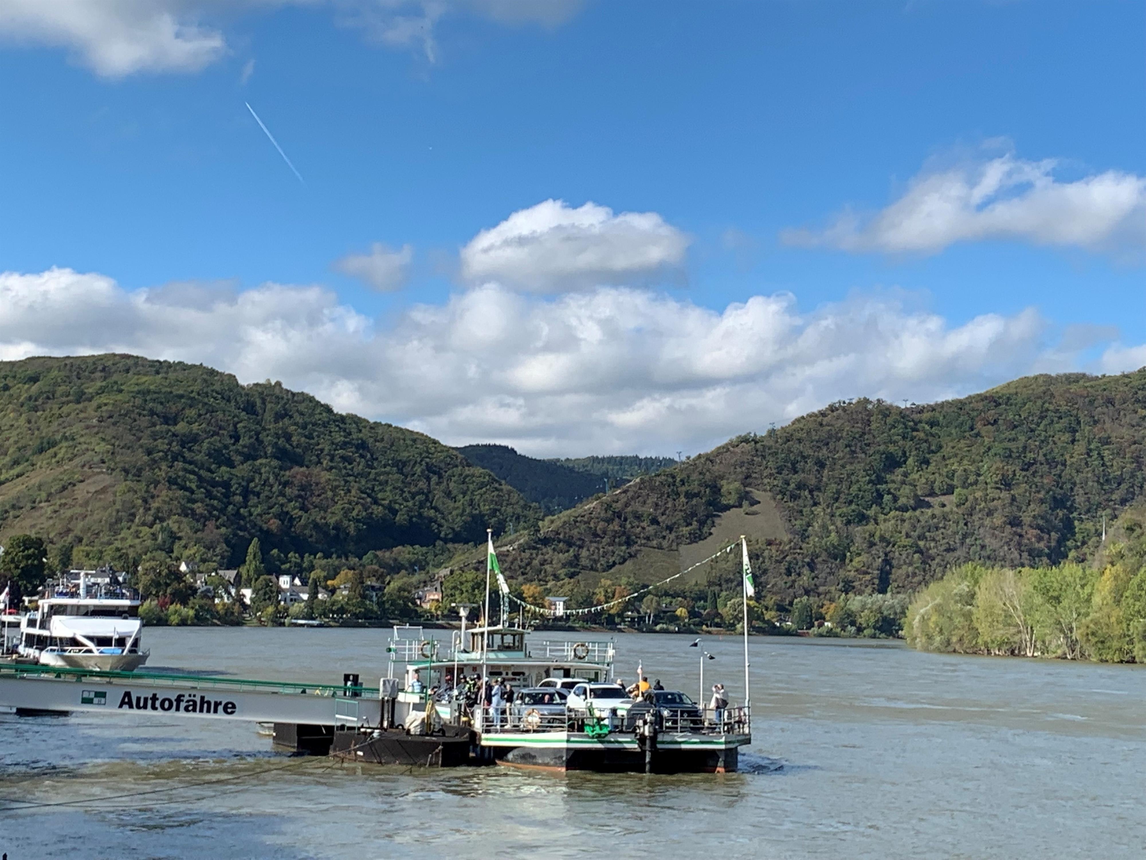 Die Fähre Stadt Boppard der Familie Deleu verkehrt auf dem Rhein zwischen den Städten Boppard und Filsen bei Rheinkilometer 570.