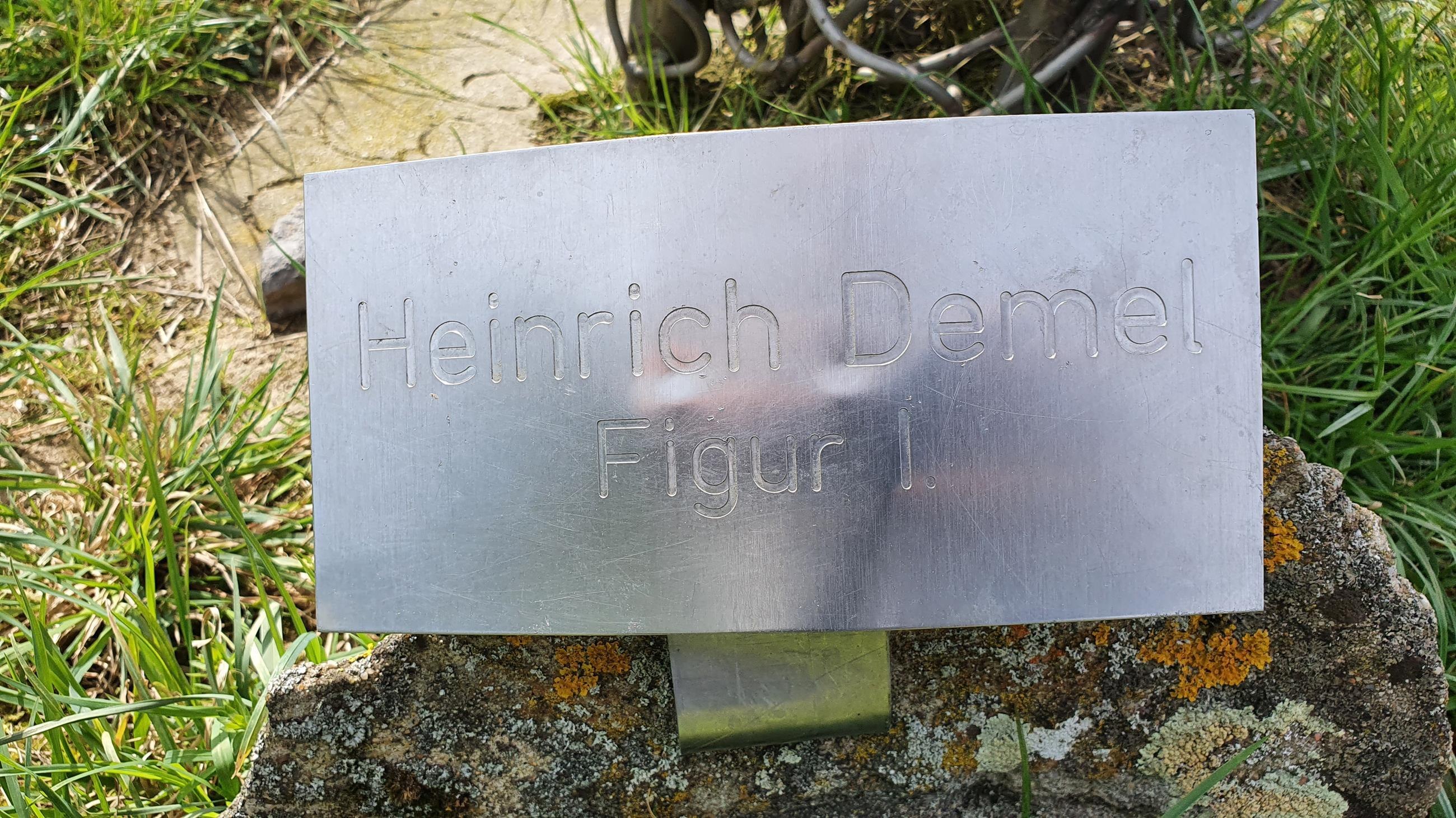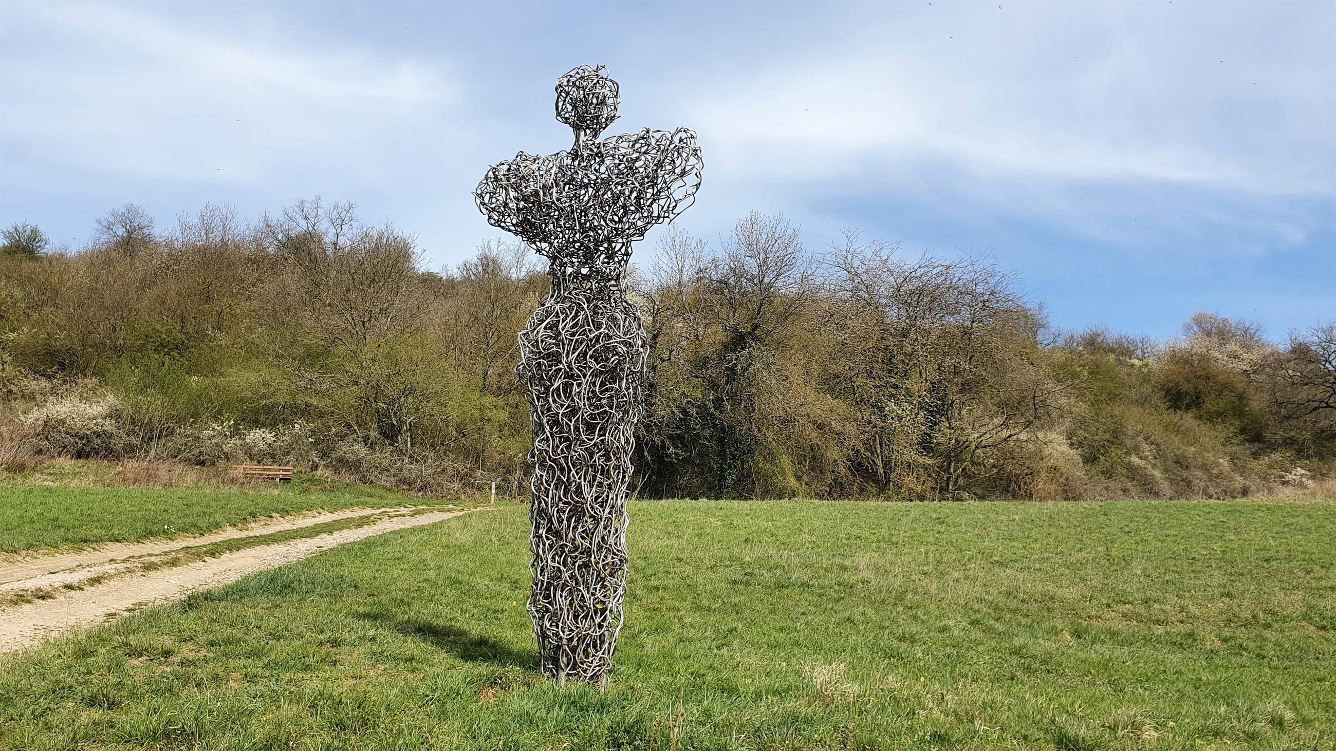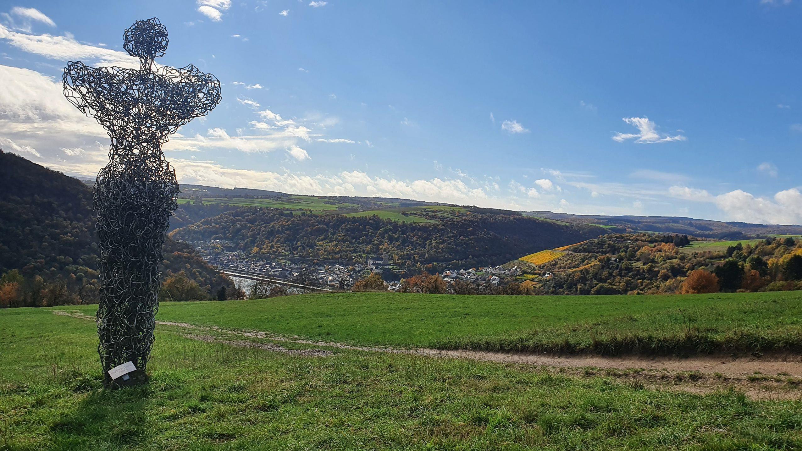 Die Figur wurde aus vielen hundert Edelstahlstäbchen hergestellt, die gebogen und zur figurativen Plastik zusammengeschweißt wurden. Durch das Licht der Sonne verändert sich die Erscheinung der Edelstahlskulptur ständig, da sie das Licht immer wieder neu reflektiert. die war ein wesentlicher Grund für die Wahl des Materials Edelstahl. Die Figur soll die Ruhe ausstahlen, die der Wanderer erfährt, wenn er danebensteht, den Blick über das Rheintal und die Stadt Oberwesel schweifen läßt und sich bewußt wird, daß sich diese Landschaft über die Jahrhunderte nicht wesentlich verändert hat. mit dieser Beständigkeit korrespondiert auch das Material Edelstahl. Gleichzeitig erinnert die Skulptur aber auch die Eisenpanzer der Ritter und bezeugt damit einen Teil der mittelalterlichen Geschichte des Rheintals.