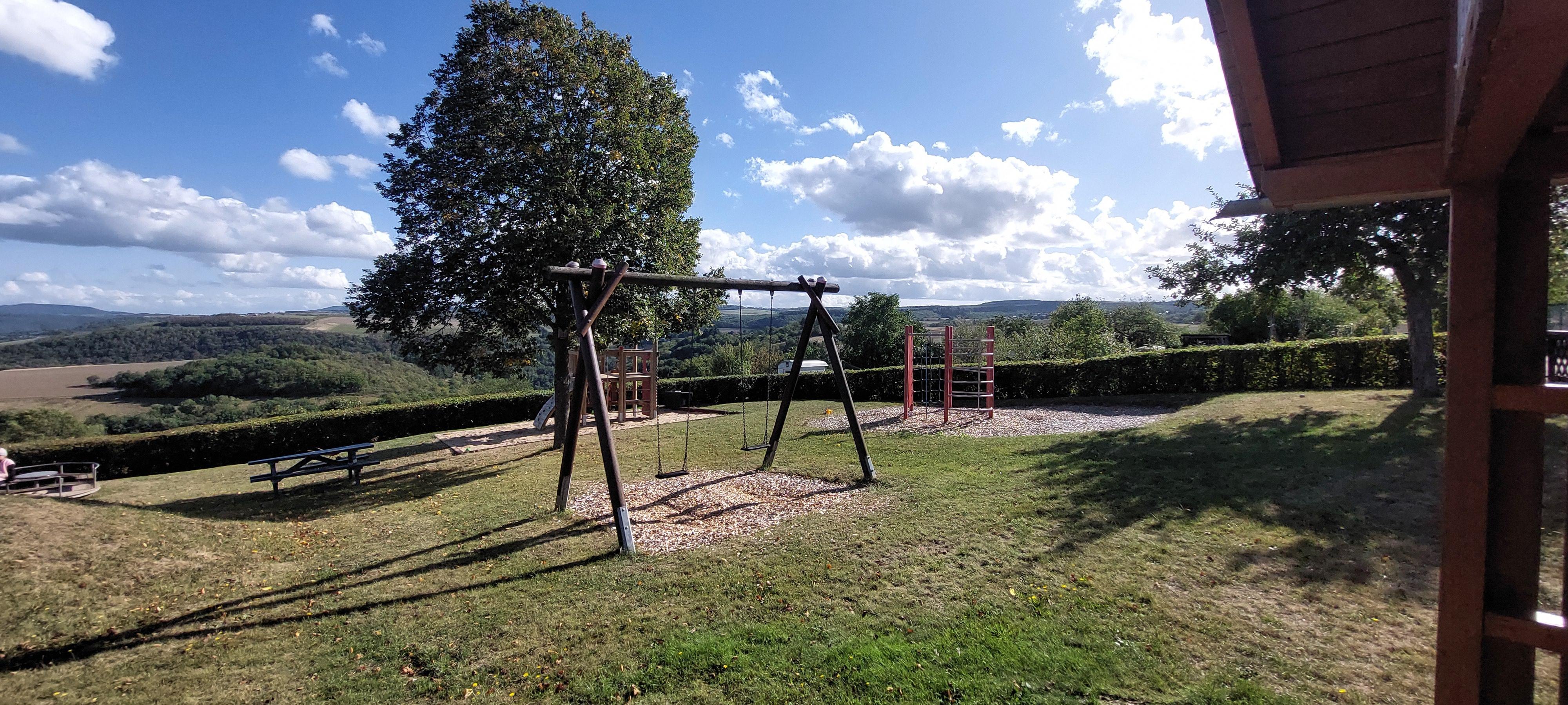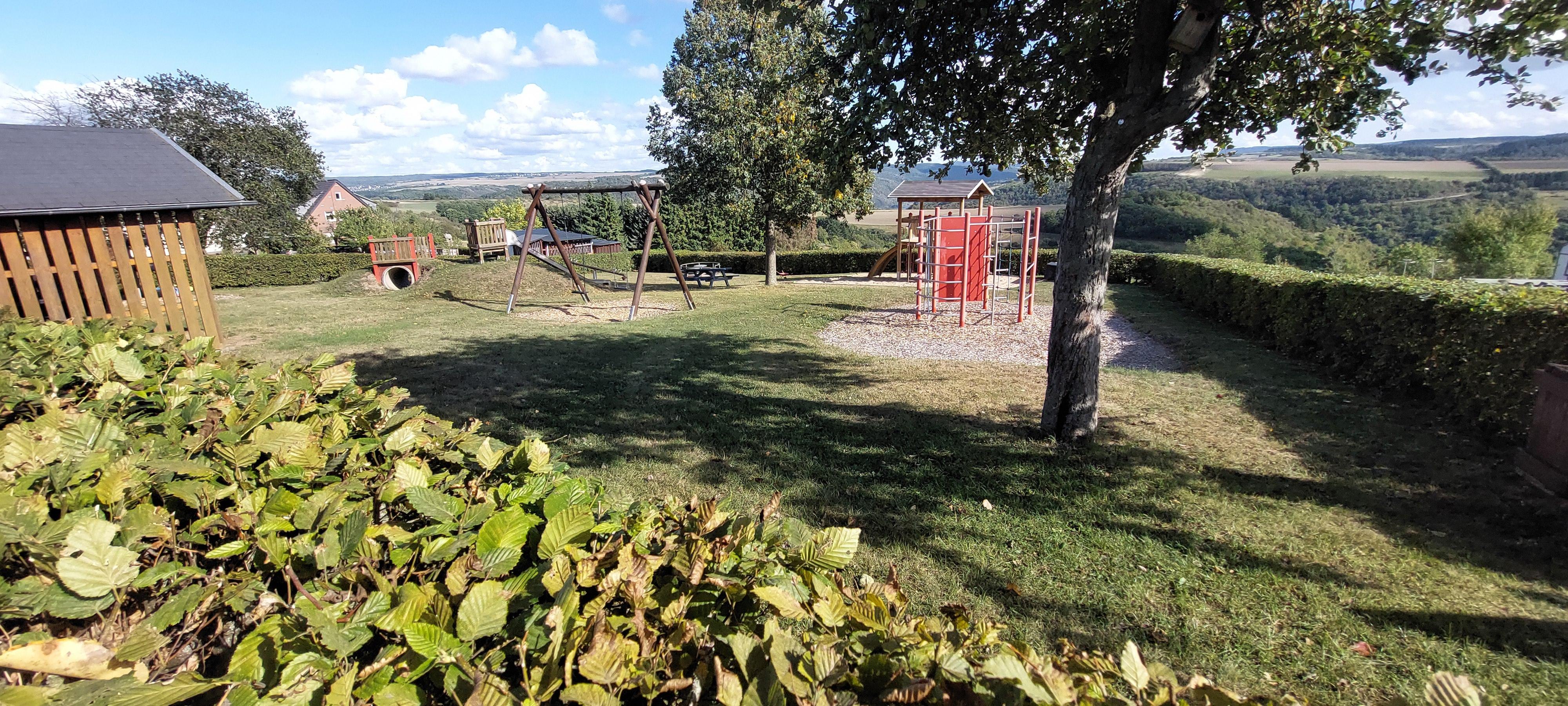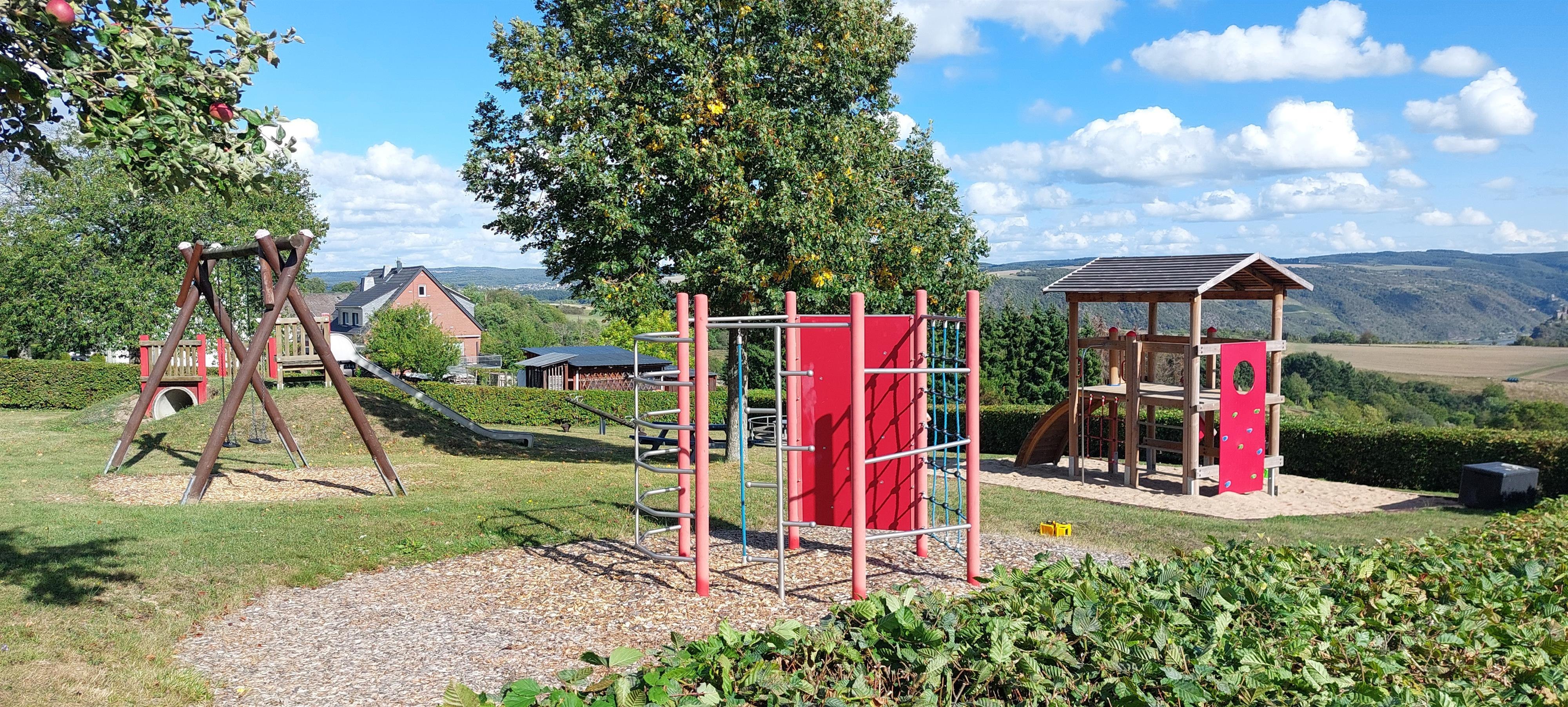 Schöner, gepflegter Kinderspielplatz am Ortsrand von Niederburg mit wunderschöner Aussicht auf das Rheintal mit vielen Spielmöglichkeiten.