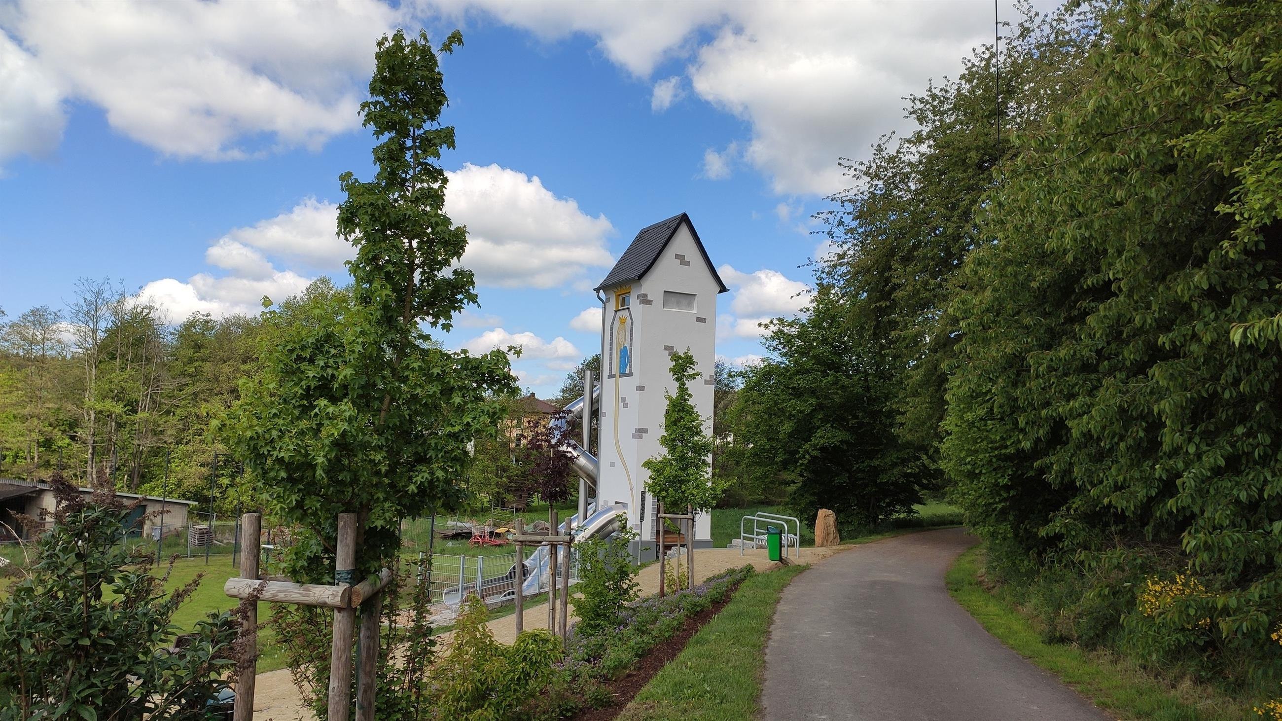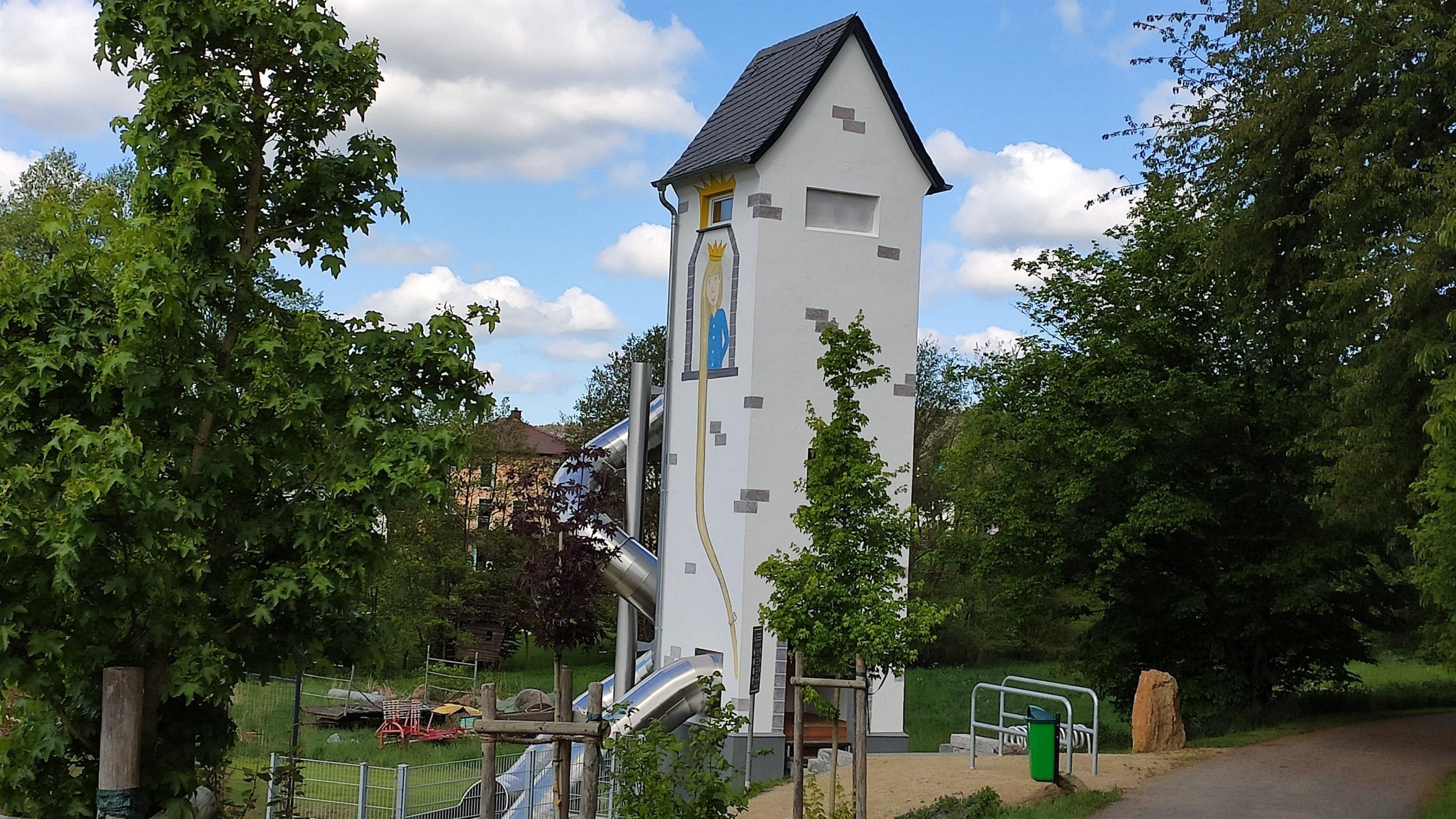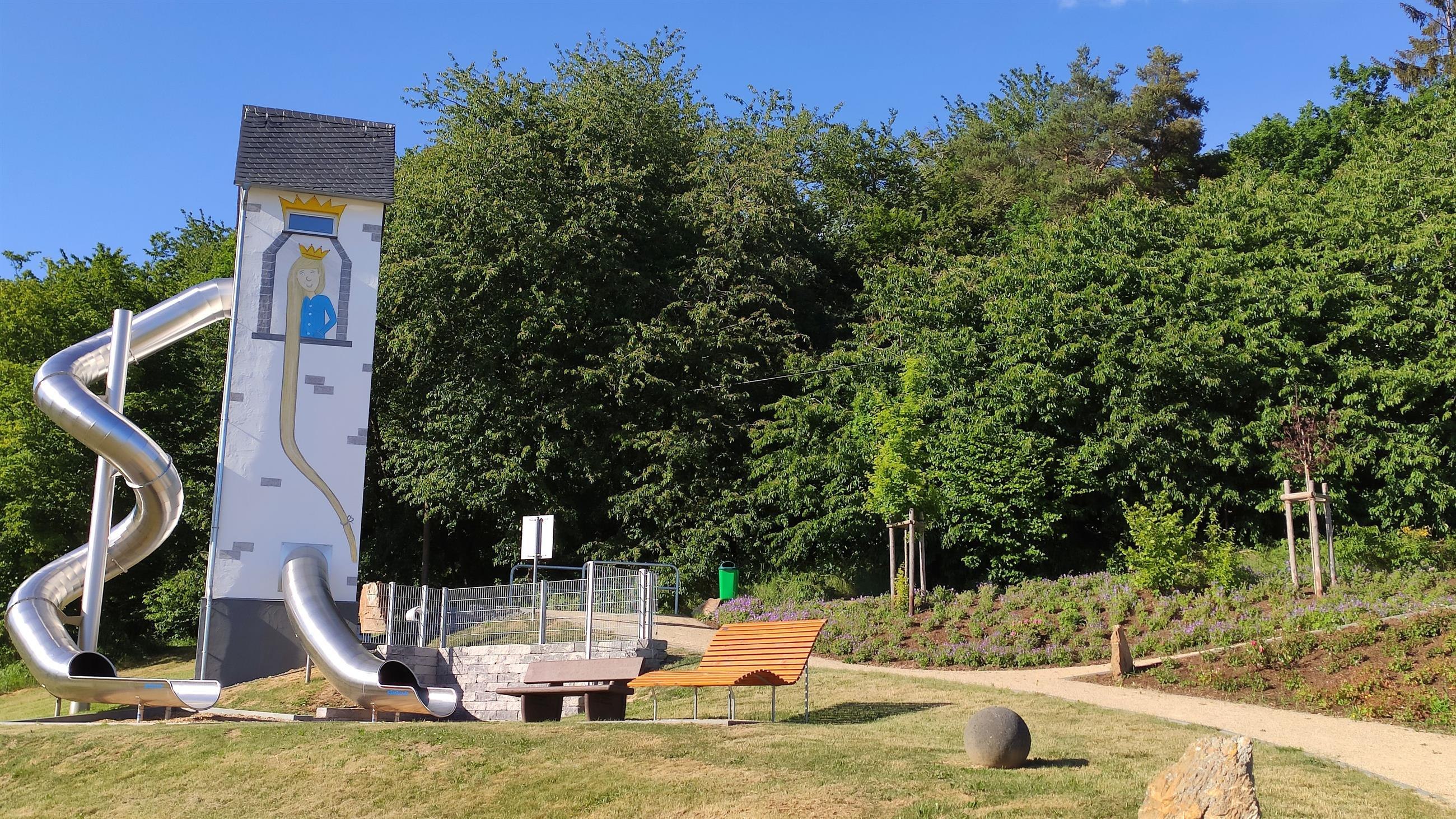 Wunderschöner Spielplatz mit Riesenrutsche vom Rapunzelturm.  Liege- und Ruhebank vorhanden.