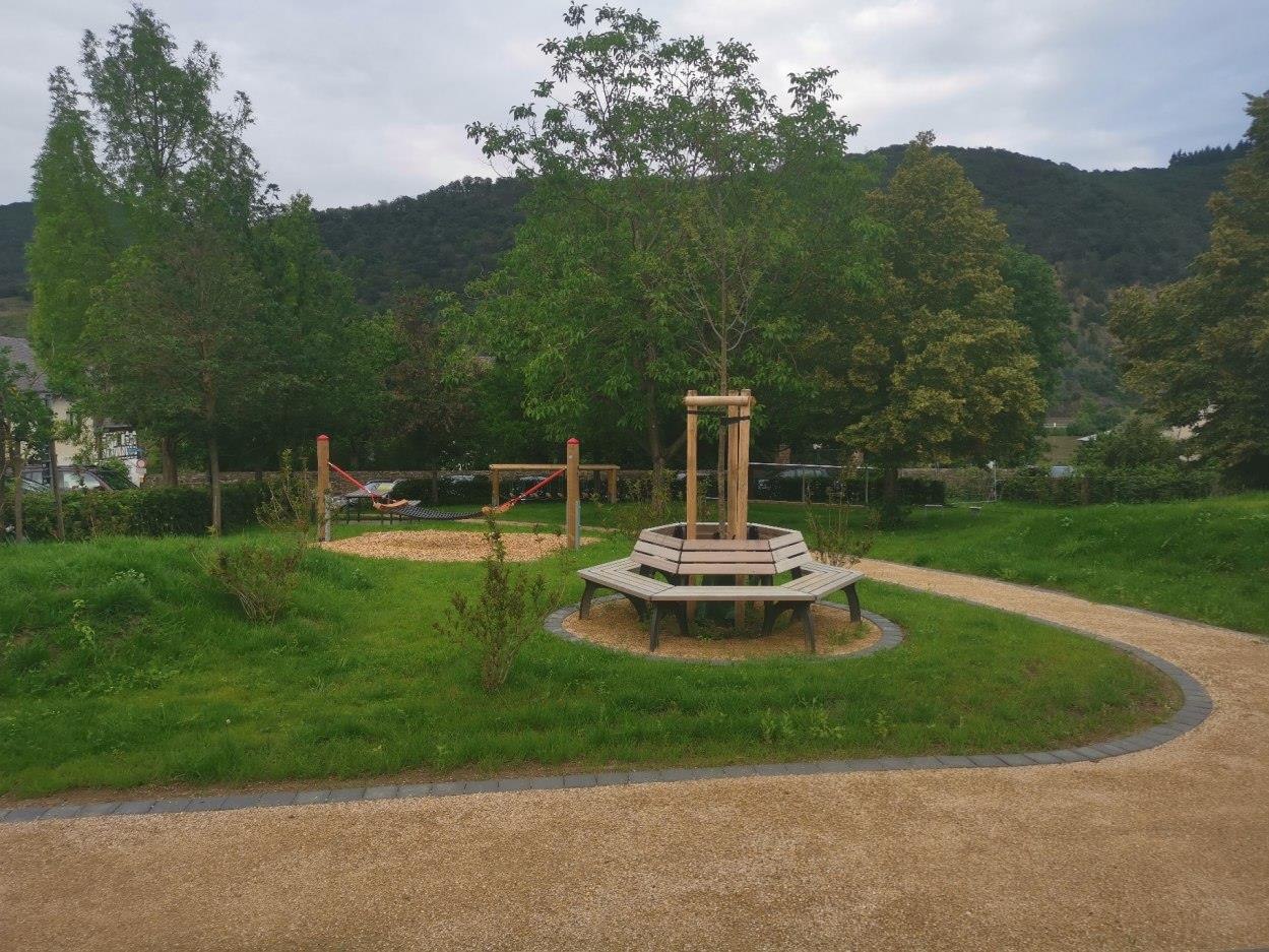 Es ist eine barrierefrei Freizeitanlage mit einer Spielfläche für Kinder, Bouleplatz und einer kreisrunde Freilichtbühne sowie eine zugehörige Sitz-Terrasse.