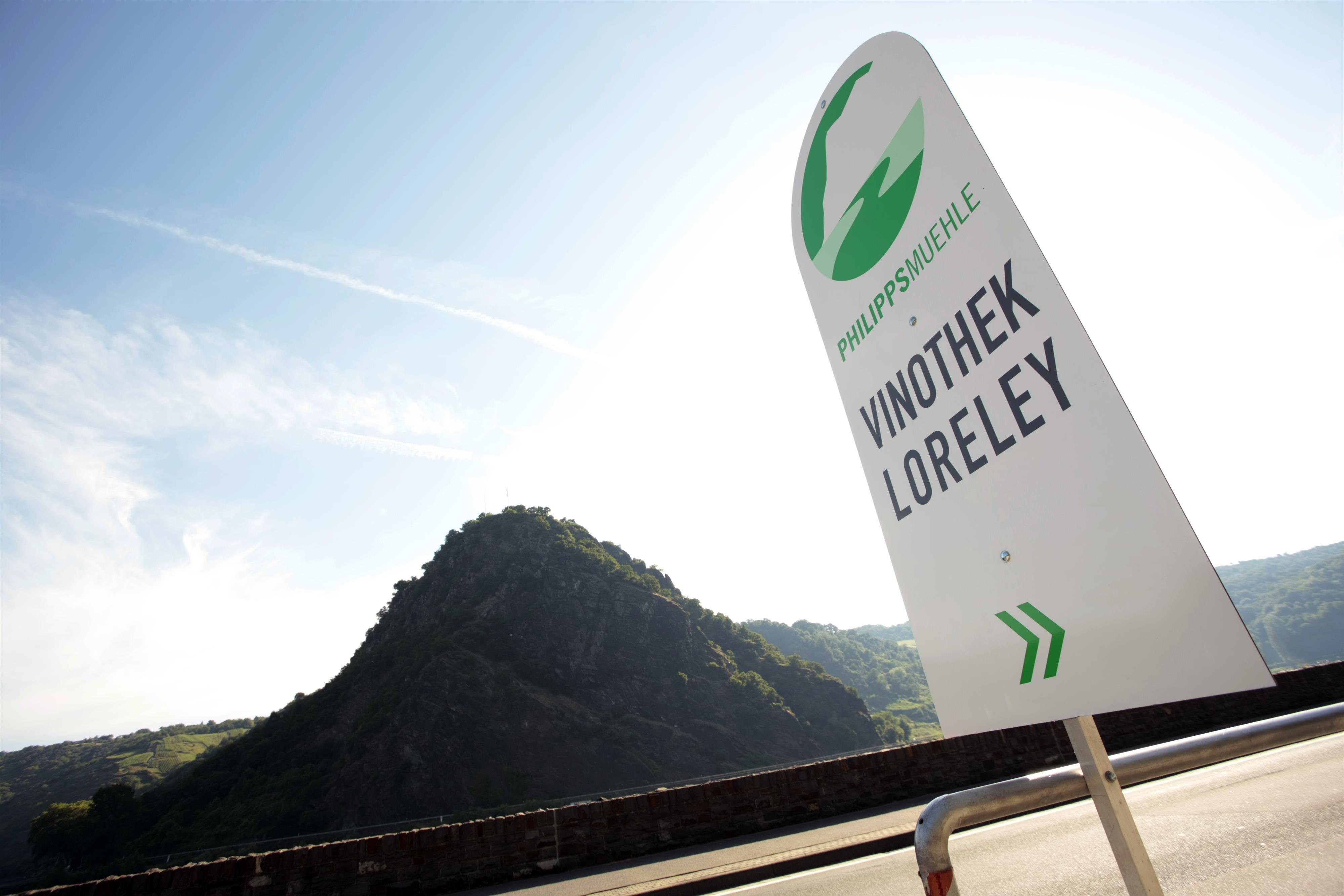 Direkt am Rheinufer bieten wir Weine der Philipps-Mühle zu Verkostung und Verkauf. Neben den eigenen Weinen führen wir Spirituosen und Brände, spannende Bücher und nette Accessoires. Oder genießen Sie Wein oder Kaffee und Kuchen gleich hier im Café, mit Blick auf 1,5 km Rhein und den sagenumwogenen Loreleyfelsen.