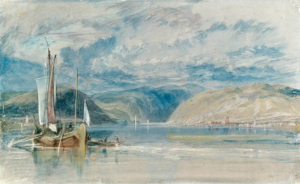 Vom Reinufer aus blickt Turner am späten Nachmittag des 25. August 1817 zurück ins »Binger Loch«. Das Aquarell zeigt im Vordergrund ein Schiff, wie sie typisch für die damalige Zeit waren. Rechtsrheinisch ist die Stadt Rüdesheim auszumachen, dessen Gebäude sich im Fluss spiegeln. Linksrheinisch ist Bingen, bewacht von Burg Klopp, noch zu erahnen. . Burg Ehrenfels ist nur angedeutet. In weiter Ferne erahnt man den Mäuseturm, der ursprünglich als Zollwachturm auf einer kleinen Rheininsel erbaut wurde. Turners Gemälde deutet durch die tiefschwarzen, bedrohlichen Wolken über der Flussenge am Binger Loch das gefährliche Fahrwasser an. Im Vordergrund jedoch liegen auf ruhigem Gewässer Boote mit bewegungslosen Segeln und Fahnen. Von Bingen aus setzt Turner seine weitere Reise mit dem Schiff in Richtung Mainz fort. Der Mäuseturm ist nur zu ausgewählten Terminen zu besichtigen.