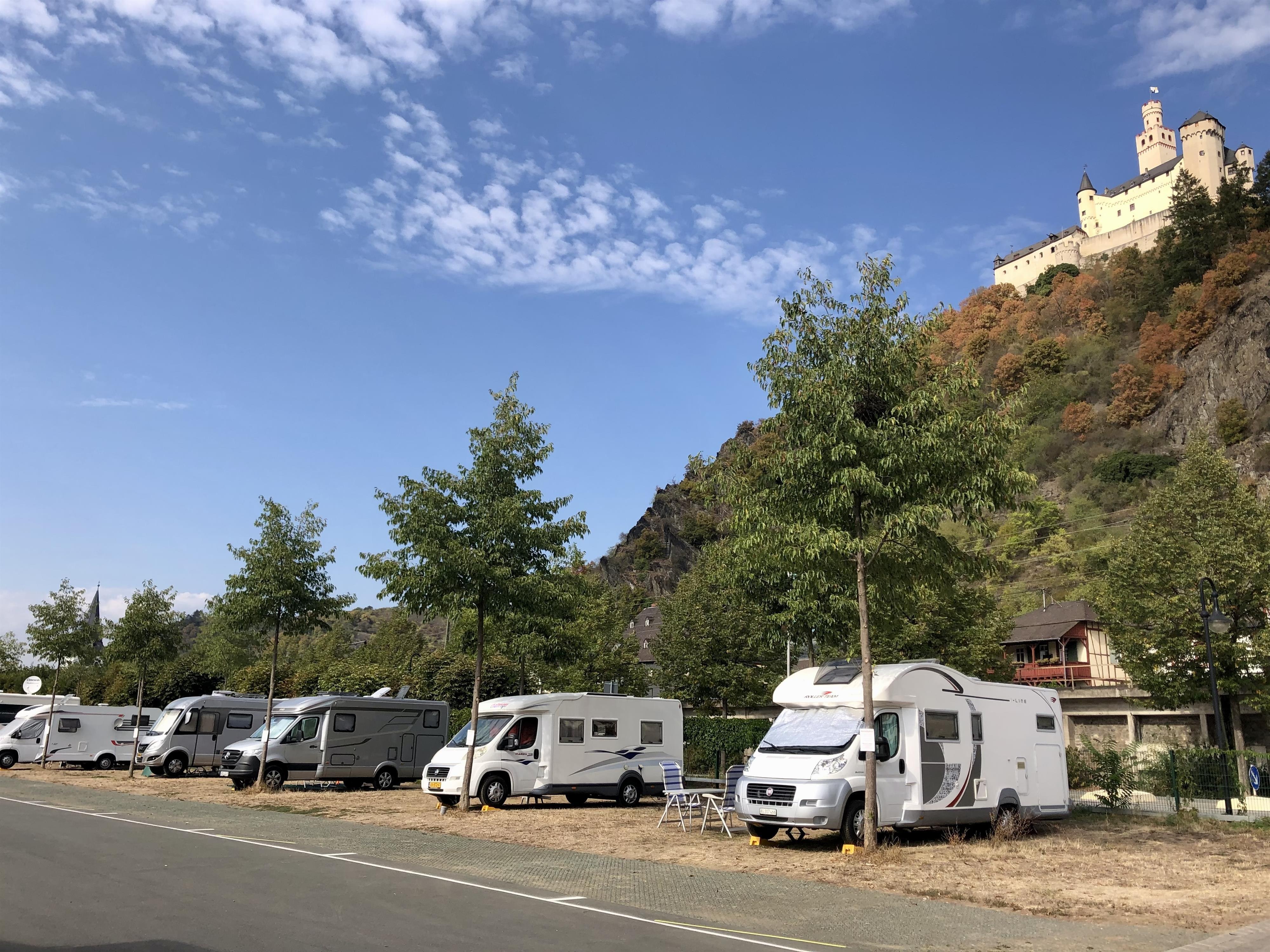 Seine Lage direkt am Rheinufer und der beeindruckende Blick auf die Marksburg machen den überwiegend asphaltierten Stellplatz zu einem beliebten Reiseziel für Wohnmobile aus Nah und Fern.