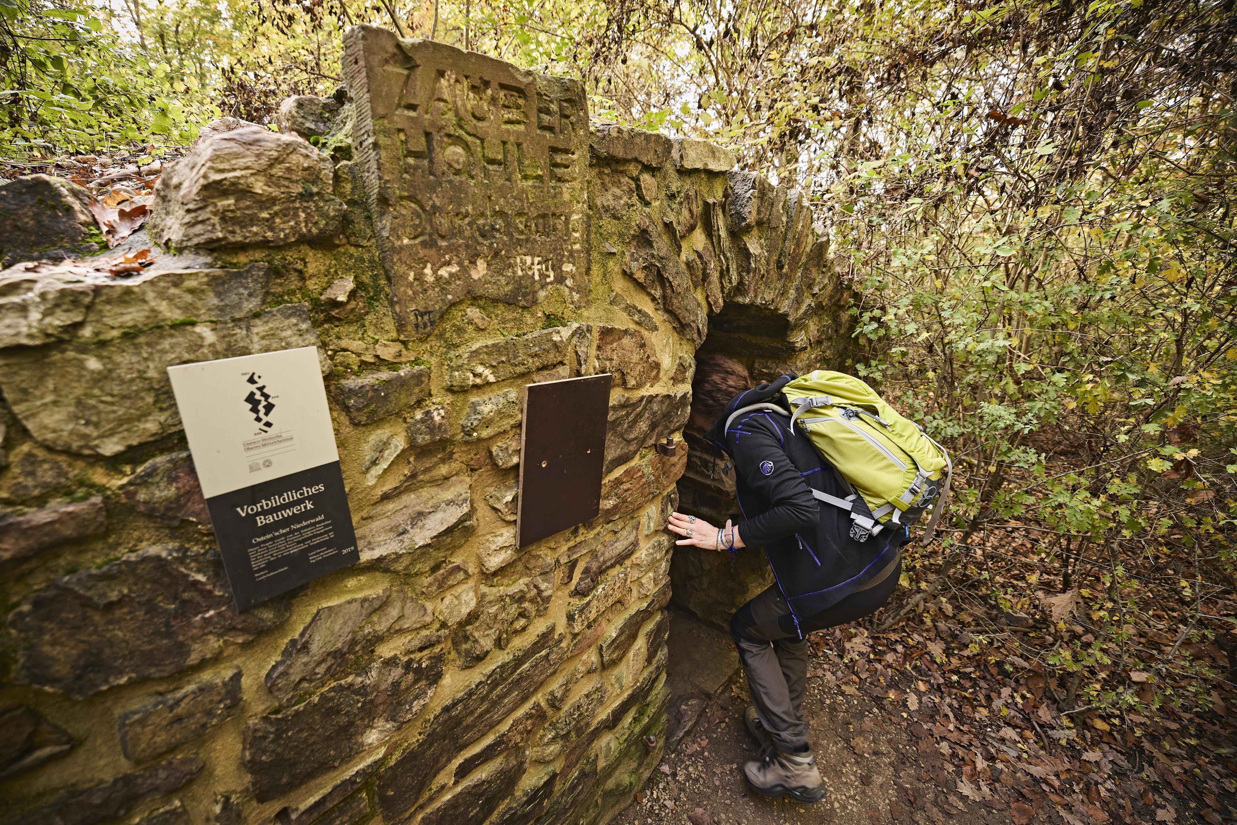 Die Zauberhöhle wurde um 1790 erbaut und ist ein ummauerter Gang von etwa 60 m Länge, dessen Wände ursprünglich mit glitzernden Glassteinen verziert waren. Der unbeleuchtete Gang mündet in einer Rotunde, der „Zauberhütte“. Trat man nach dem Verwirrspiel des halbdunklen Gangs in die Zauberhütte, so öffnete sich dem Besucher die Sichtschneise zum Rhein hin – wie in einer Zauberwelt der Natur.