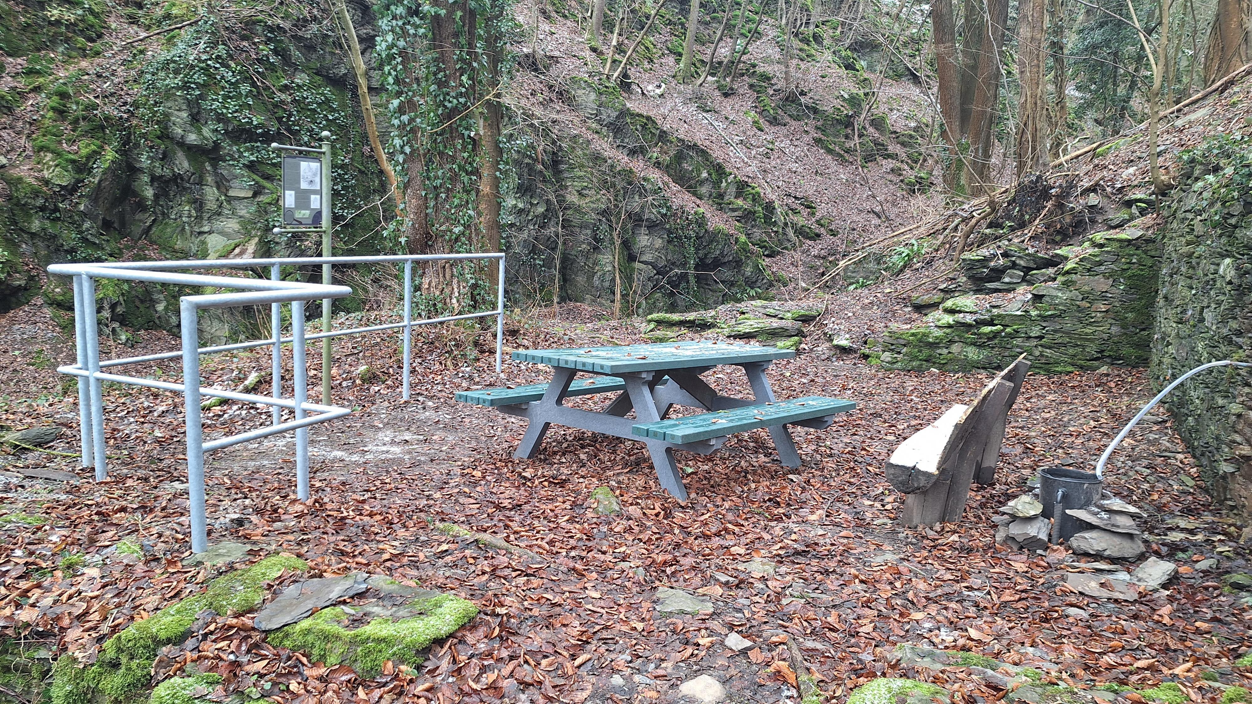 Old mill ruin along the hiking trail "Werlauer-Pilz" in the Heimbachtal with picnic bench.