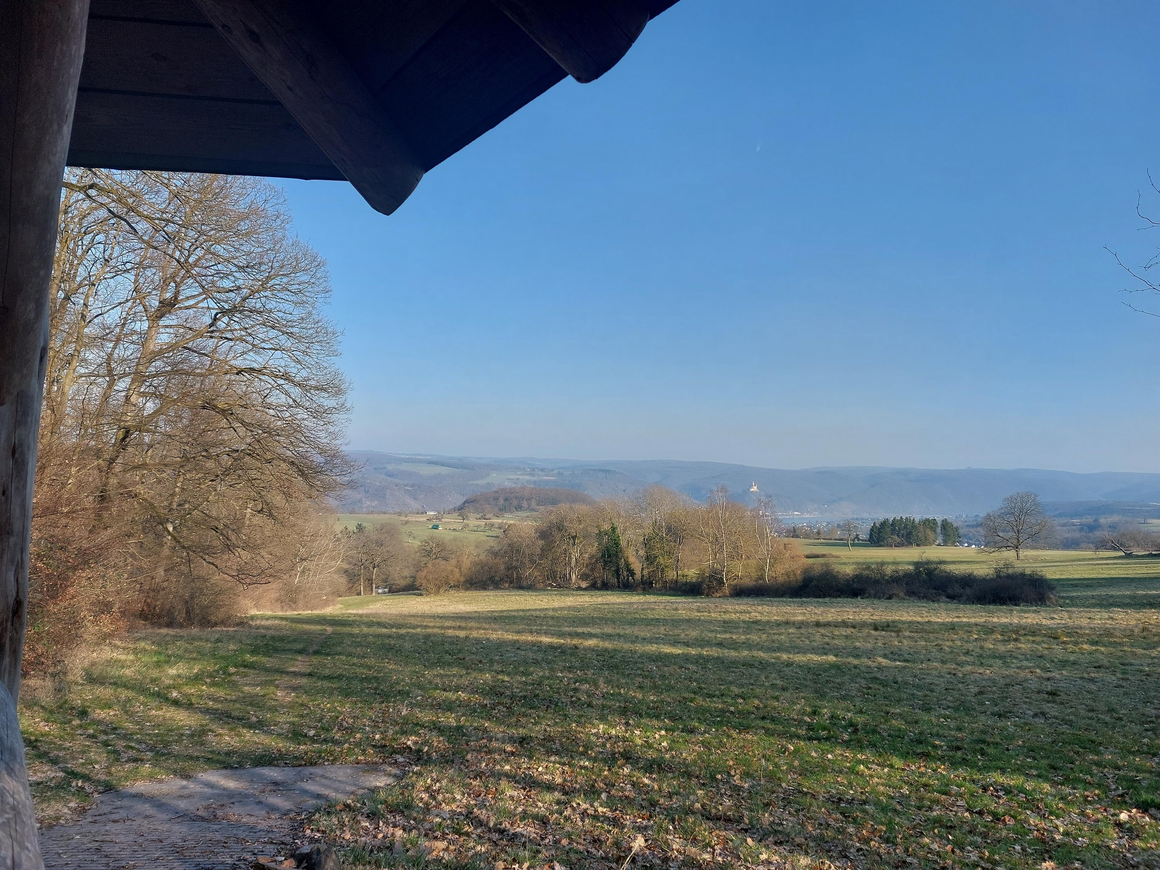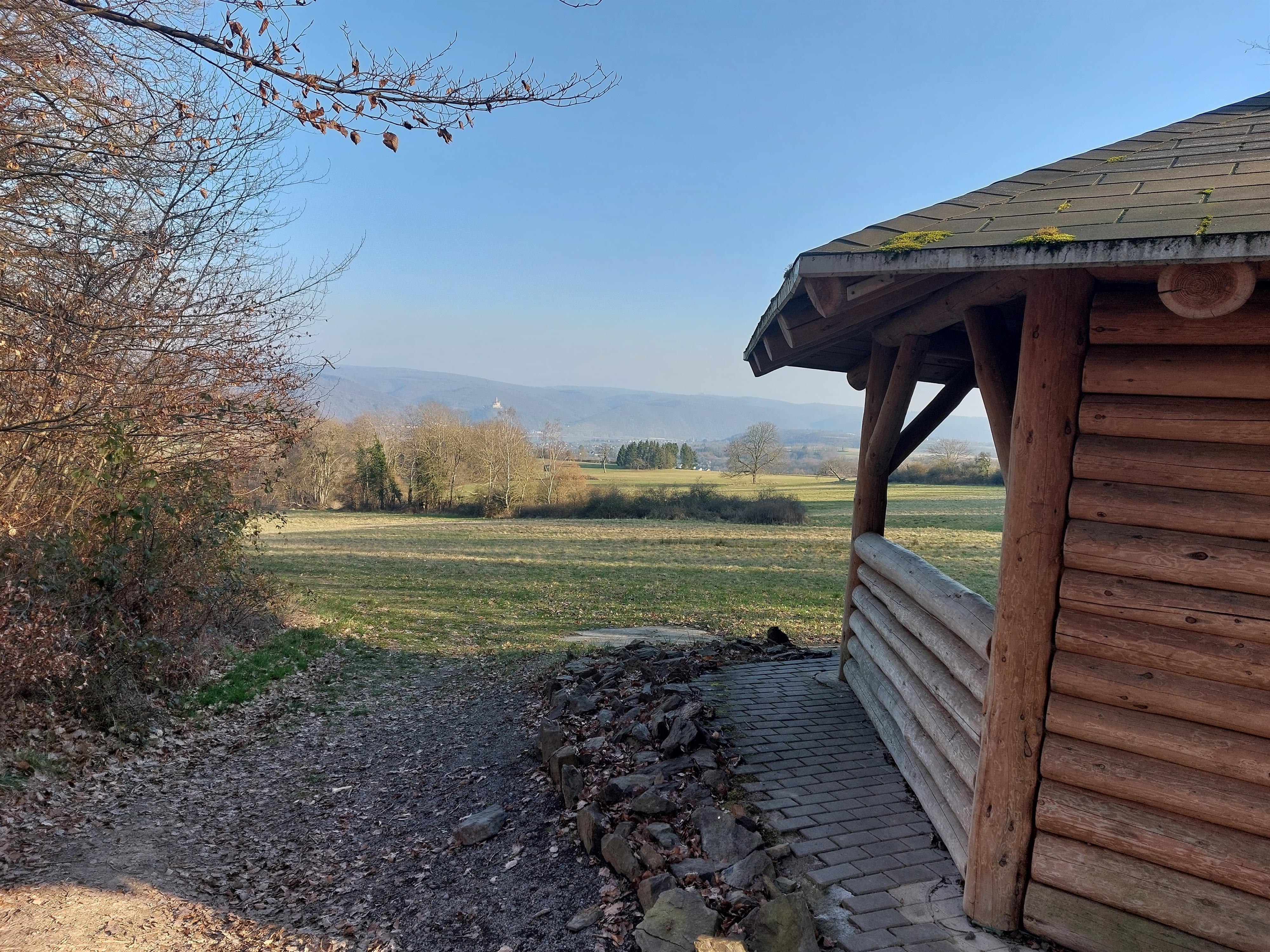 The hiking shelter Rheintalblick can be reached after 3.5 km of the hiking trail Traumpfad Wolfsdelle. From here, you have a wonderful wide view of the surrounding fields, the Rhine Valley, and the Marksburg.