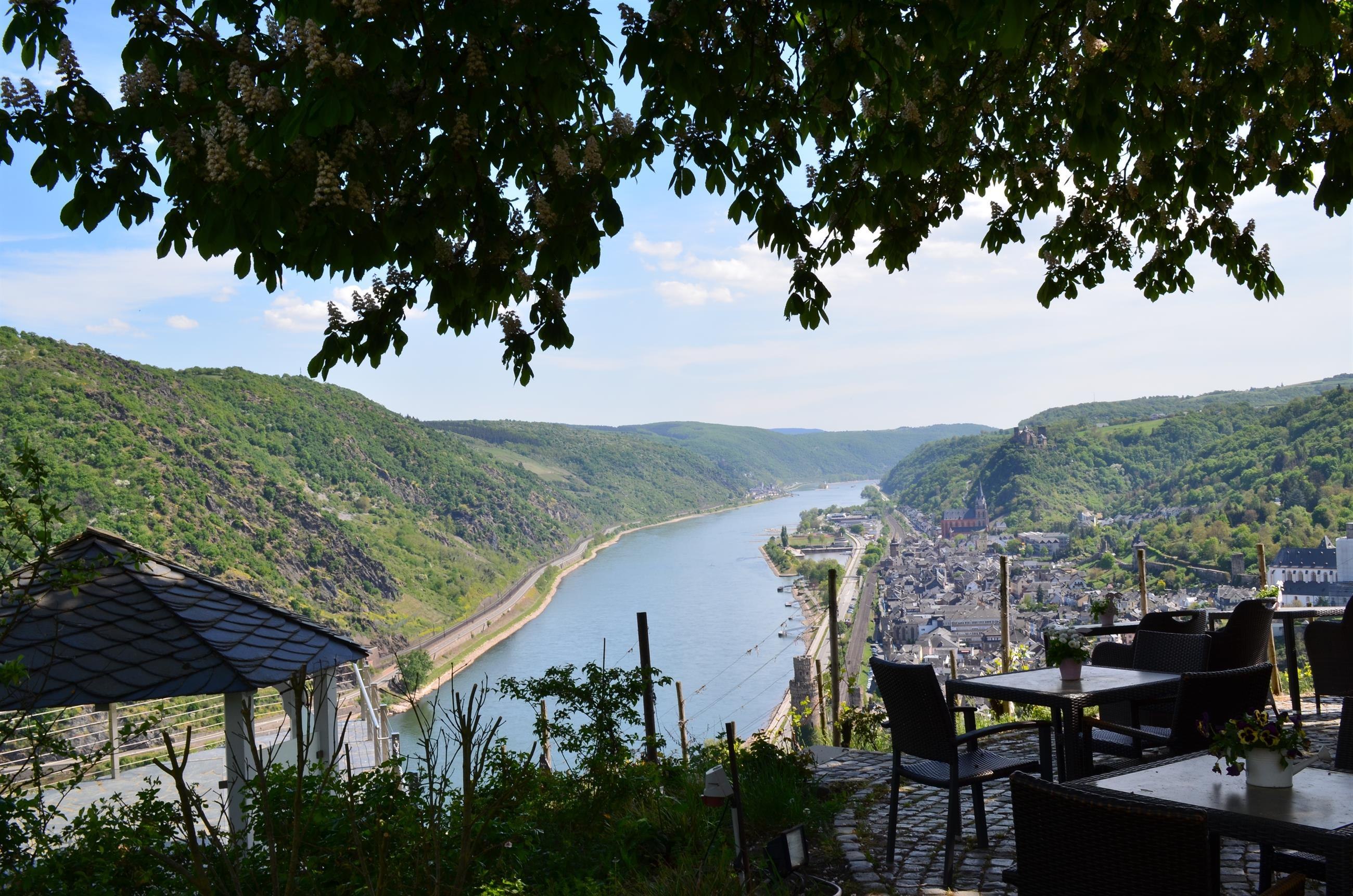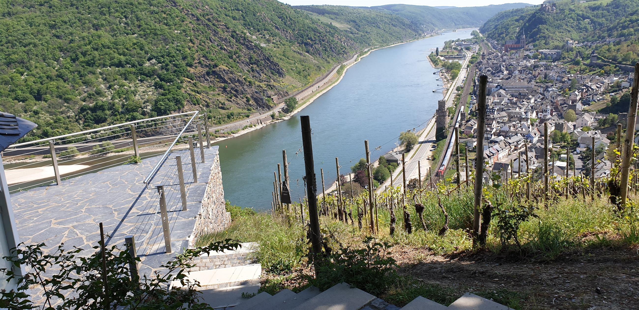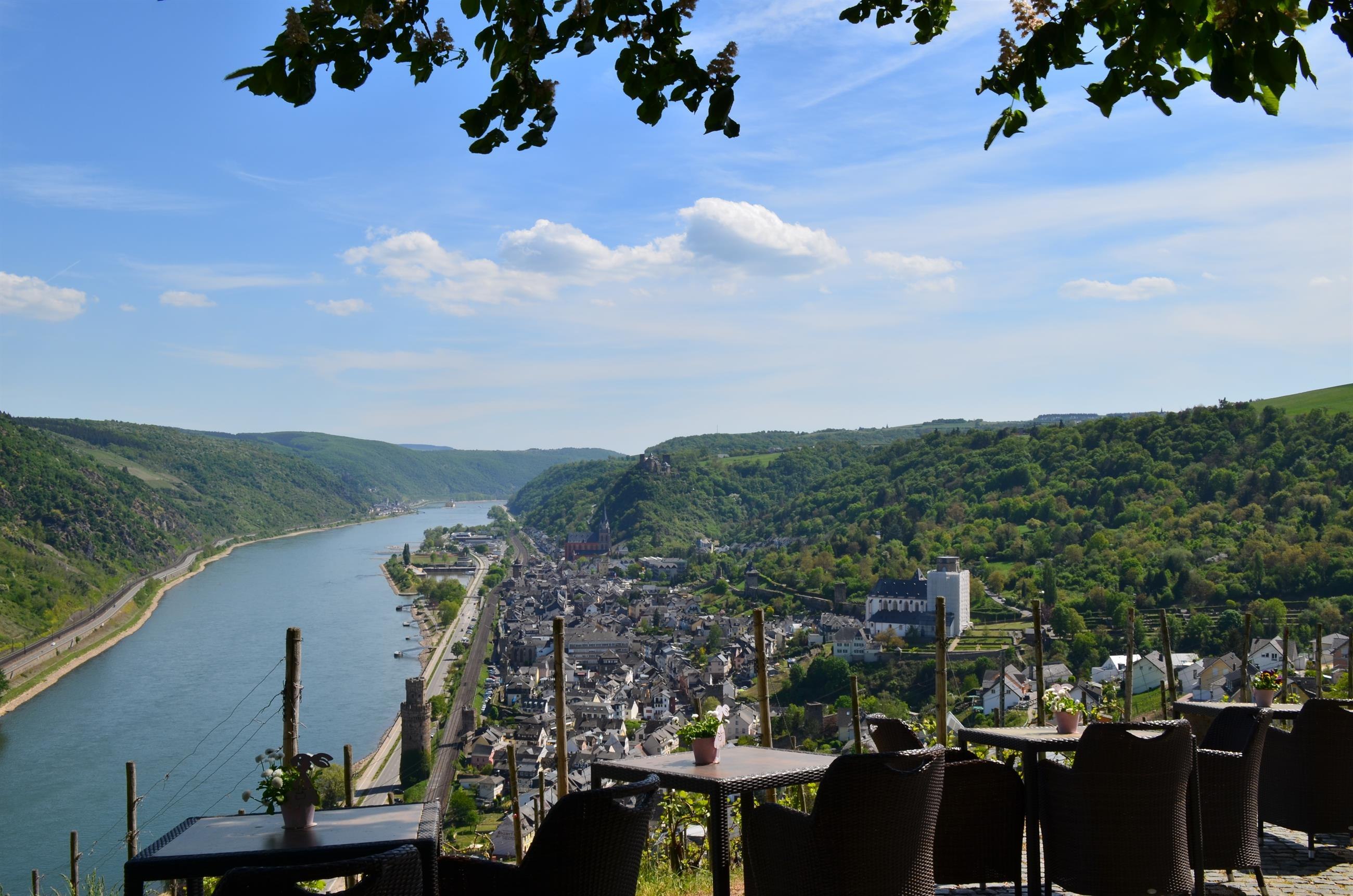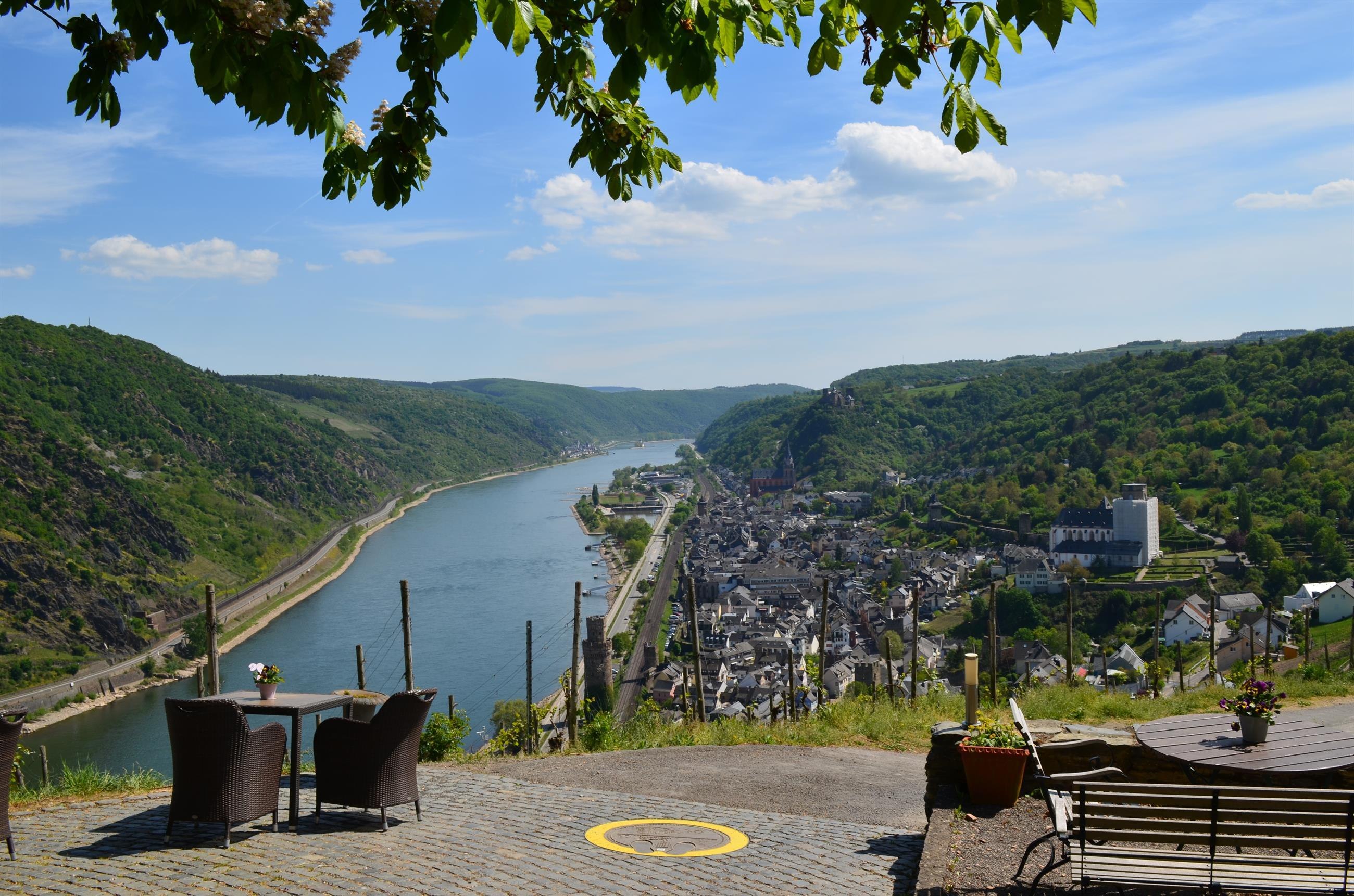 Magnificent view of the Rhine Valley, with the castles Schönburg, Pfalzgrafenstein, and Gutenfels as well as the town of Oberwesel. According to a legend, during low water, the Seven Maidens (rock formation) rise from the Rhine. Parking lot is about 50 m away. Located directly on the Rhine Castles Hiking Trail.