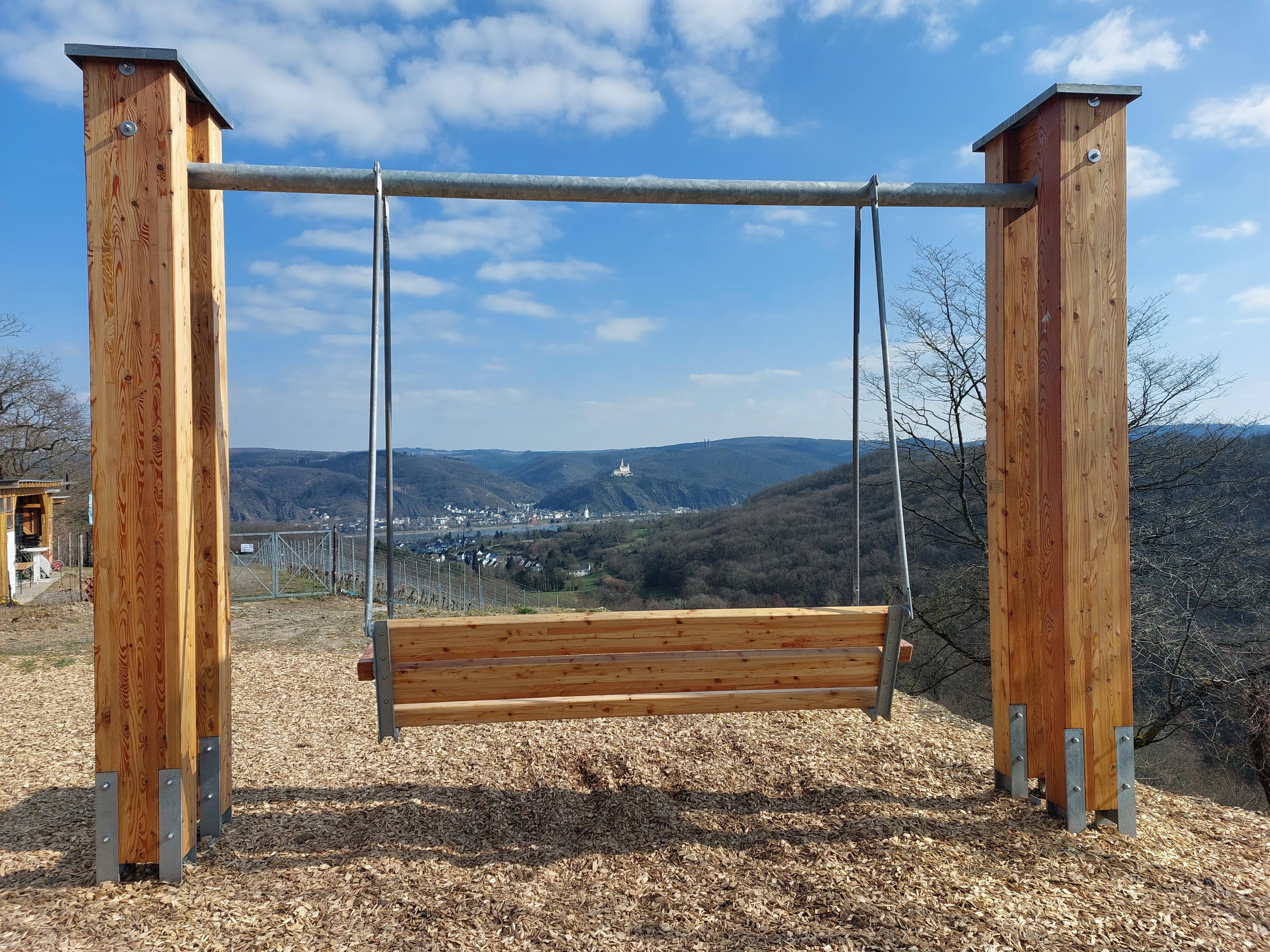 Viewpoint overlooking vineyards, the Rhine Valley, and the Marksburg. Seating options, including a vineyard swing, invite you to linger.