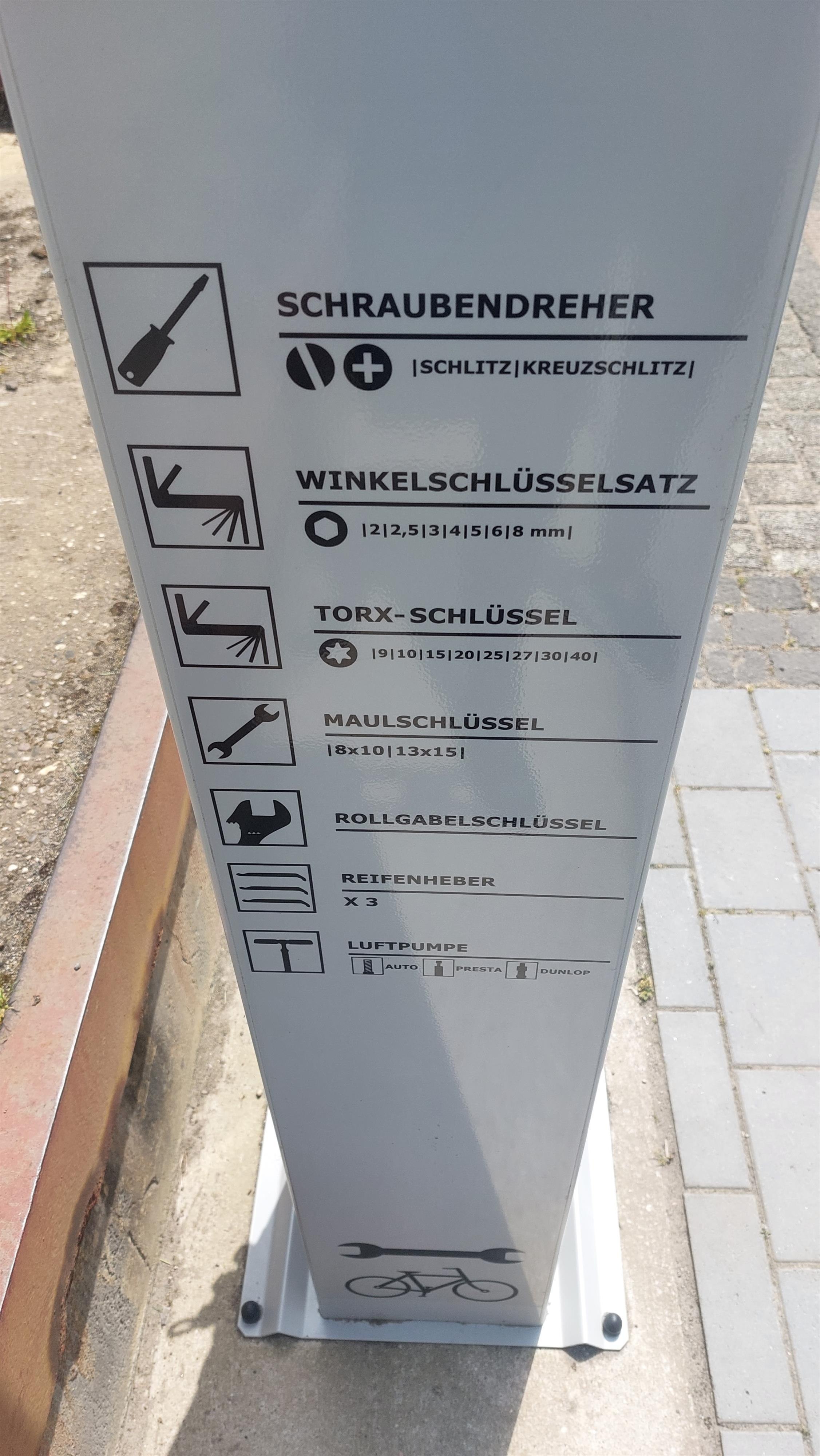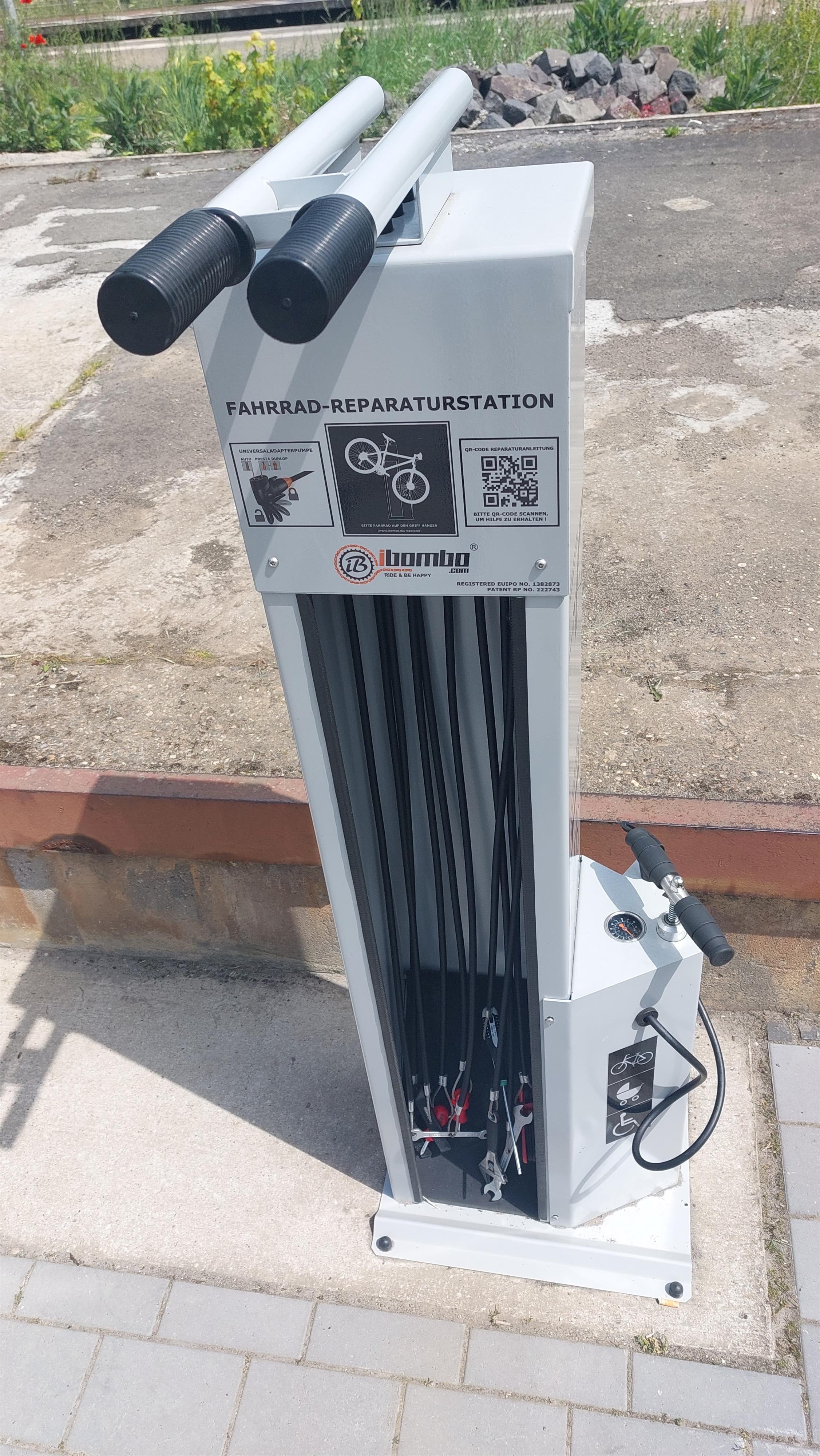 The bicycle repair station has the most important tools needed for simple repairs of the most common bicycle breakdowns.