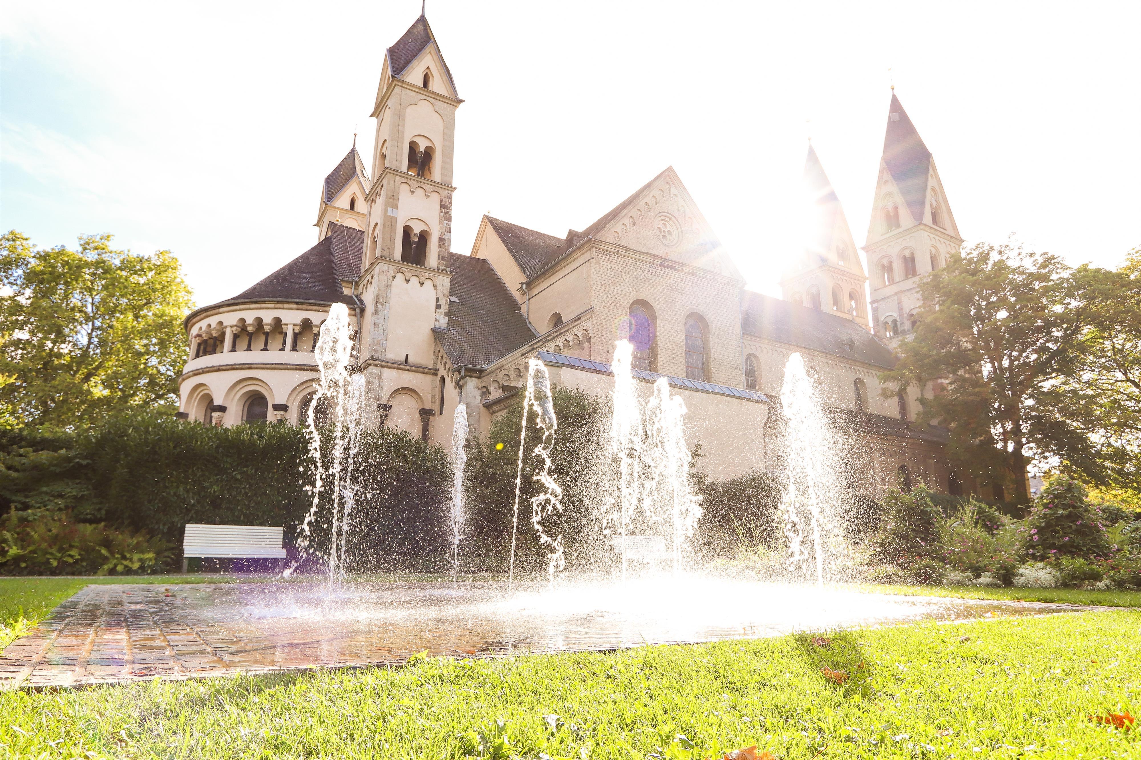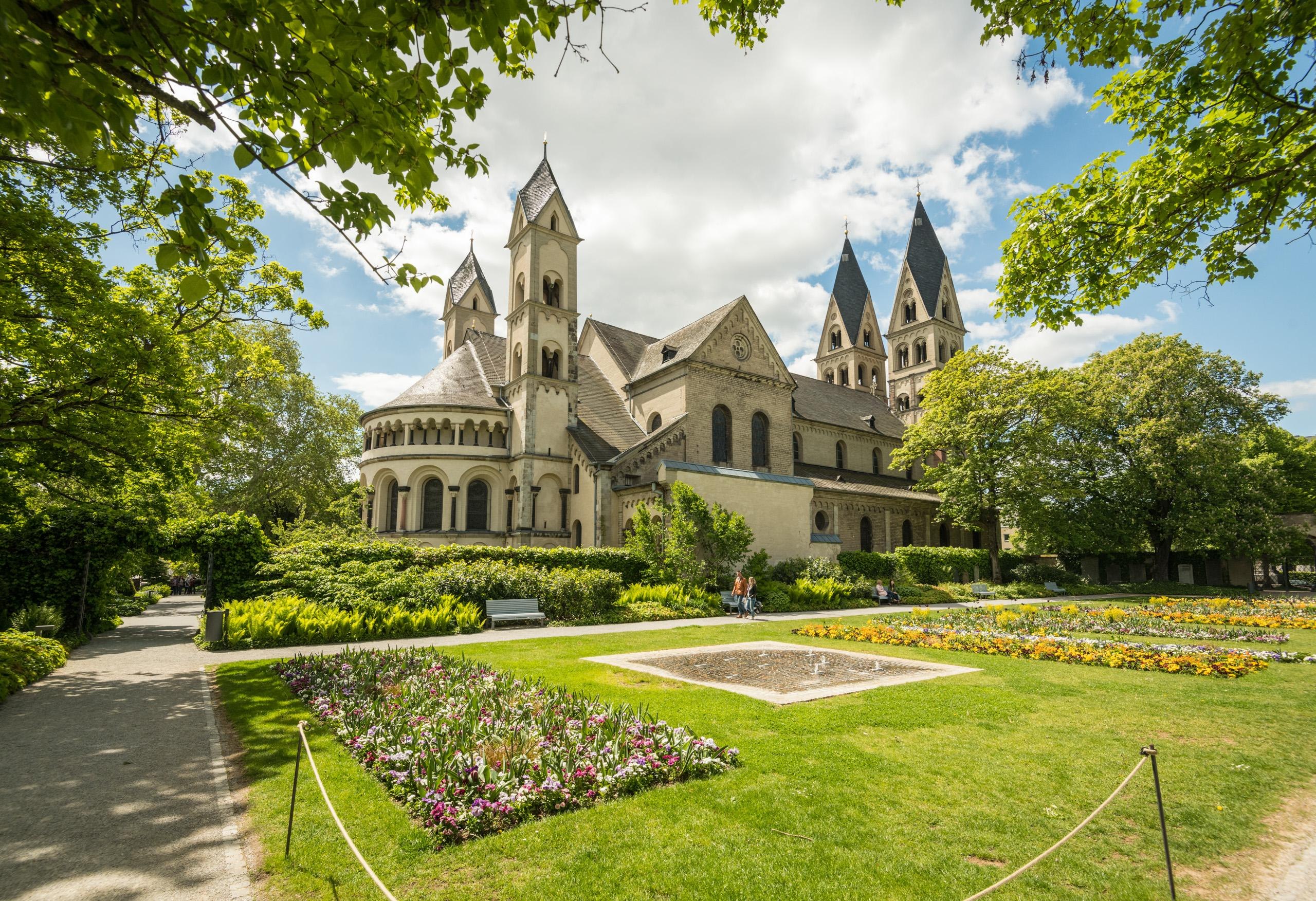 The Blumenhof is located not far from the culturally rich town at the confluence of the Rhine and Moselle rivers and spreads out around the Basilica of St. Kastor. The grounds are divided into three areas that were redesigned for the BUGA 2011. The courtyard of the Deutschherrenhaus/ Ludwig Museum with the former chapel, the "Sculpture Garden", is the place where art and sculptures are presented in the context of the museum. The "Blossom Garden" between the Ludwig Museum and St. Kastor expresses joie de vivre with its two water fountain fields and colourful planting areas. The southern courtyard of the Kastor Church, as the quietest place in the Blumenhof ensemble, picks up on the theme of "hortus conclusus" (Latin for closed garden). Symbolic of the Blessed Virgin Mary, the "Garden of Paradise" was designed as a quiet place enclosed by hedges with selected plants from the symbolism of Mary around a water basin that symbolises purity.