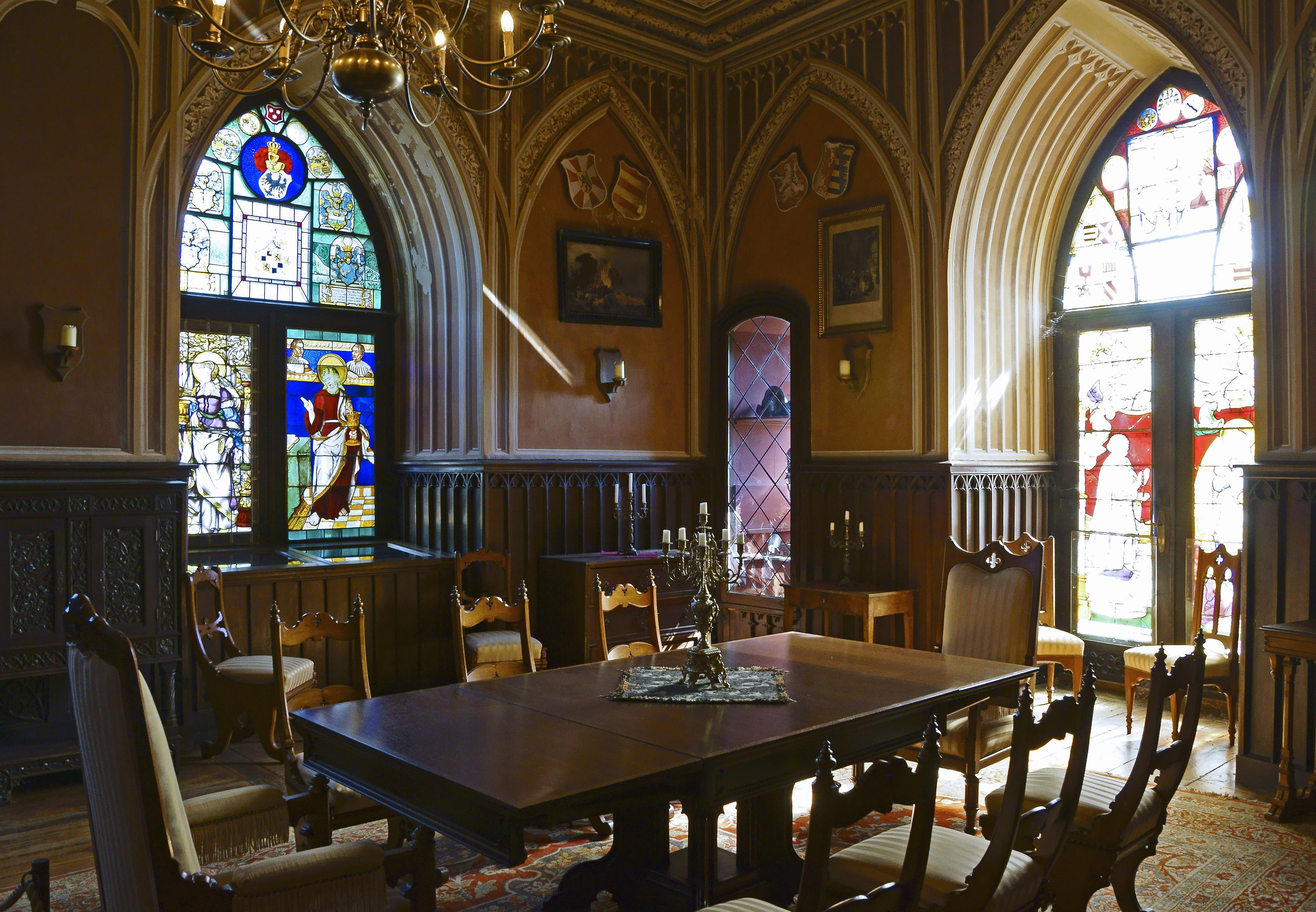 Rheinstein Castle is a reconstructed hillside castle on the steep slope of the Bingen Forest to the Rhine Valley. It is located about one kilometer south of Trechtingshausen, 90 meters above the Rhine. The medieval castle was built between 1306 and 1320 as a residential tower with an integrated shield wall to secure the Mainz territory, together with the Mainz castles Klopp in Bingen, Ehrenfels in Rüdesheim and Heimburg in Niederheimbach. Rheinstein Castle is the first rebuilt castle of the 19th century. Prince Frederick of Prussia had the ruins of the medieval castle extended from 1825 and furnished to a high standard with stained glass windows, furniture, weapons and spolia. His great interest in the Middle Ages and his enthusiasm for castles and ruins were consistently realized here. Rheinstein marked the beginning of the "romantic reconstruction" of numerous Rhine castles that had previously been destroyed in the Thirty Years' War, the Palatinate War of Succession and by Napoleonic rule. The reconstruction was carried out until 1829 with the participation of Karl Friedrich Schinkel according to the plans of the Koblenz building inspector Claudius von Lassaulx by the architect Wilhelm Kuhn. Today, the romantic castle Burg Rheinstein with gastronomy, apartments and the castle museum is located in the castle complex. The rooms of the castle museum of Rheinstein Castle convey an impression of aristocratic living culture at the time of Prince Frederick of Prussia. He had the castle ruins extended as a summer residence from 1825. Among the special features of the rooms are the wall and ceiling paintings by the Düsseldorf painter Ludwig Poser. He painted almost all the living rooms with illusionistic tracery decorations. The historicizing tiles, doors, fittings and paneling in the rooms testify to good craftsmanship and the prince's enthusiasm for the Middle Ages. Antique furniture from the 17th and 19th centuries, as well as armor and armory from the 15th century are other components of the décor. The museum is open daily from March 15 to November 1 and on Saturdays and Sundays during the winter months. The neo-Gothic chapel of Rheinstein Castle was built in 1839-44 south of the castle, outside the medieval ring wall on a high substructure. Prince Frederick of Prussia arranged for its construction because he wanted to be buried at his favorite place, Rheinstein Castle. The graceful chapel features a filigree gable facade and a rich tympanum, a sculpted archway above the lintel of the entrance. A finial adorns the roof above the gable of the façade, and gargoyles in the shape of dragons are placed on top of the tall, copper-framed ridge turret. In the basement of the chapel there is a crypt with the coffins of the prince, his wife Luise and his son George. An outside staircase leads down the side to a window that offers a view into the crypt. South of Trechtingshausen, a steep footpath leads from the banks of the Rhine to Rheinstein Castle. The path is part of a landscape park that was created along with the romantic reconstruction of Rheinstein Castle in the 19th century. An artificial stream with waterfalls and resting benches accompany the ascent to the castle. It passes a large boulder held together and secured with a chain and steel cables.