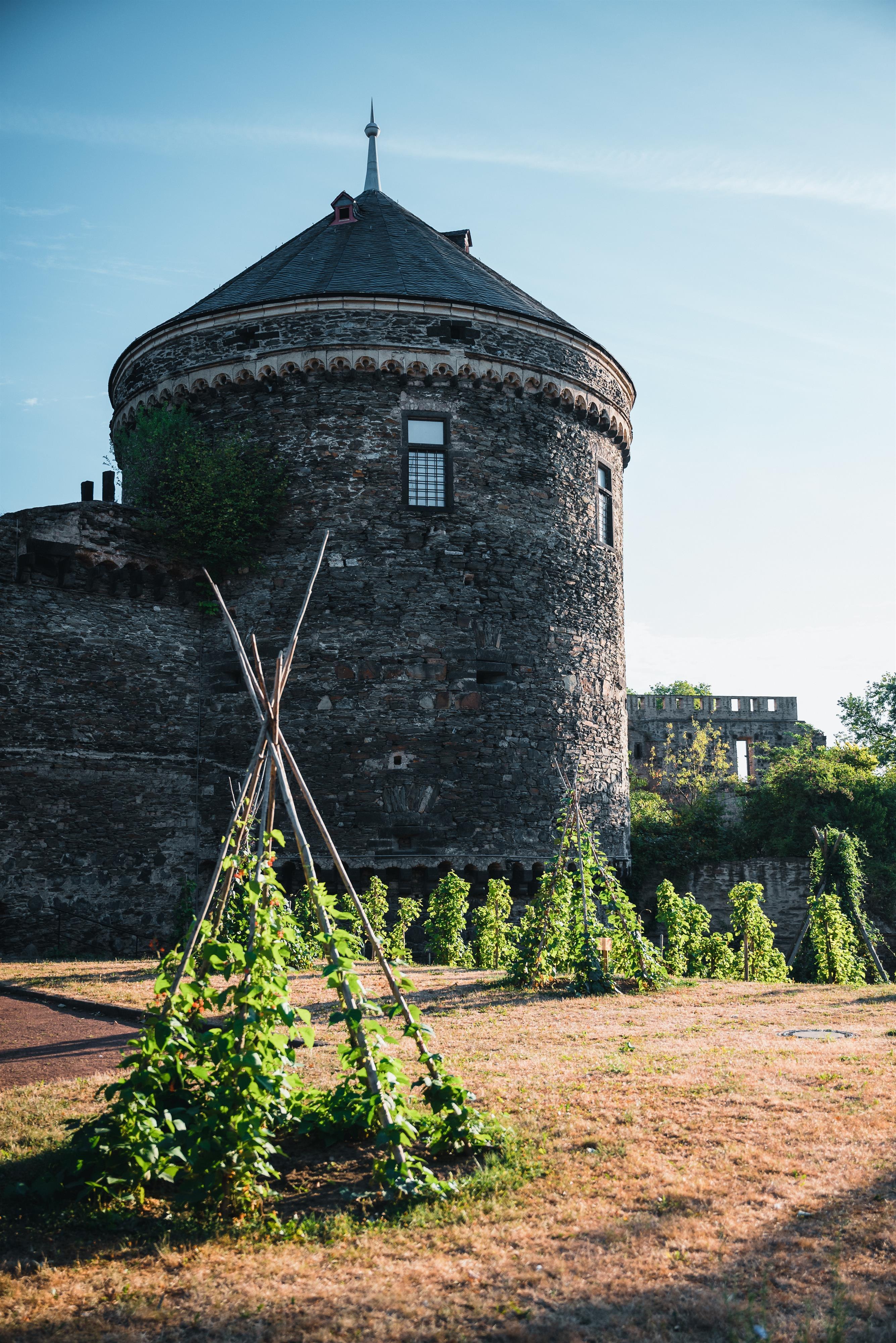 On the one hand, it strengthened the defence power of the city on the outside and, on the other, secured the sovereignty of the Archbishopric over the city against insurgent citizens. It did not always succeed in the latter, however: in 1359 and again in 1365, a “Storm on the citadel” raged as the citizens occupied and took over the complex. During the Thirty Years’ War, there was an invasion of Swedish troops here before the electoral castle was finally destroyed in the Palatine War of Succession in 1689. The top floor of the keep is now used as a romantic wedding chamber. And there is a special feature growing in the shadows of the Castle walls: fruit and vegetable beds run all around the Castle. The garden belongs to the town and therefore to all citizens. Picking is expressly allowed here. This idea gave Andernach the appendage, “the edible city”.