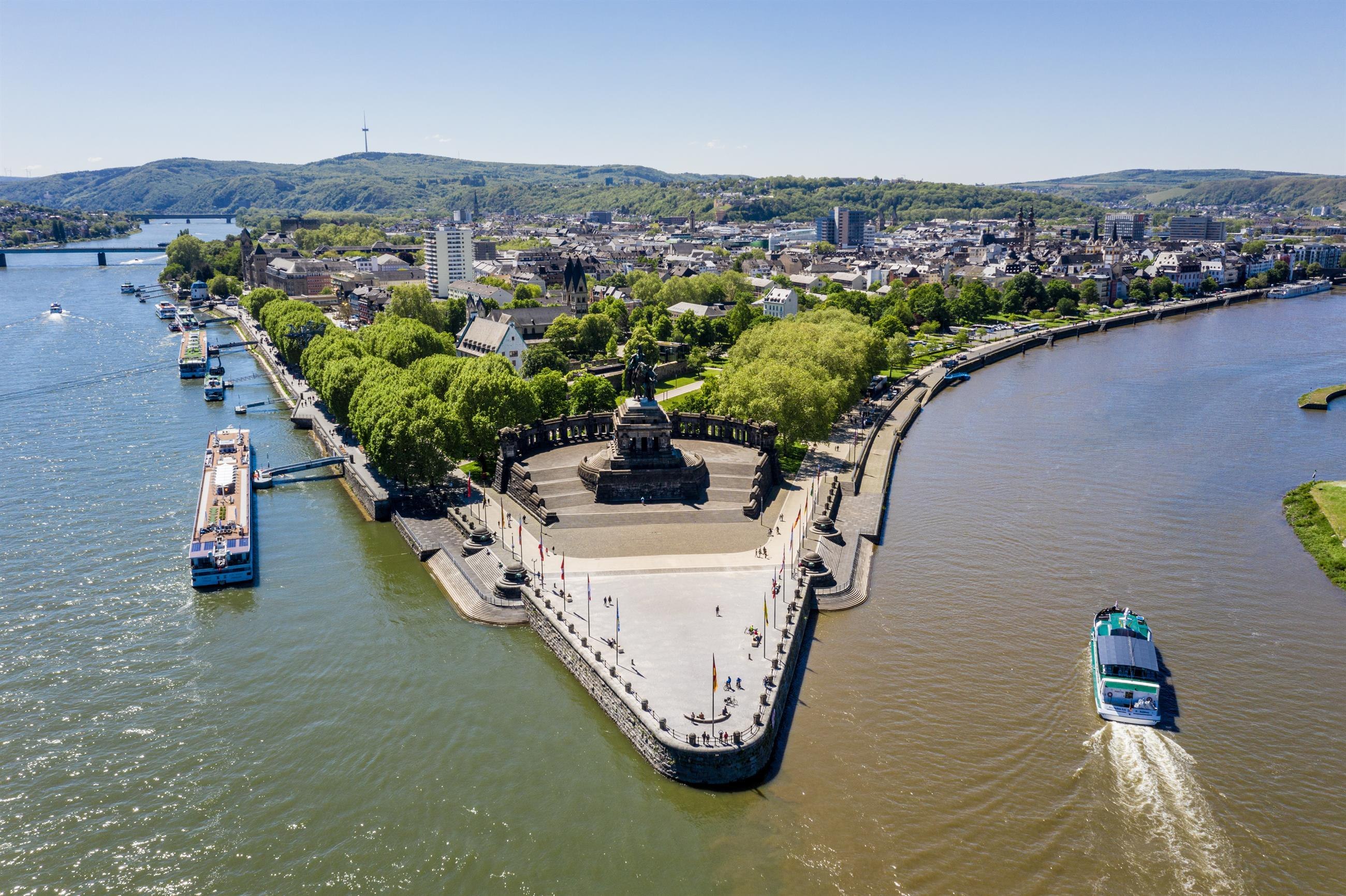 The establishment of the Teutonic Order at the confluence of the Rhine and Moselle in 1216 gave this historic site its name, the “Deutsches Eck” (“German Corner”). Koblenz also owes its name to the meeting point of the Rhine and the Moselle - from “Castellum apud Confluentes”, Latin for “fort at the confluence”, which over time became the current name of Koblenz.