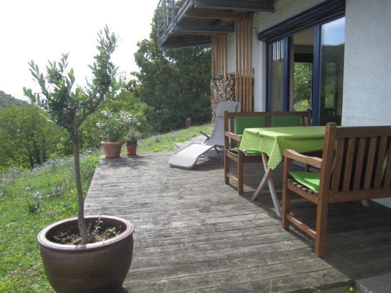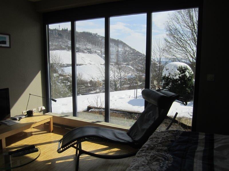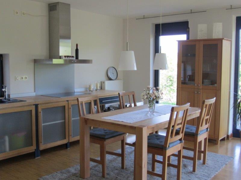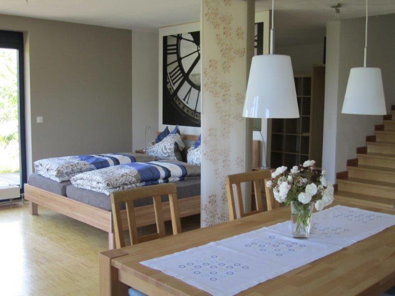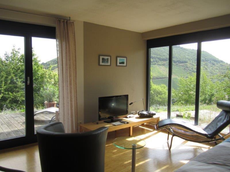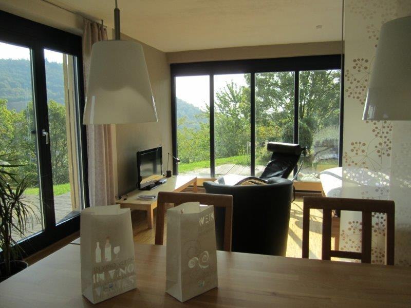New 50 sqm apartment in architect-designed House nearby vineyard at Bingerbrück. Separate entrance, bright spacious living/sleeping area, kitchen, bathroom, 18 sqm terrace overlooking Rhine and Nahe, high level and well cared for facilities, close to town and conviently. English spoken.