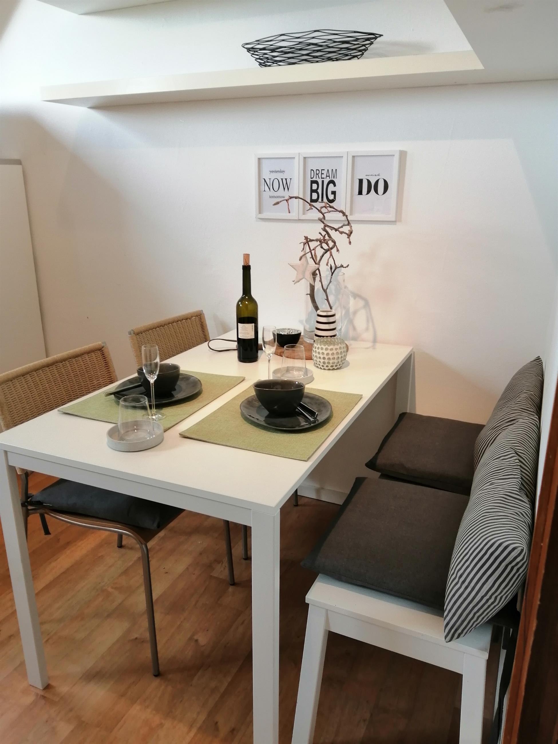 The kitchen is equipped with a stove, refrigerator, coffee maker, dishwasher, toaster, kettle, microwave and all the accessories you need for cooking. The cozy dining area offers enough space for 3 people. A high chair is also available.