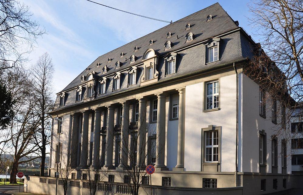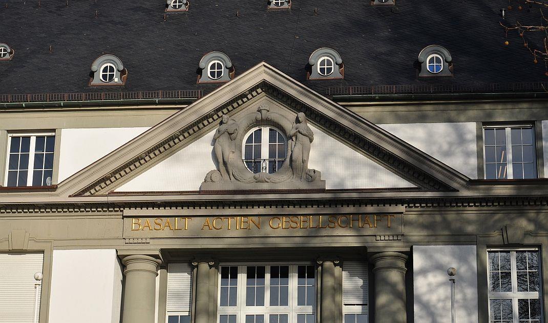 Numerous buildings in Linz were planned by the architects Heinrich Mattar and Eduard Scheler, who had offices in Cologne, Munich and Linz on the Rhine. From 1913 to the mid-1950s, administration buildings, factories, villas and residential buildings with characteristic architecture were built here. The main client in Linz was Basalt-Actien-Gesellschaft, founded in 1888, which was the most important employer in the region at the time. In 1922, the impressive head office of the BAG was completed on Linzhausenstrasse. All architectural parts in the outer area of the monumental neo-baroque building with a mansard roof are made of basaltine, the artificial stone produced by the BAG. The south-east facade facing the station is dominated by imposing columns, on the Rhine side two huge tritons guard the wide flight of stairs to the main portal with balcony. Inside the building, filigree ceiling paintings and pillars and door frames covered with marble-like artificial stone are impressive.