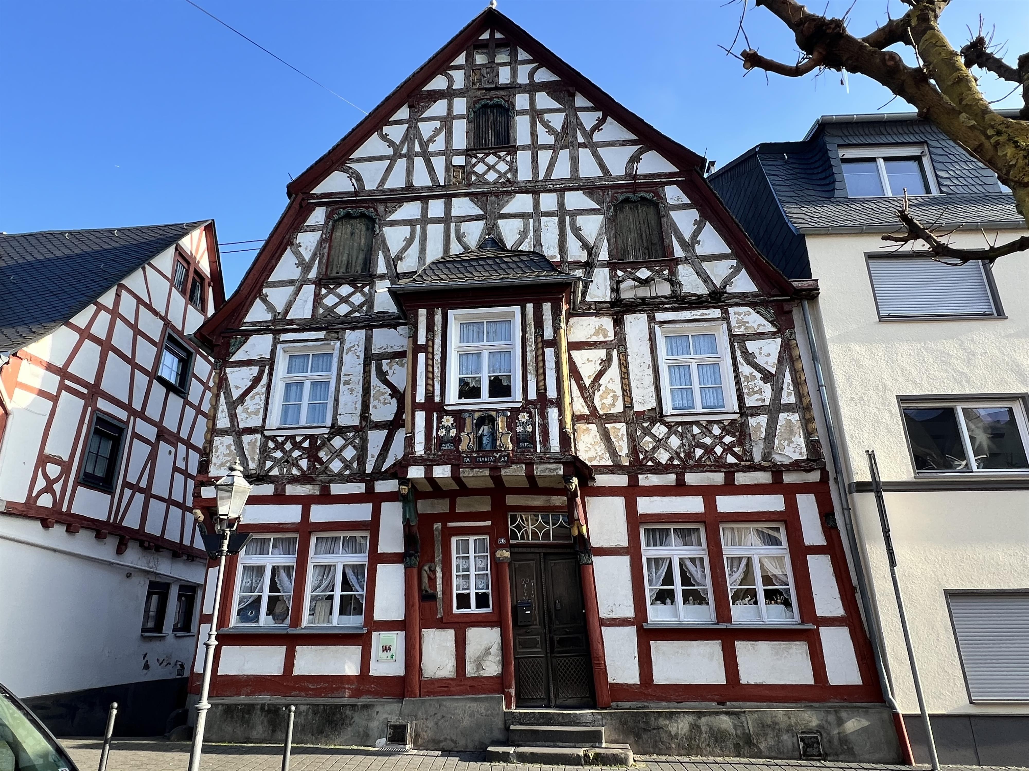 From 1651 to 1685, the church house of the Protestant Reformed congregation of Rhens was located on this very spot. This was a parish hall equipped with benches and a pulpit. After the Electorate of Cologne had decreed the conversion or emigration of the last Protestants of Rhens in 1679, contrary to the provisions of the Peace of Westphalia of 1648, the Protestant tradition of the town of Rhens, which had existed for over 150 years, came to a complete standstill in 1685. In order to remove any outward sign of a confessional division of the town, the pews and pulpit were removed. The building was rented to a blacksmith, but despite all the efforts of the then pastor Daniels, it could not be taken for the Catholic church, because it belonged to the landgraves of Hesse. In 1698 the building burned down - allegedly because the blacksmith had handled the fire somewhat carelessly. Nevertheless, rumors persisted that the schoolmaster had started the fire intentionally. Evidence for this assumption could not or would not be produced. The property with the collapsed cellar of the Lutheran church house remained undeveloped until around 1730 when the Hessian authorities became aware by chance that they still owned a plot of land in Rhens. They sold the building plot to Philipp Altenhofen and donated the proceeds to the new building of the Protestant Reformed congregation in Bad Schwalbach, which the last Protestant pastor of Rhens, Johann Bernhard Delph, had founded in 1685. One may speculate about the history of the little picture of the Virgin Mary, which is located between the initials of the builders in a niche at the bay window. Perhaps it belonged to a wayside shrine that was already in this location before the construction of this house. In that case, like the shrine below Dionysius Church, it would have expressed the triumph of the Catholic Church over Protestantism - all the more so because the Protestants' aversion to the Catholic cult of the Virgin Mary was a popular theme of the 17th century confessional controversy.