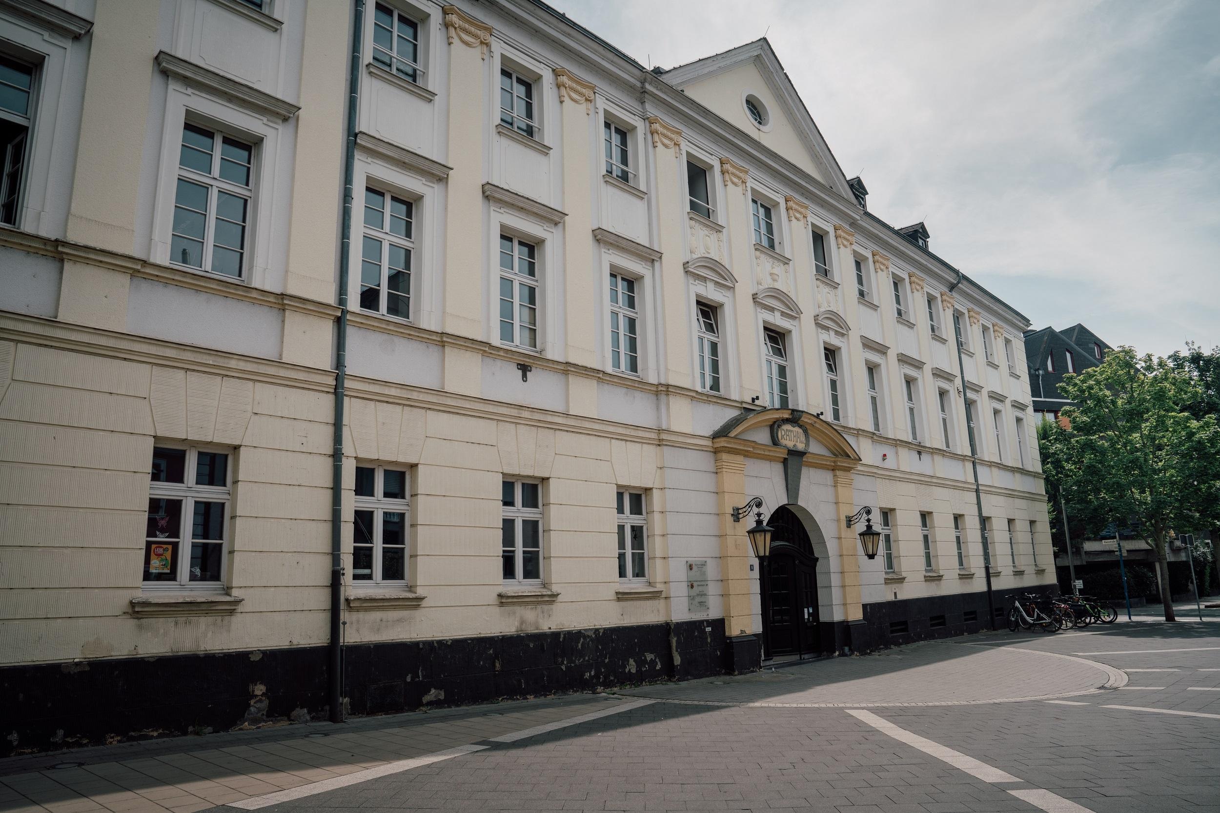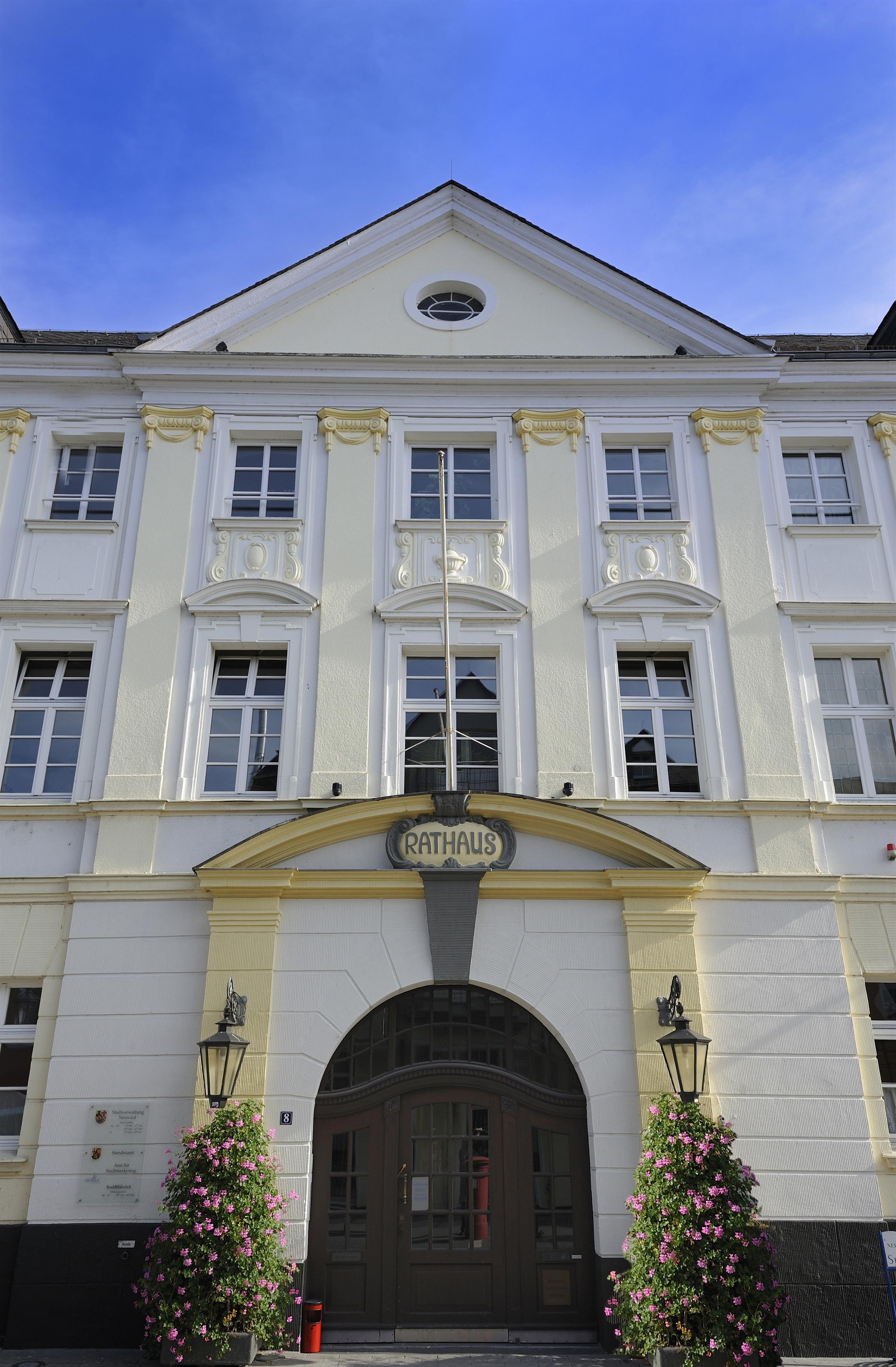 There has never been a town hall as a stately or even magnificent building in the center of Neuwied. The young town was too poor or perhaps too modest in the first difficult decades of its existence to afford something like that. Until the formation of the first magistrate in 1680/81, the count's government handled the town's affairs. Between 1699 and 1716, the first town hall was built on a "burned-out site" at the corner of Mittelstraße and Rheinstraße, which only differed from simple burgher houses by a particularly large wine cellar, a double flight of stairs, and double windows. This building came into private ownership around 1800. In 1811, the town acquired a larger corner house on Markt- and Engerser Straße directly across from the market church as a new "town, school, and watch house". In 1863, the house was replaced by a three-story new building.