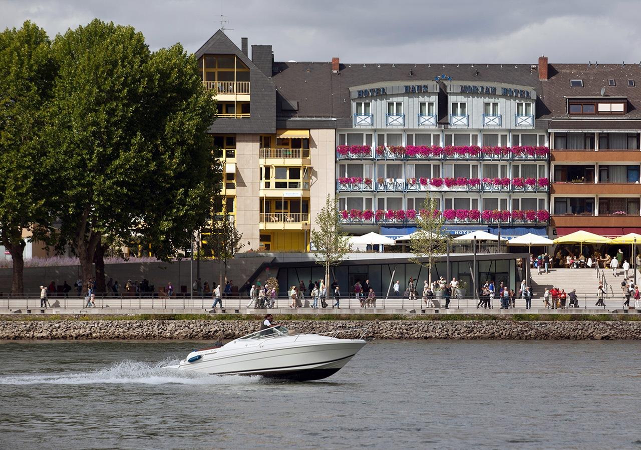 The Hotel Morjan in Koblenz is a privately run 3-star hotel with an excellent location right by the banks of the Rhine, just a few minutes' walk from the Deutsches Eck and the Ehrenbreitstein Fortress. It offers its guests a breathtaking view of the Rhine and the historical fortress, as well as comfortable rooms including family rooms with separate bedrooms and balconies overlooking the Rhine. The hotel is characterized by its family-oriented, personal service shaped by the long-standing family management. Guests are welcomed in the mornings with a rich breakfast buffet, and nearby Mediterranean restaurants invite for a pleasant stay. Free Wi-Fi, an eBike charging station, bicycle garages, and parking spaces are available, and the surrounding area is ideal for hiking and cycling. The hotel is a popular starting point for exploring the sights and the picturesque landscape of Koblenz.