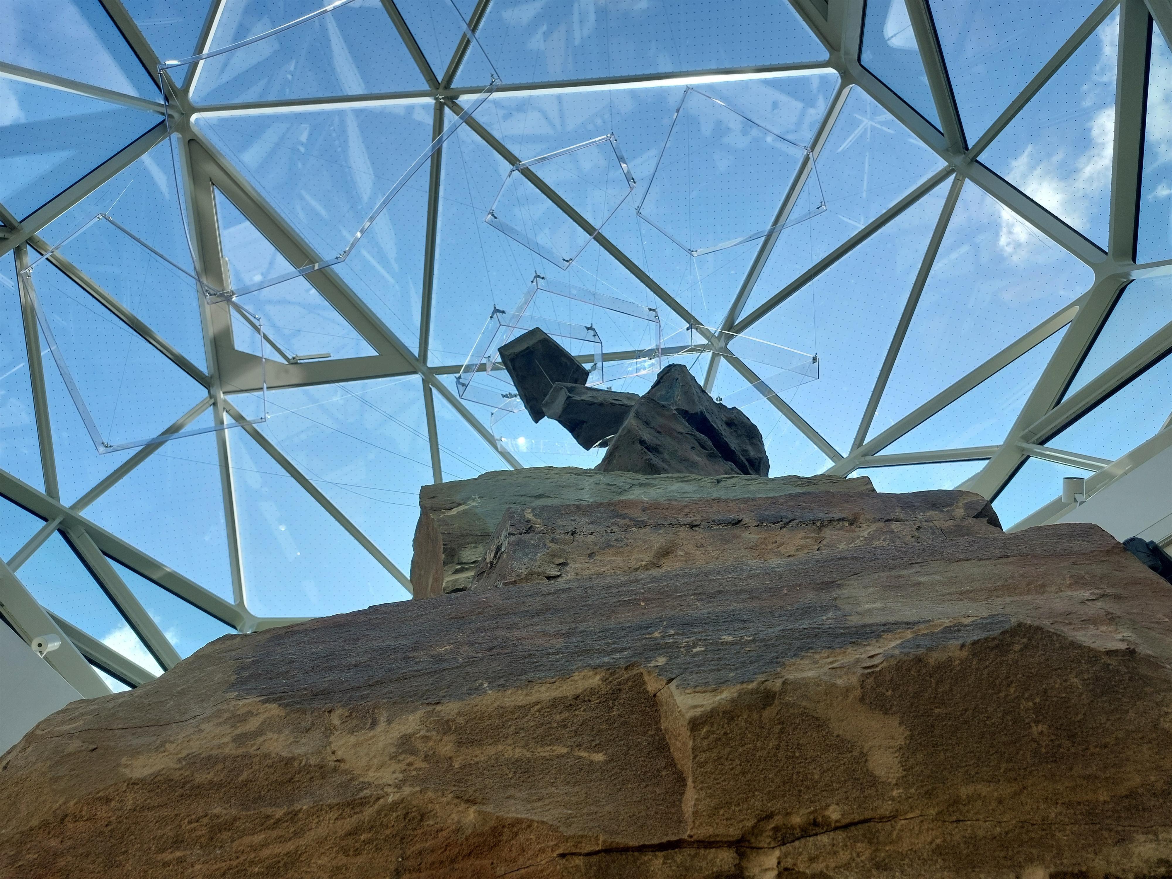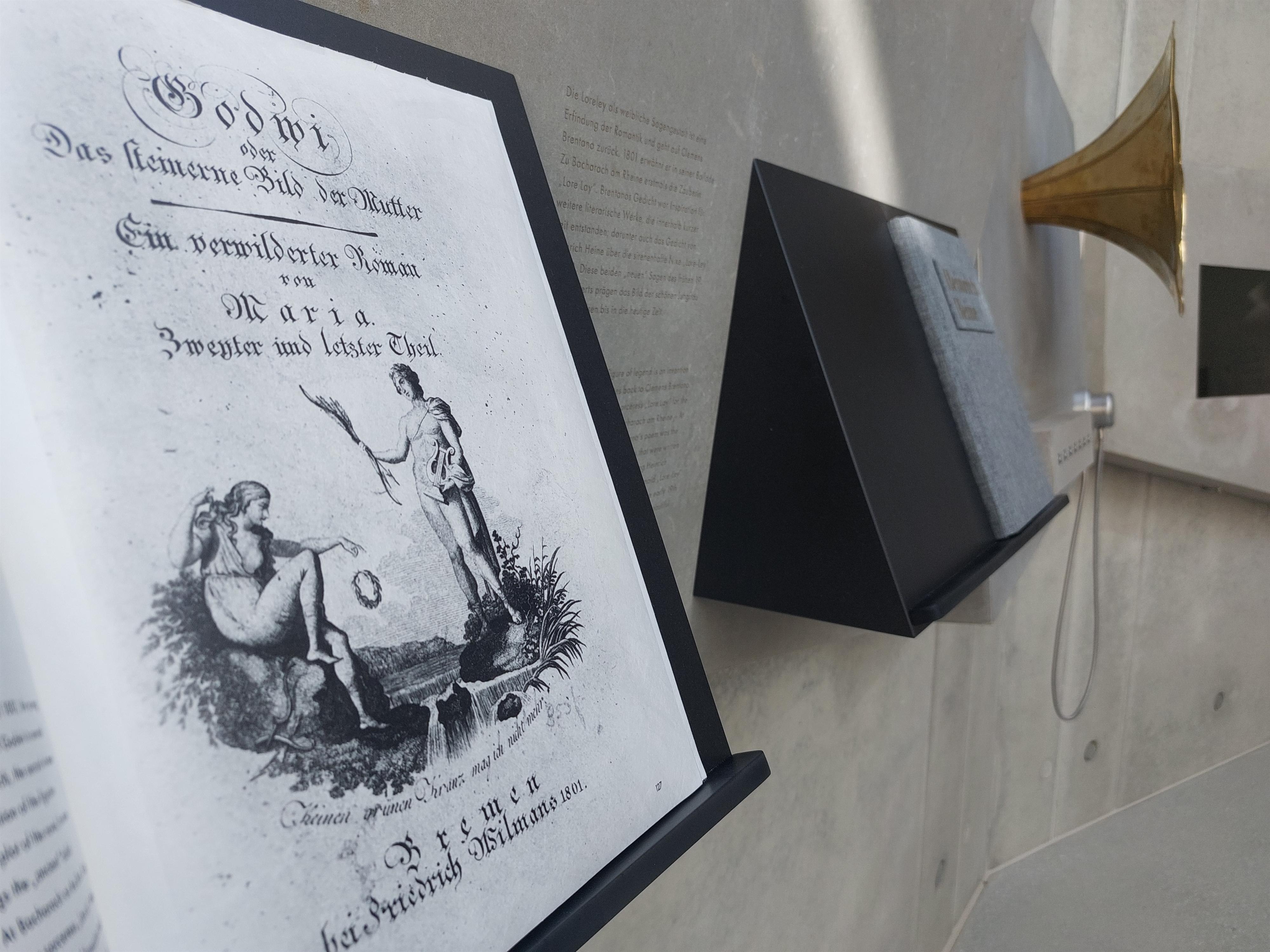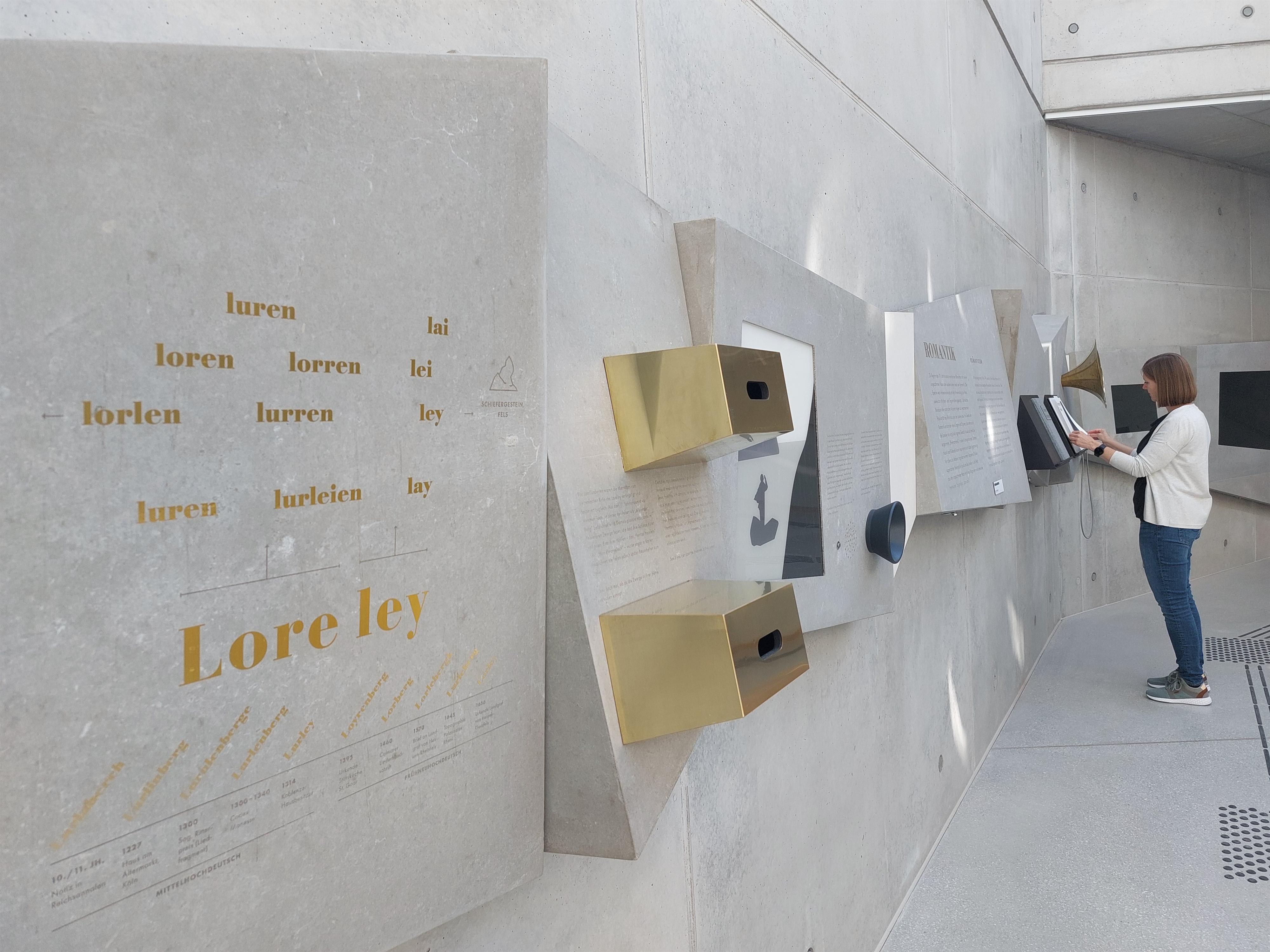 In the center of the Myth Hall stands a rock installation, which visualizes and makes the emergence and later mythologization of the Loreley rock emotionally tangible: A fragmenting rock formation rises from the ground, extending through the open ceiling of the exhibition hall into the above stylized Glass Rock. Stone transforms into glass, symbolically releasing the myths and secrets.
