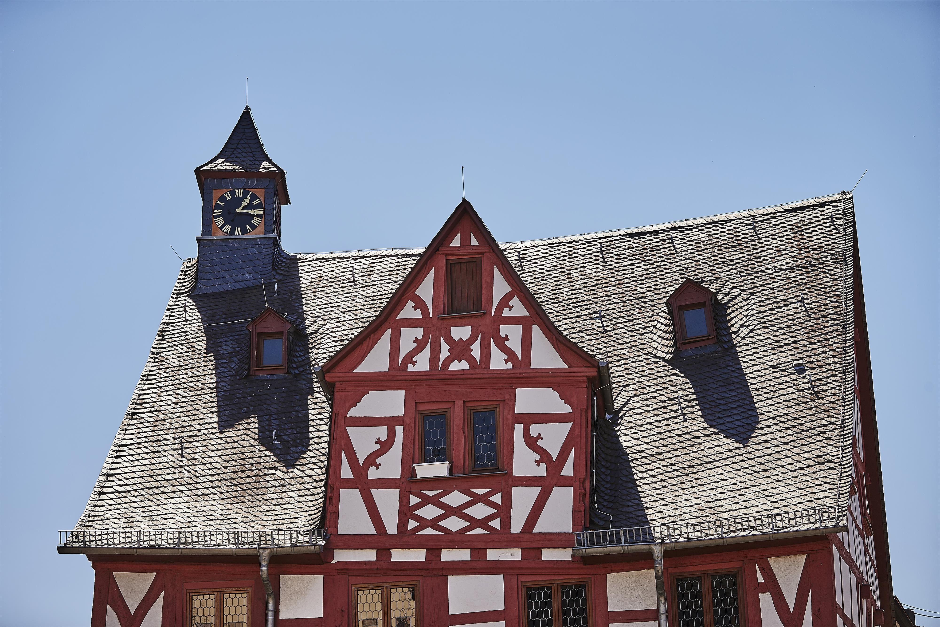 The rich latticework, supported by transverse braces - called the Wild Man - and the smaller angled braces, studded with nosings, protrude below the twice-divided gable. In the lintel under the round-arch hatch is the carved city coat of arms with the date 1709 (the year of construction of the gable's superstructure). The small slate ridge turret on the gable top houses a clock. The dwarf gable on Viehgasse varies the lattice decoration with curved diagonal struts and St Andrew's crosses.
