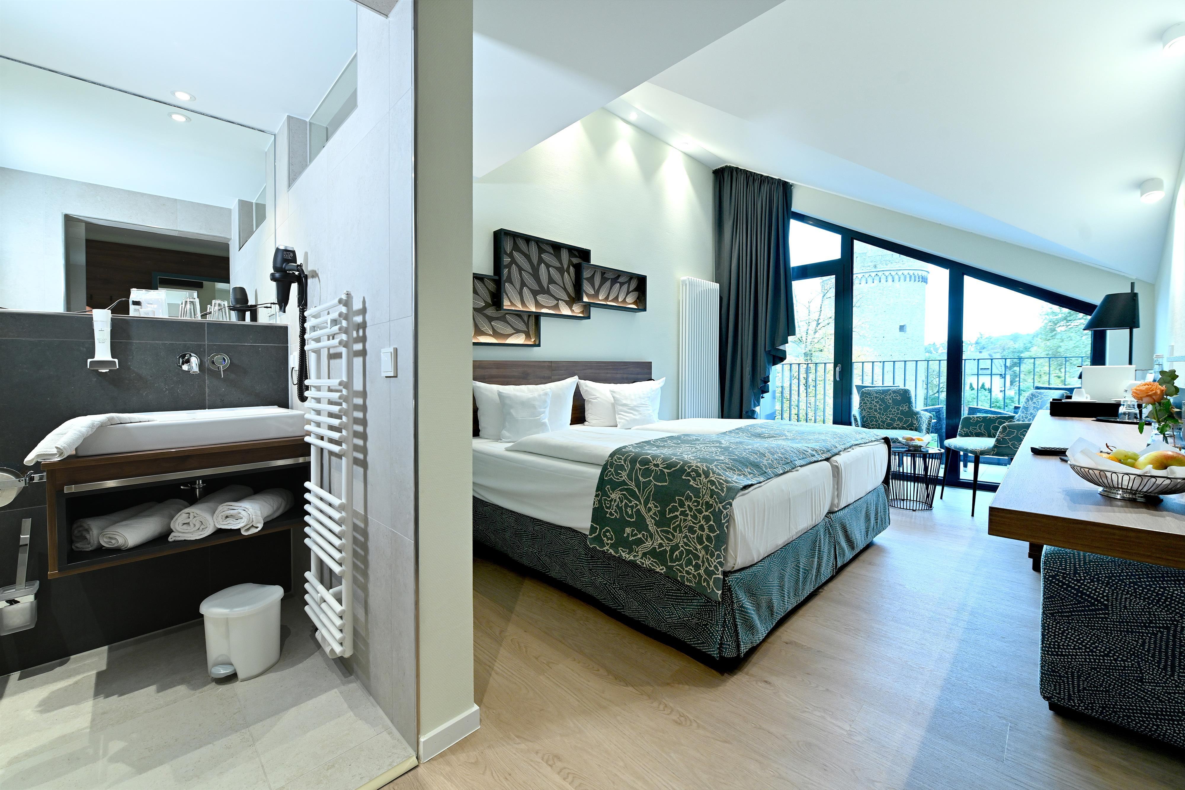 The 28 double and single rooms with balcony have shower and toilet, telephone, radio, TV, minibar, hair dryer, safe and DSL connection. Our modern and brightly designed gallery with an open fireplace and the restaurant "Am Schänzchen" welcome you with their fresh cuisine and an exclusive wine list. The menu card is based on local and international specialties. The ambience turns guests into friends.