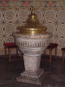The baptismal font in the Trinity Church in Weißenthurm was donated to the young parish in 1873 by the then mayor of the Bassenheim office in Weißenthurm, Hubert Hubaleck, on the occasion of the introduction of the first pastor of Weißenthurm. Originally, the baptismal font was in the Liebfrauenkirche in Koblenz. Among others, Prince Metternich, who became famous through the Congress of Vienna, was baptised at it. In the book "Kunstdenkmäler der Rheinprovinz" (Art Monuments of the Rhine Province), 1785 is given as the year of acquisition of the baptismal font.
