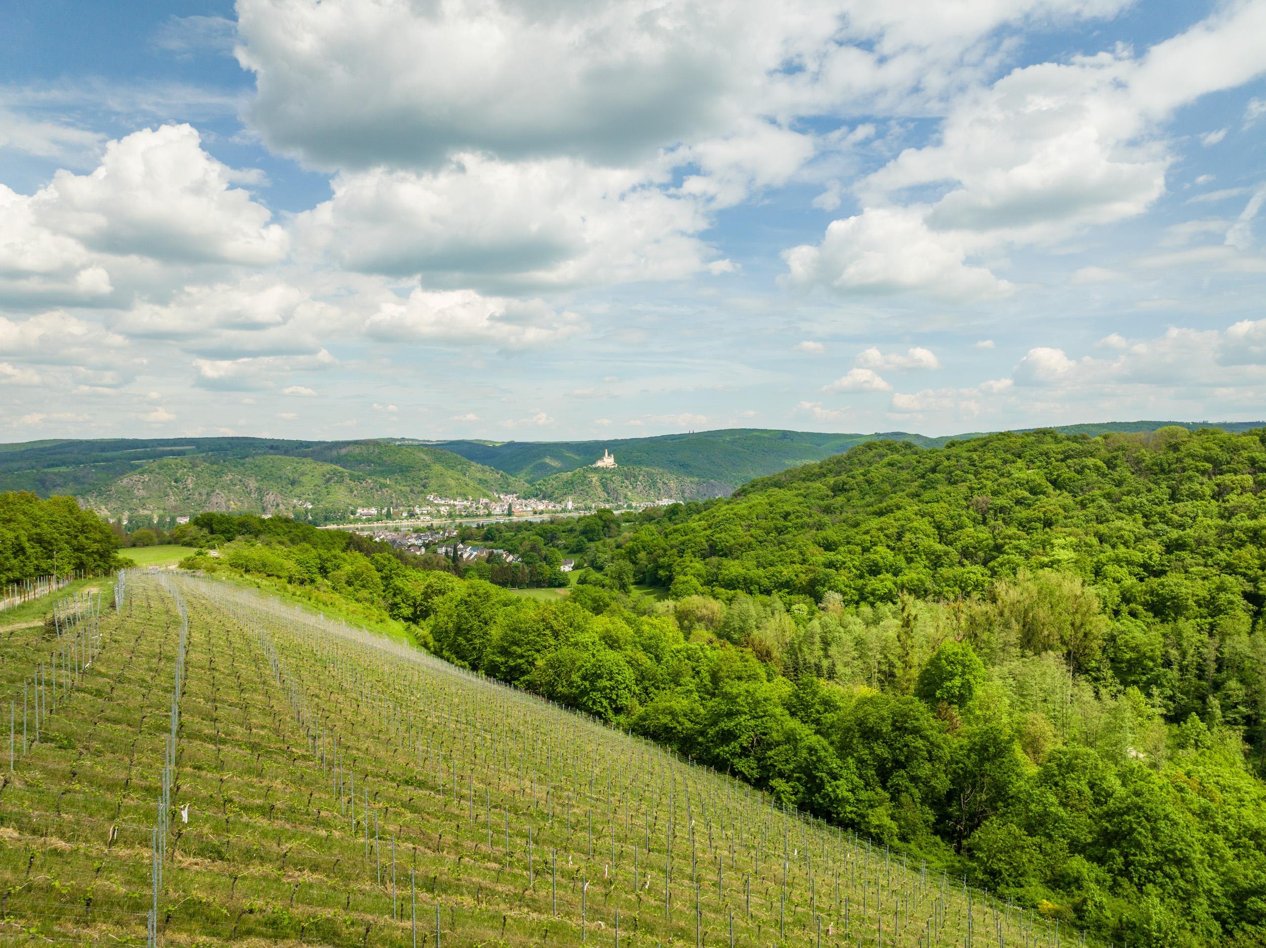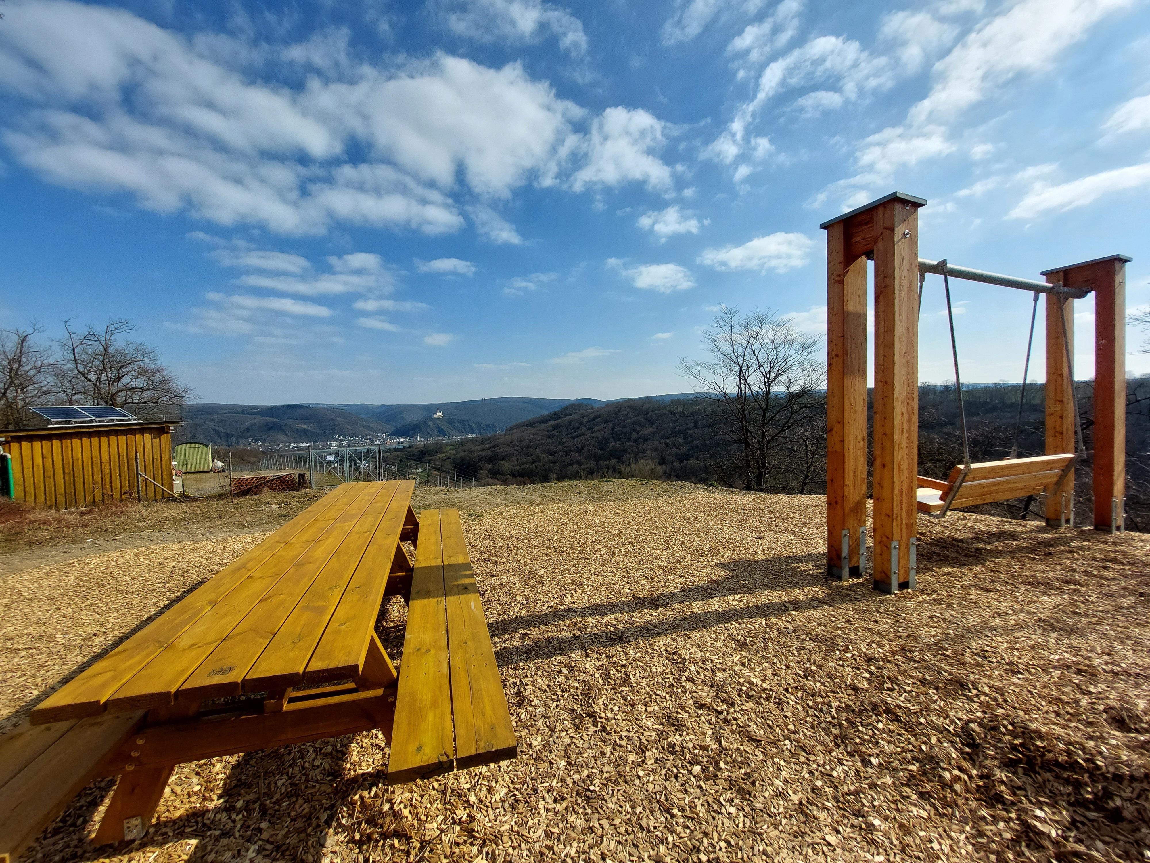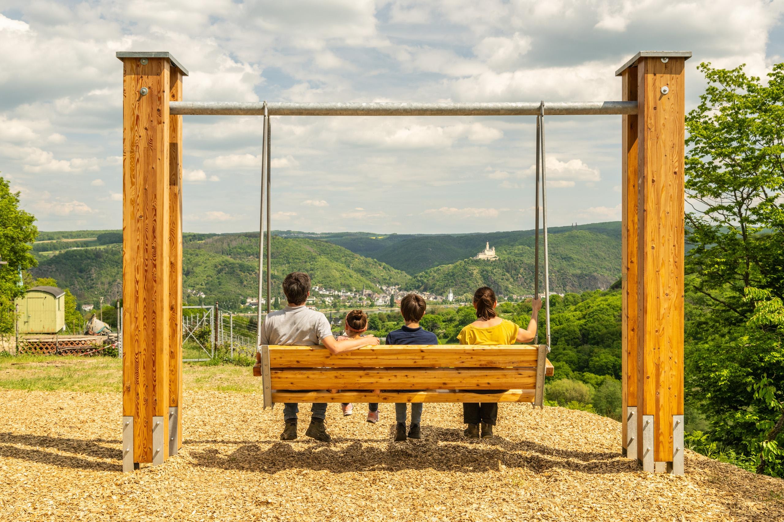 The vineyard-swing with backrest offers a relaxing rest with a fantastic view of the Rhine, the vineyards and Marksburg Castle. Near the swing there is also a wooden relaxation lounger with space for two people.