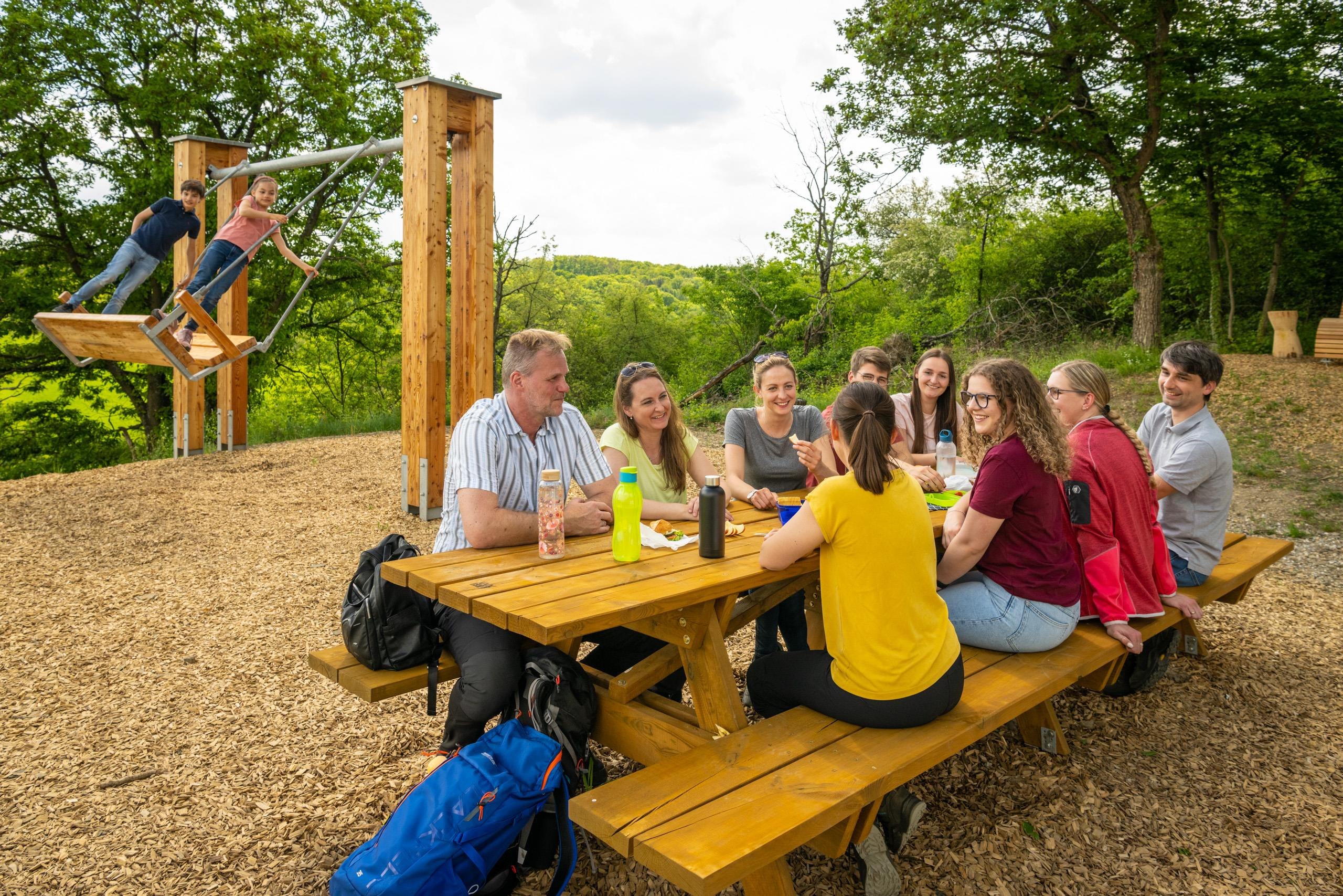 A long picnic bench with table offers space for up to 12 people and allows for a relaxing rest with wonderful views.