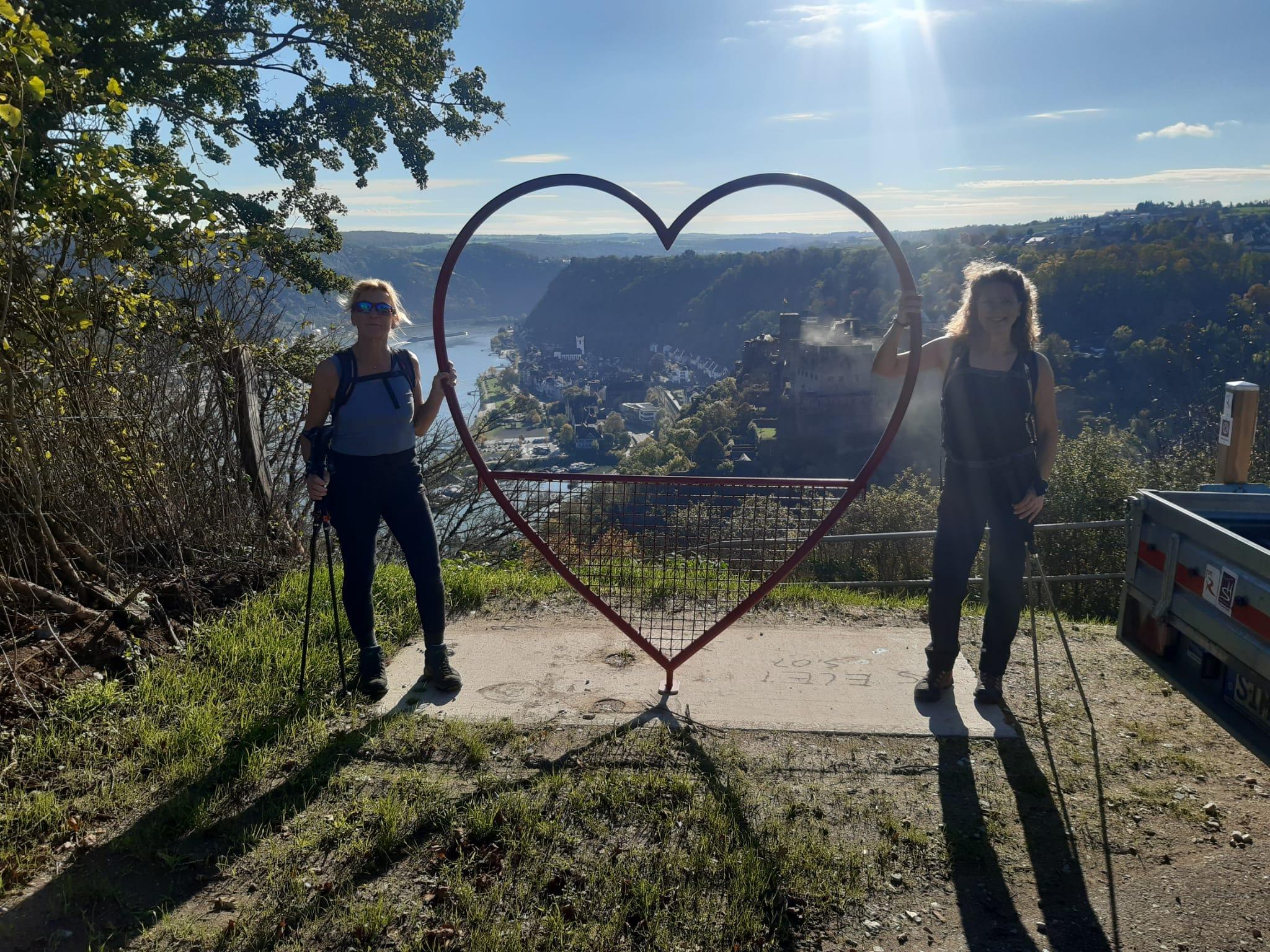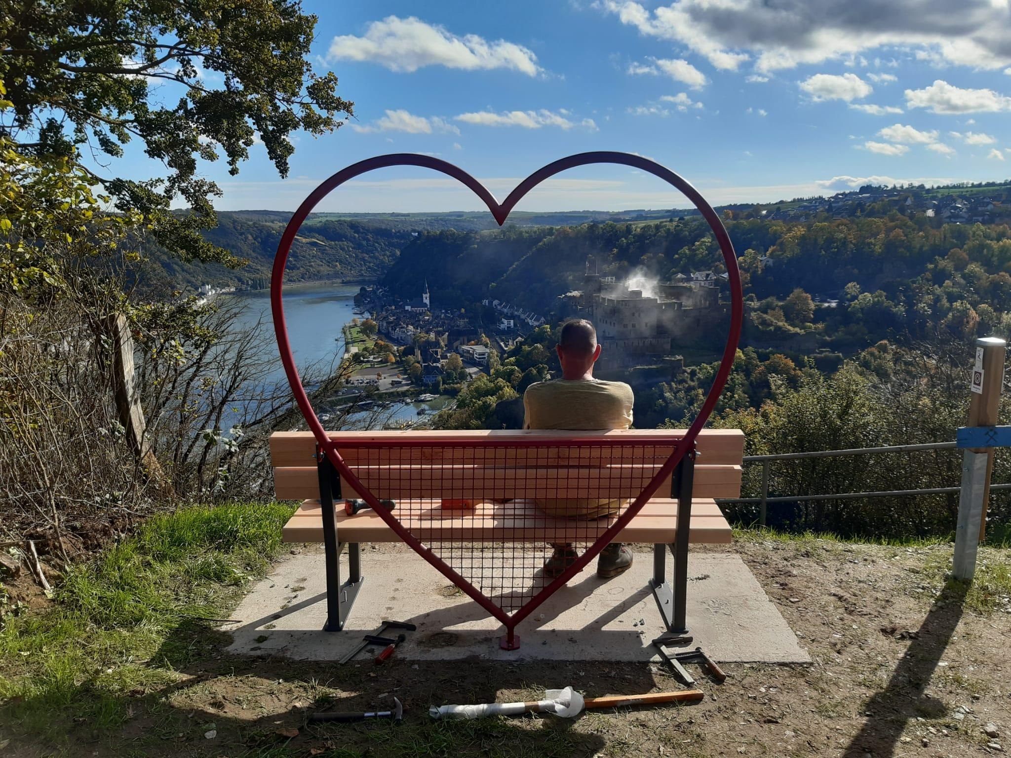 Rheinfels-Herz” bench with a fantastic view of the Middle Rhine and Rheinfels Castle.