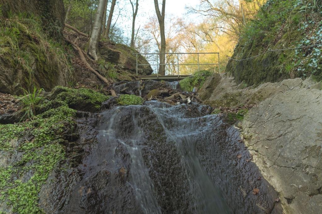 The nature lover and railway telegraphist Theodor Zais made the inaccessible places passable with bridges, stairs, and ropes from 1910 to 1912. A stone plaque built into the rock in the middle of the rocky gorge commemorates the developer of the gorge. Since 1936, the 11.6 hectares with creek and gorge forest have been a nature reserve.