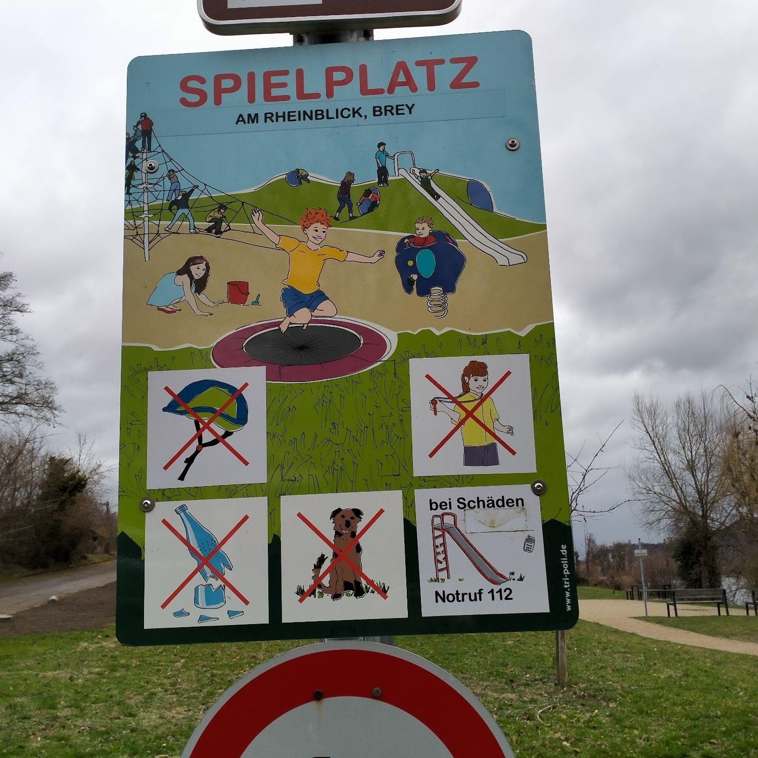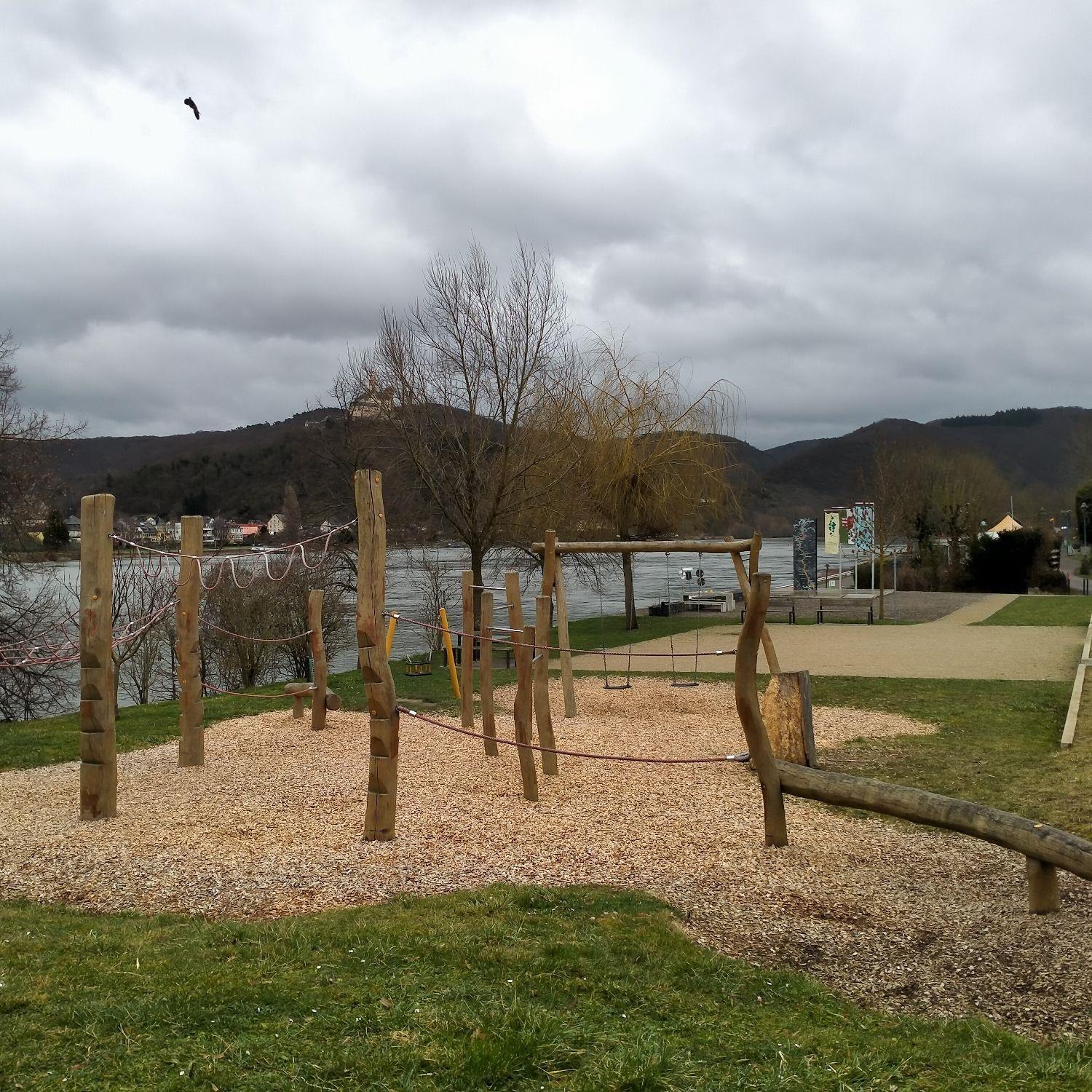 Playground at the Rhine Column with play equipment and a seating area offering a view of the Marksburg and the Rhine Valley.